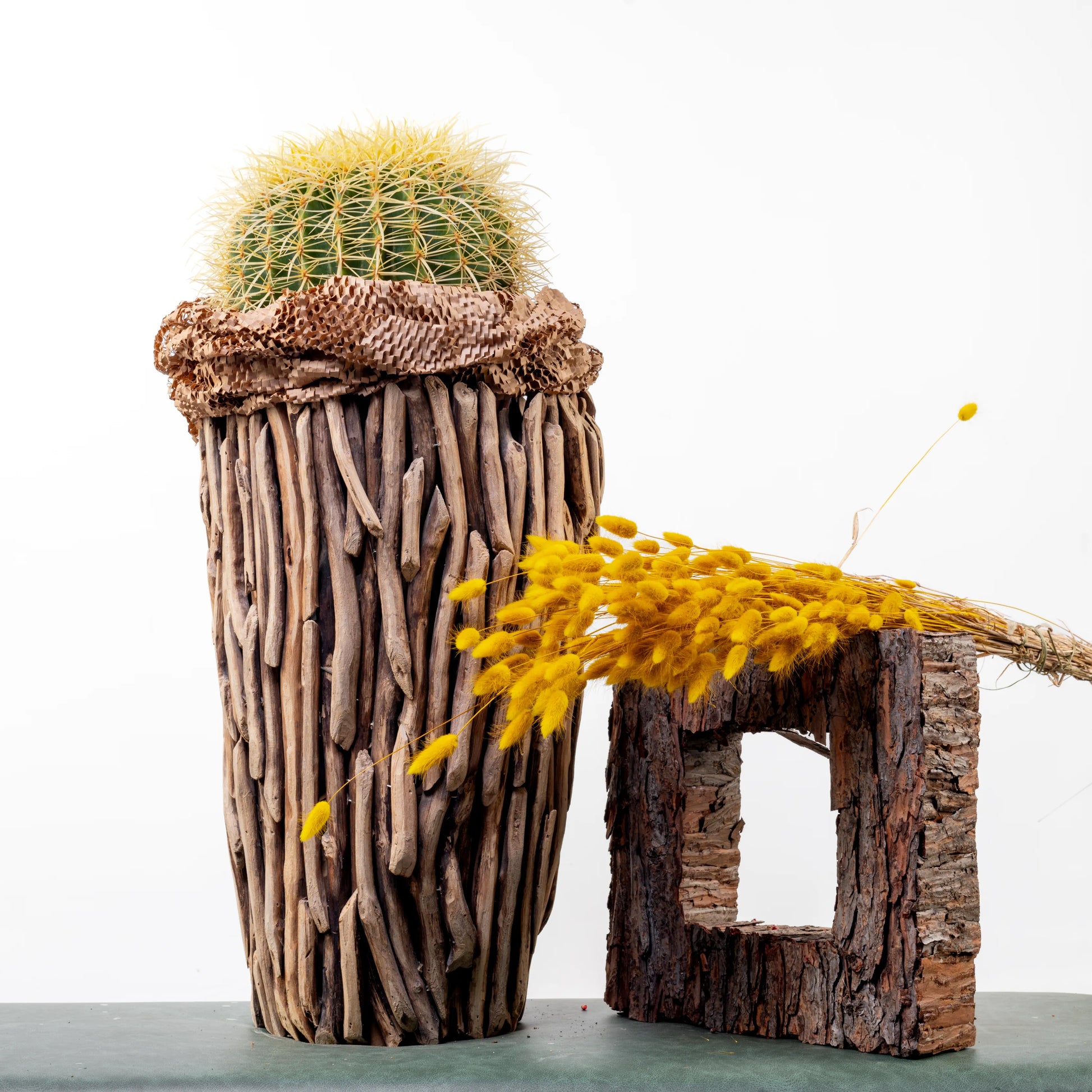 De origem mexicana, o Echinocactus grusonii, mais conhecido na cultura portuguesa como cacto ouriço, é um cacto redondo em tons de verde e amarelo com numerosos espinhos.