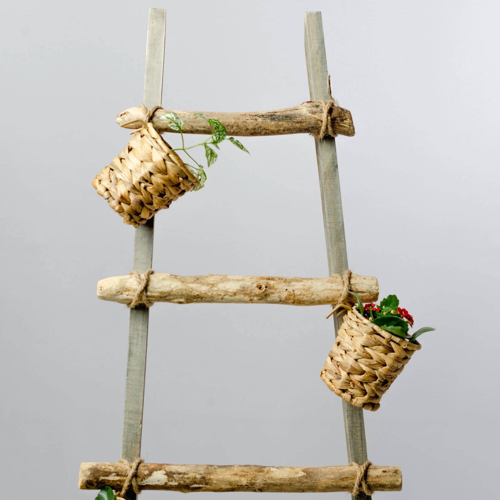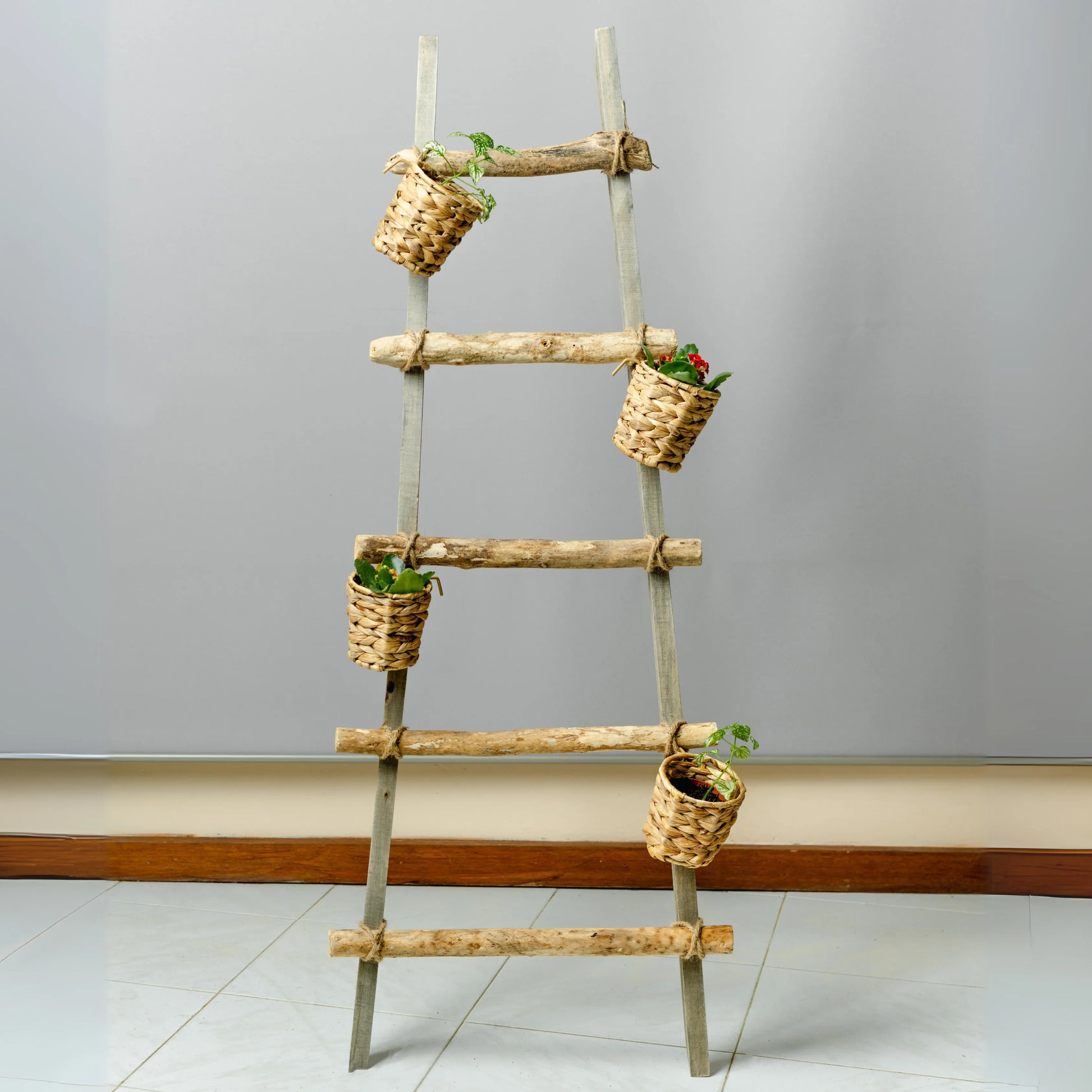 Dê um toque de rusticidade e natureza ao seu ambiente com este escadote natural decorativo, equipado com 5 vasos de palha para pendurar. Feito de madeira natural, o escadote possui um design simples e charmoso, que combina perfeitamente com a textura orgânica dos vasos de palha. Cada vaso suspenso é ideal para acomodar pequenas plantas, flores ou ervas, criando um mini jardim vertical que traz frescor e vida a qualquer espaço. Perfeito para varandas, cozinhas, salas de estar ou áreas externas, este escadote não só economiza espaço, mas também proporciona uma maneira criativa e ecológica de integrar o verde na decoração de sua casa, com um toque rústico e acolhedor.