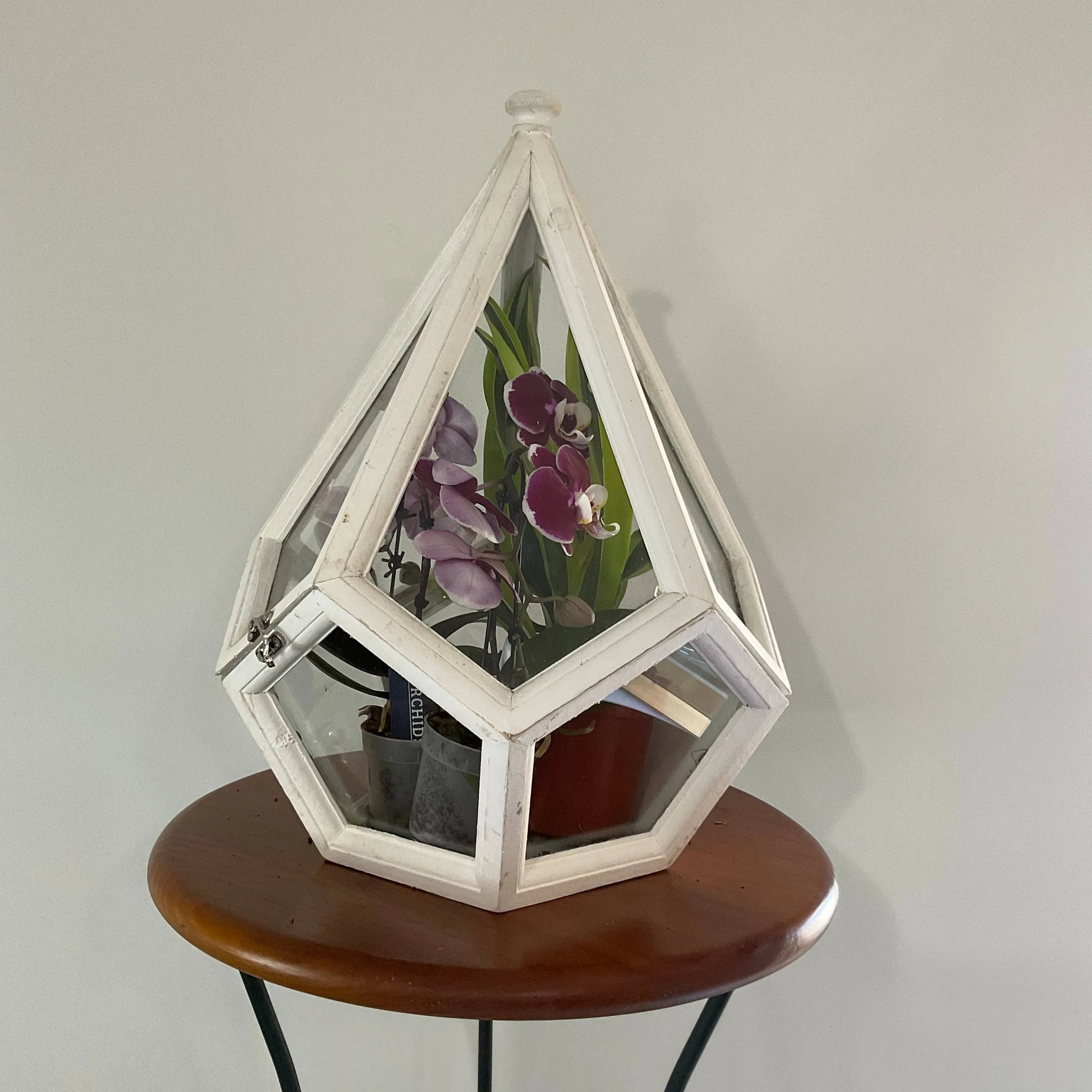 Uma peça que une arte, elegância e natureza viva. O Jardim Singular é uma escultura delicada em metal com vidros em formas geométricas de cone, onde florescem orquídeas roxas — intensas, exóticas e cheias de presença.