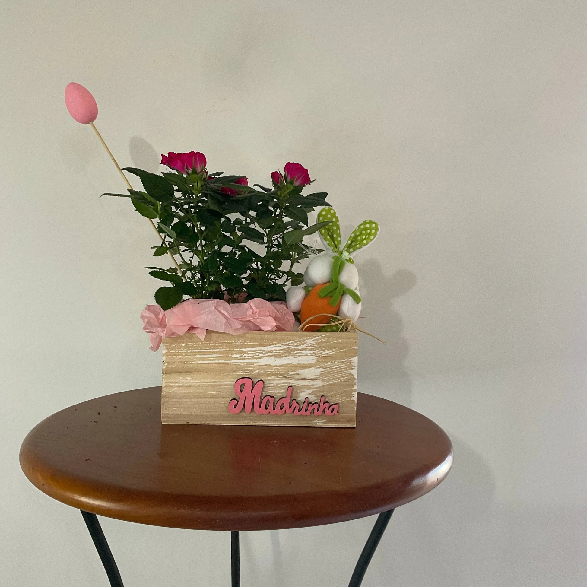 Um mimo cheio de carinho, pensado especialmente para a madrinha que merece tudo. Esta caixinha em madeira com acabamento rústico inclui um vaso de mini rosas cor-de-rosa vibrantes, símbolo de amor, ternura e gratidão.