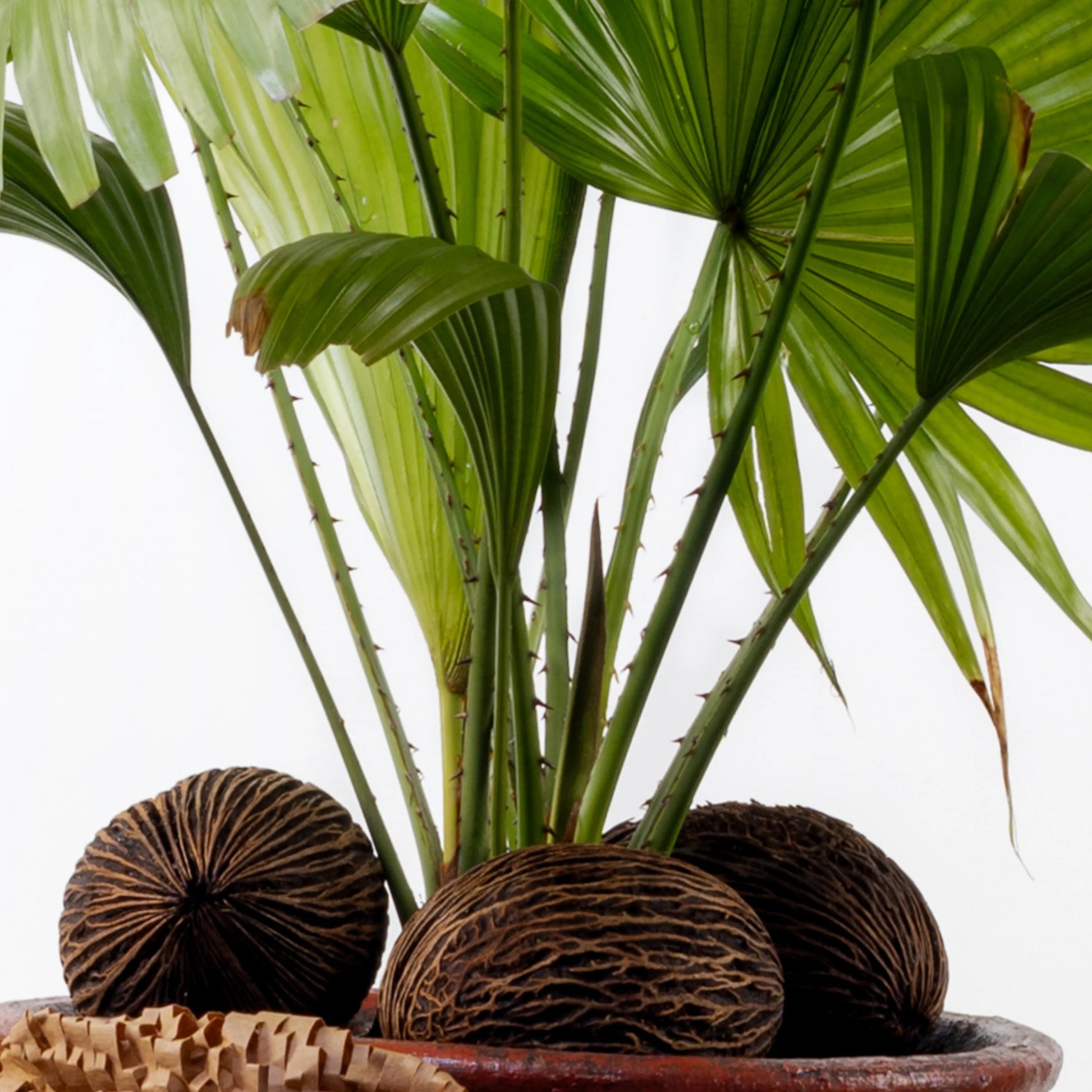 A Livistona ( palmeira-leque) ou livistona nitida é uma planta impressionante que apresenta um tronco robusto e uma coroa de folhas verdes brilhantes e azuladas. Suas grandes folhas circulares com pontas divididas criam um efeito de cascata, realçando seu apelo ornamental. Prosperando em climas subtropicais, a livistona nitida exibe resiliência e adaptabilidade, frequentemente encontrada em paisagens urbanas e jardins onde pode atingir alturas impressionantes, adicionando interesse vertical e sombra.