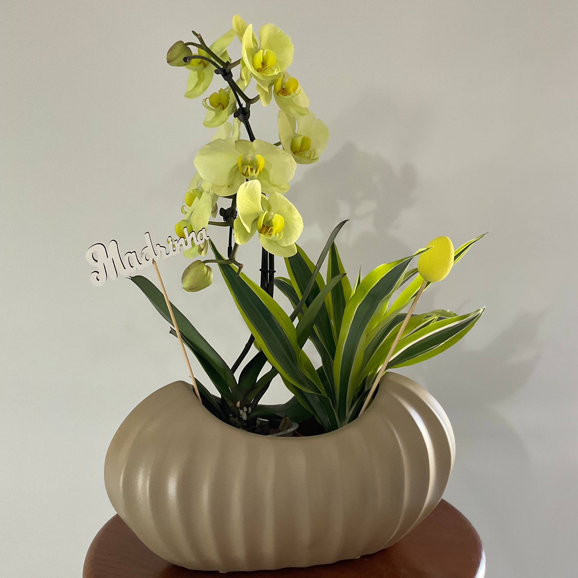 Num elegante vaso de tamanho médio, em tom bege suave, uma orquídea de cor limão desabrocha com graciosidade, acompanhada por uma planta verde vibrante que adiciona frescura e equilíbrio ao conjunto. Este arranjo celebra a madrinha que ilumina os nossos dias com a sua presença, transmitindo serenidade e beleza em cada gesto. Ideal para quem merece um presente simples, mas repleto de significado e elegância. Tamanho S