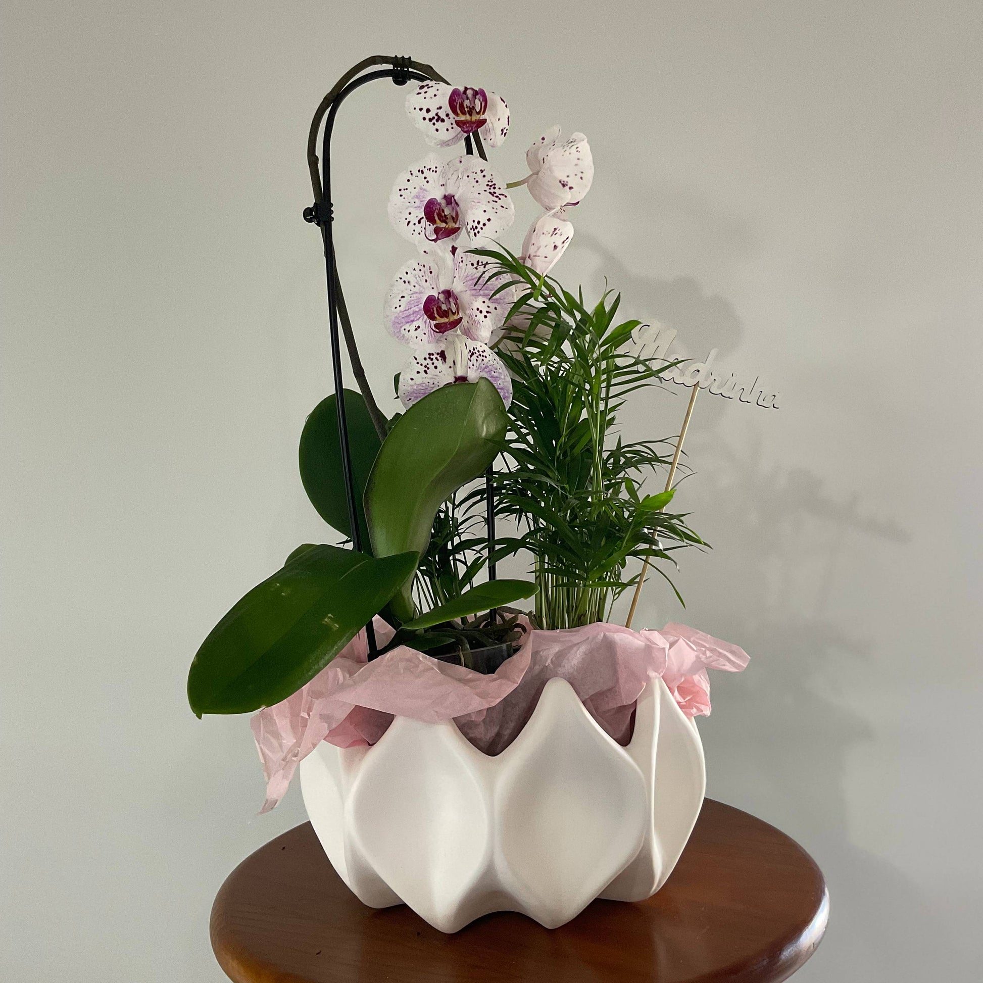 Uma orquídea matizada em branco e roxo floresce com graça num vaso de cerâmica branca, de tamanho pequeno, com acabamento em bicos que lhe dá um toque artesanal e elegante. Um gesto subtil, mas cheio de charme, ideal para oferecer à madrinha que valoriza a beleza dos pequenos momentos e o carinho nos detalhes. Tamanho L