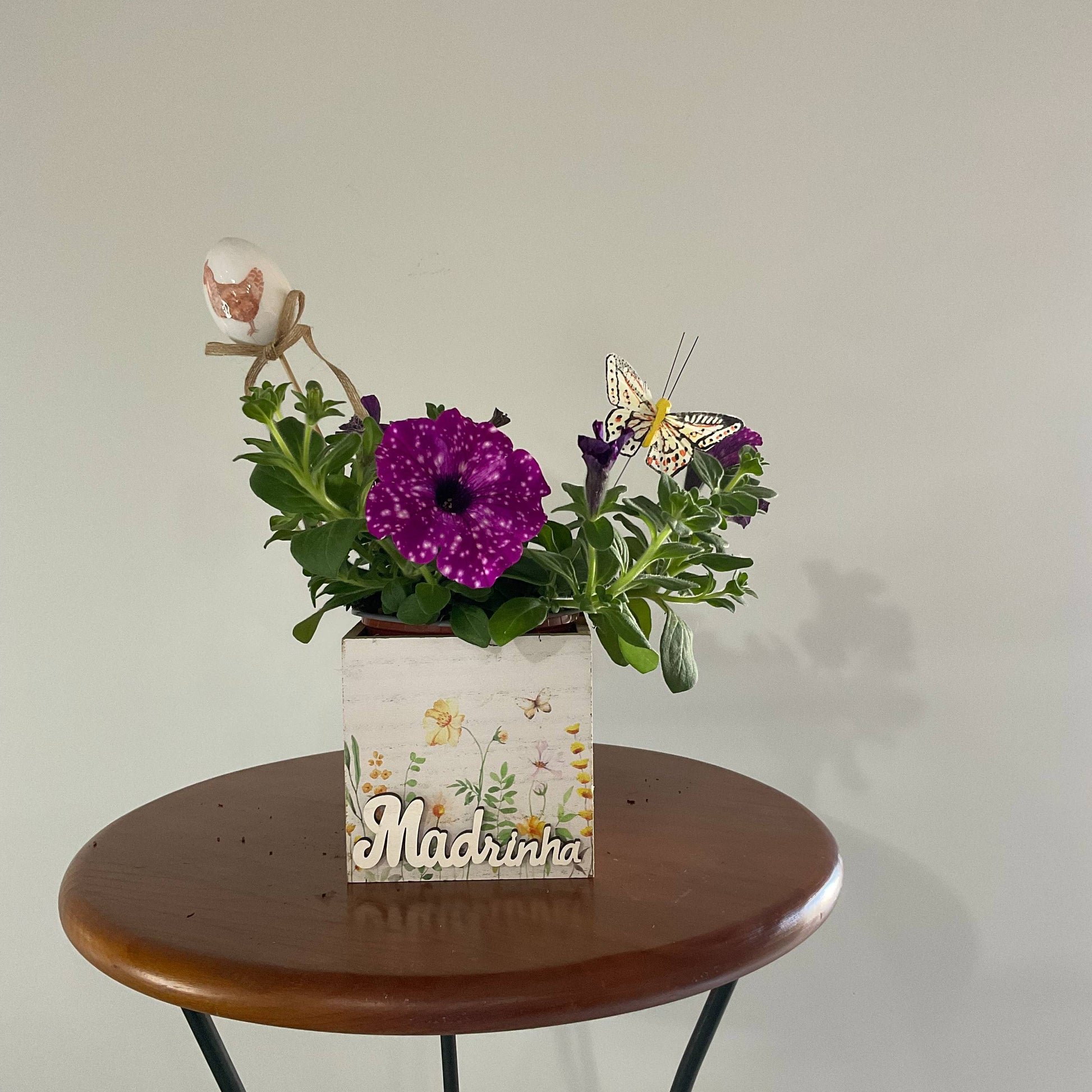 Numa charmosa caixa de madeira de formato quadrado, desabrocha uma petúnia vibrante, cheia de cor e alegria, acompanhada por delicadas borboletas decorativas que parecem dançar entre as flores. Um arranjo luminoso e poético, perfeito para oferecer à madrinha que enche os dias de beleza, liberdade e ternura.