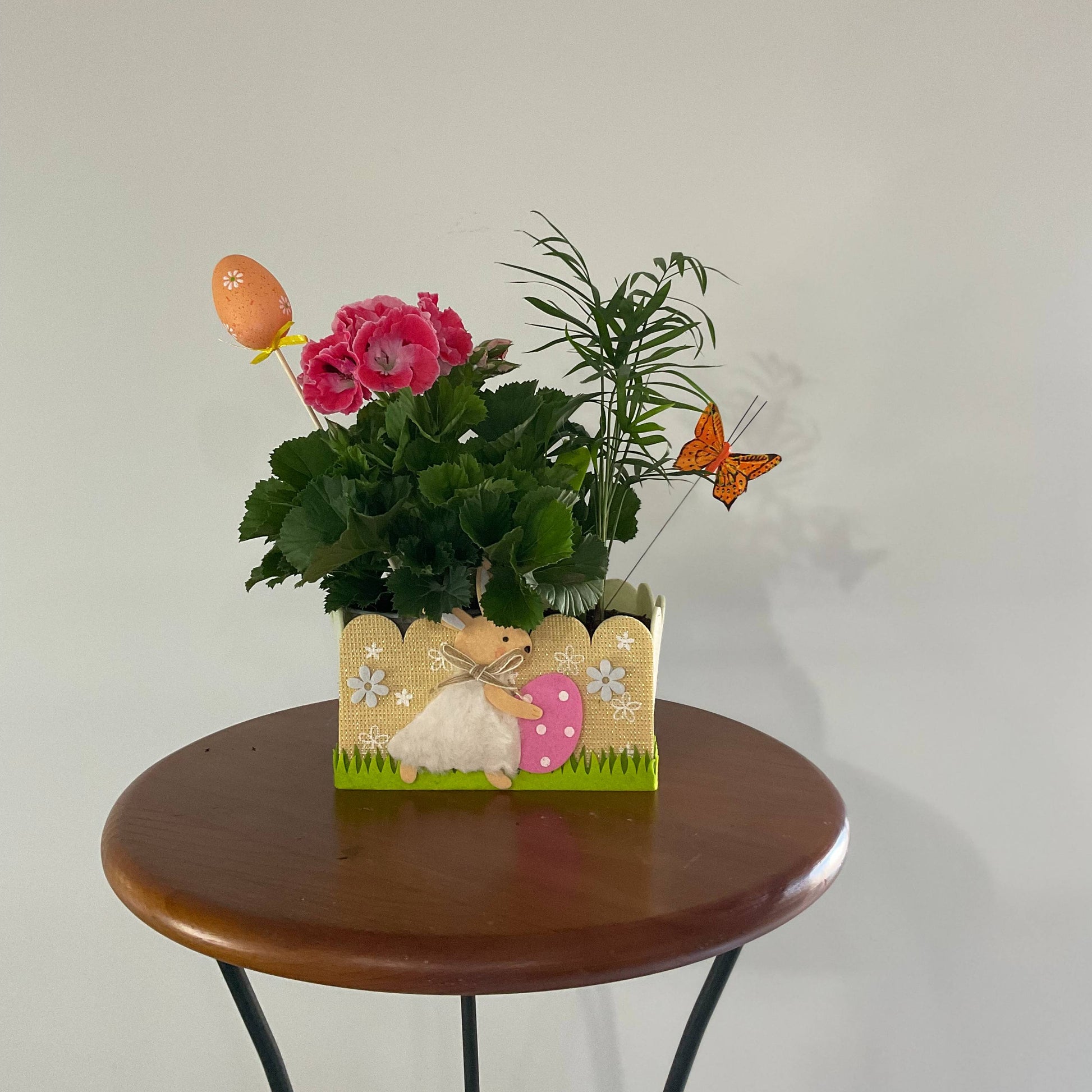 Numa delicada caixa de tecido, decorada com a imagem encantadora de uma coelhinha da Páscoa com o seu ovo, cresce um pequeno jardim: uma planta verde vibrante e uma planta em flor partilham espaço com harmonia e ternura. Uma prenda cheia de cor e simbolismo, perfeita para oferecer à madrinha que aquece o coração como os primeiros raios de sol da primavera.