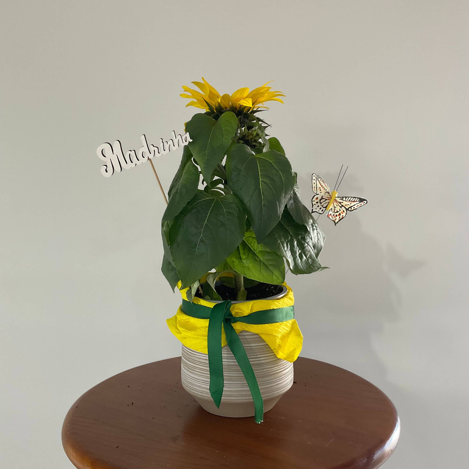 Num vaso de cerâmica, simples e elegante, ergue-se um girassol cheio de cor e vitalidade, acompanhado por delicadas borboletas decorativas que parecem dançar à sua volta. Um arranjo alegre e simbólico, ideal para a madrinha que é fonte de luz, calor e inspiração. Um gesto de carinho para agradecer tudo o que ela representa.