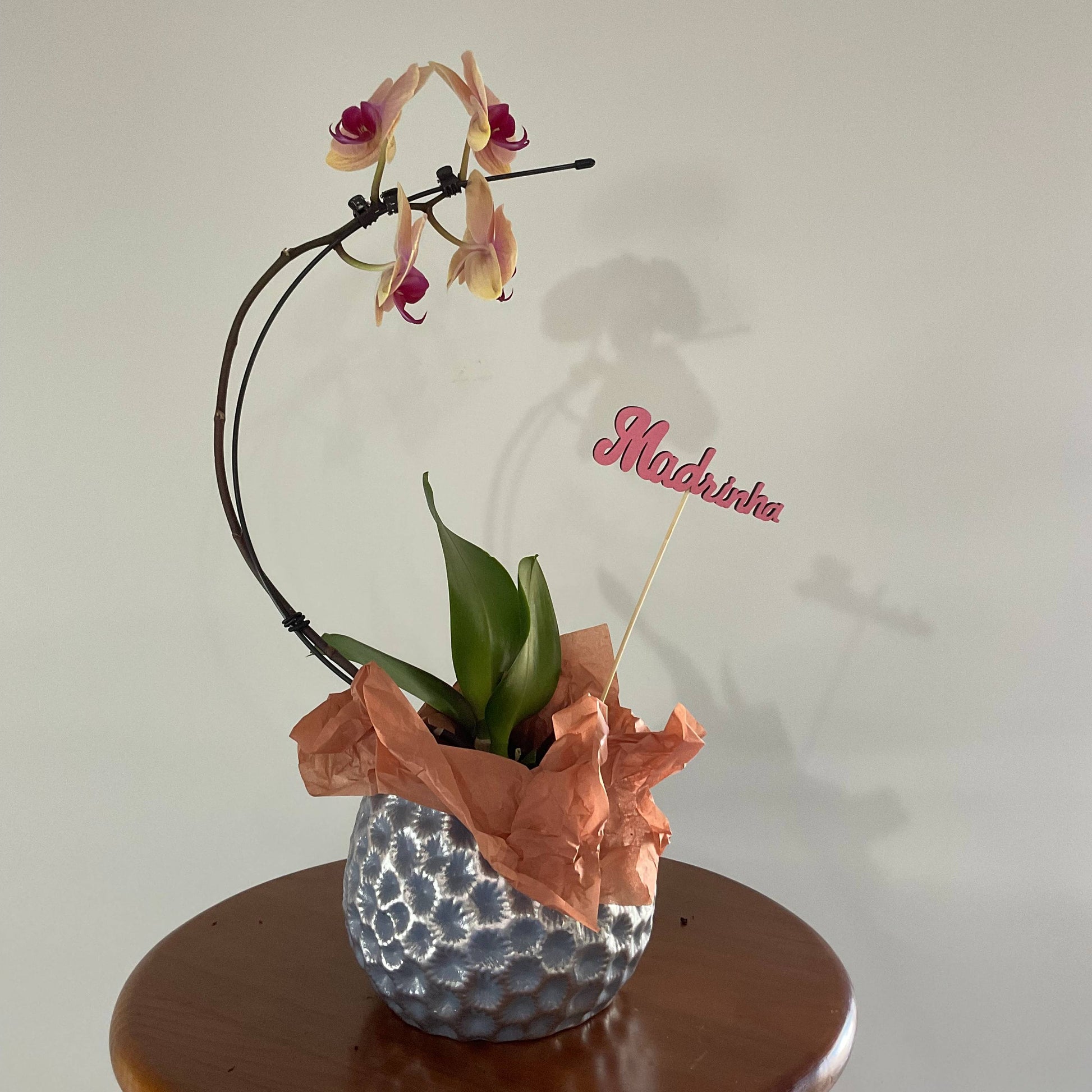 Num elegante vaso de cerâmica azul claro, floresce uma orquídea de tom pêssego suave, irradiando elegância e serenidade. Este arranjo, com suas cores delicadas e formas graciosas, é o presente perfeito para a madrinha que traz paz e amor ao nosso mundo, como um abraço reconfortante em cada gesto. Um tributo simples, mas profundo, à sua presença única.