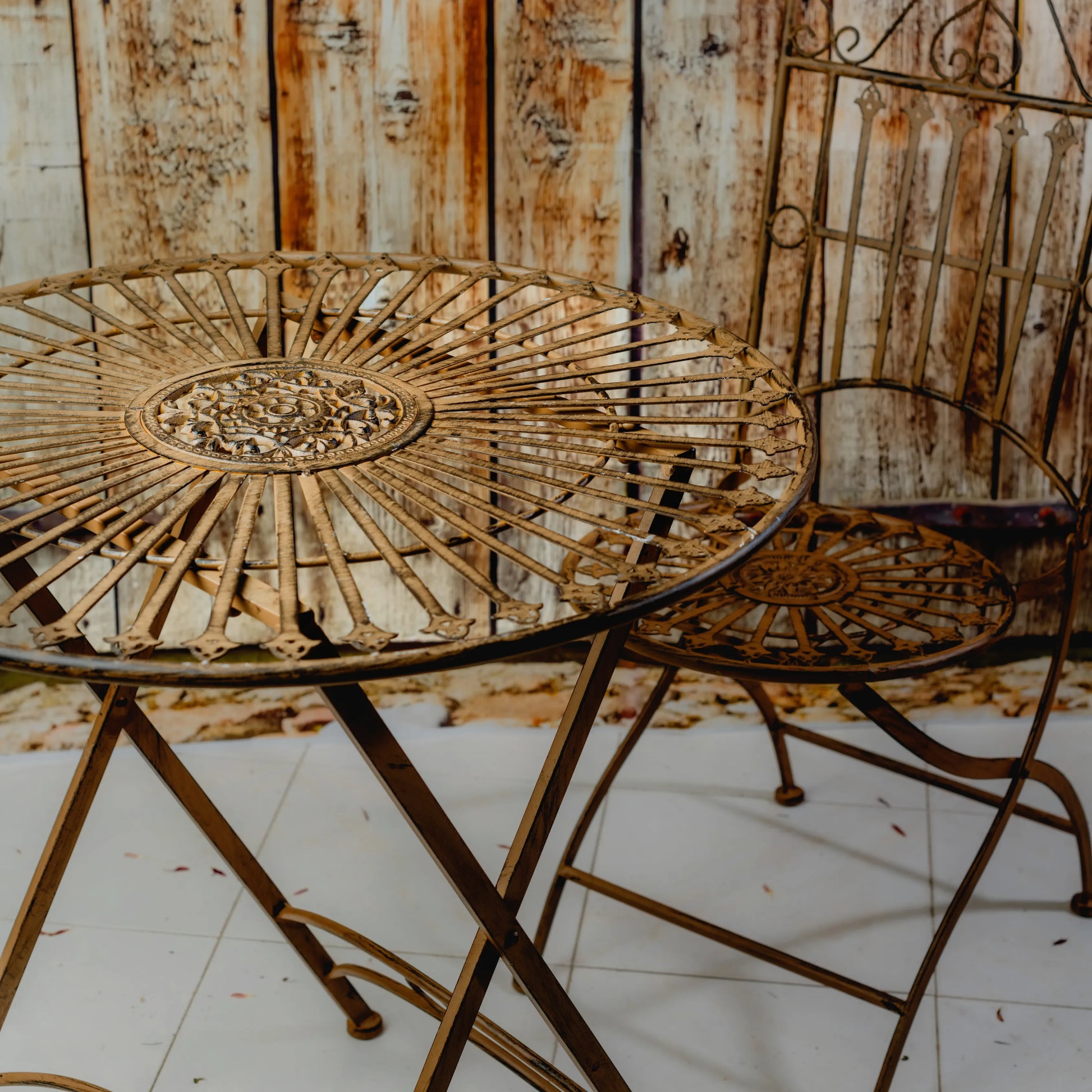 Com um visual autêntico e charmoso, esta mesa redonda de jardim feita de metal com acabamento em ferrugem traz o encanto do estilo vintage ao seu espaço exterior. Sua superfície envelhecida, com detalhes desgastados pelo tempo, evoca uma atmosfera rústica e nostálgica, ideal para jardins, varandas ou terraços. A estrutura metálica robusta e os detalhes ornamentais dão à mesa uma aparência clássica, enquanto a ferrugem natural adiciona caráter e personalidade, como se fosse uma peça que já fez parte de muitos encontros ao ar livre. Perfeita para criar um ambiente aconchegante e romântico, esta mesa é uma peça central que combina funcionalidade e beleza.