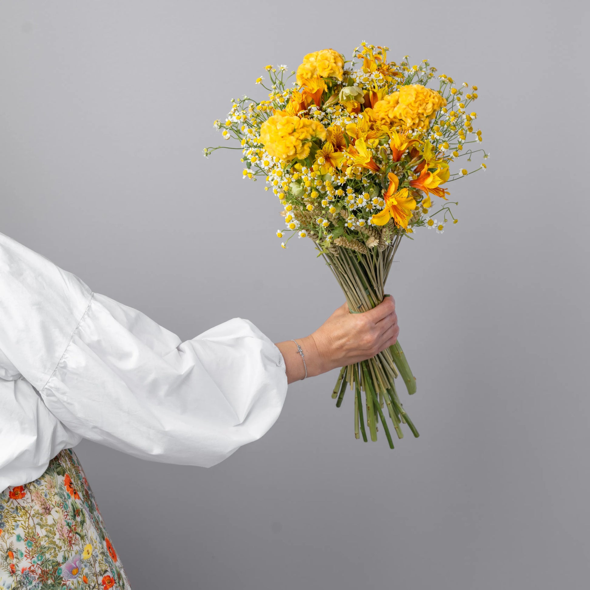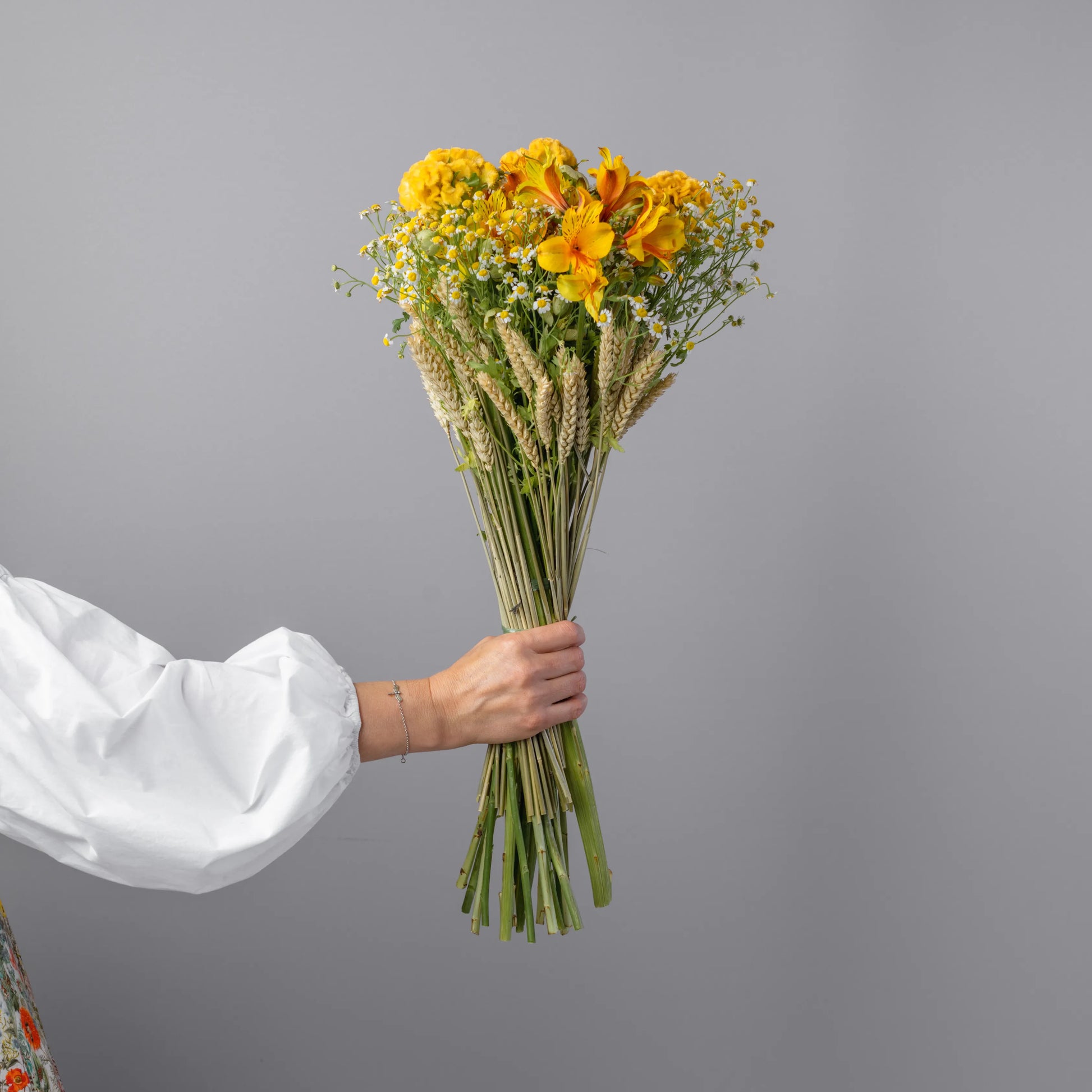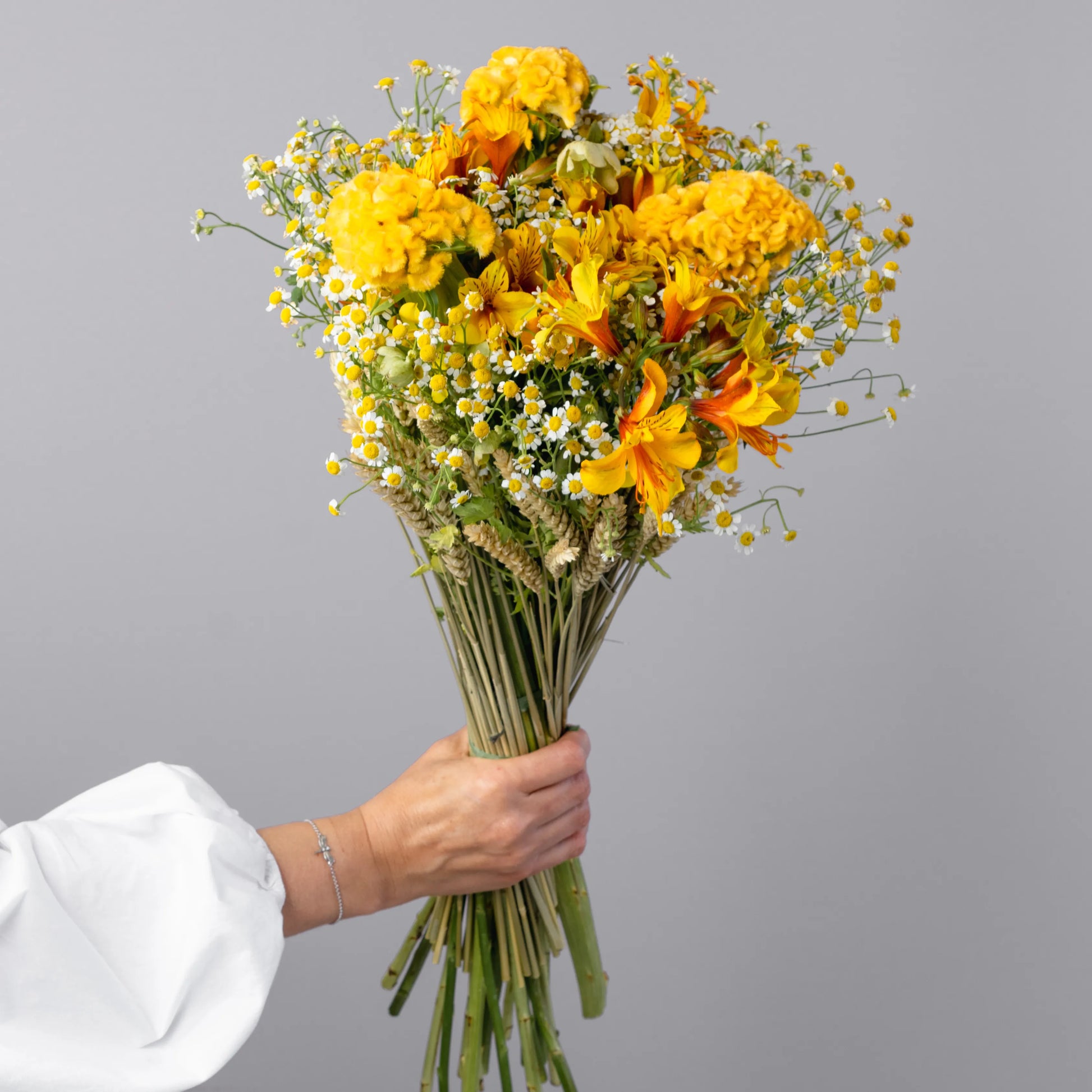 O ramo “Campo Dourado” é a personificação da luz solar e do calor de um dia de verão. As vibrantes celósias e alstroemérias amarelas trazem alegria e brilho à composição, enquanto o delicado tanaçeto (margaridas do campo) adiciona um toque de simplicidade e frescor natural. As espigas de painço conferem ao ramo uma sensação de aconchego e rusticidade, lembrando os campos dourados ao pôr do sol. “Campo Dourado” é a escolha perfeita para quem deseja trazer o calor da natureza para casa e transmitir seus sentimentos calorosos.