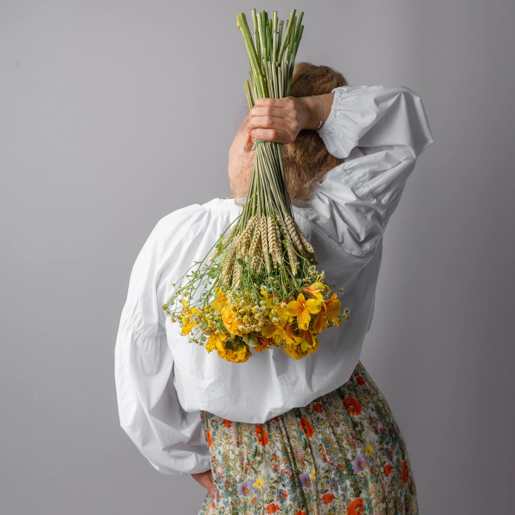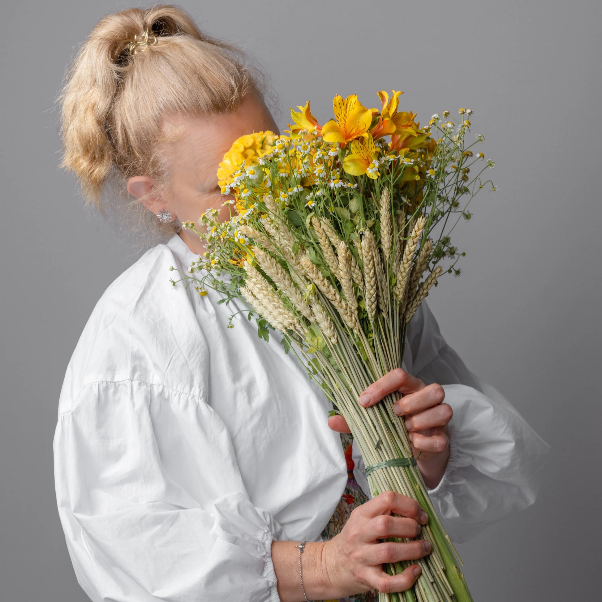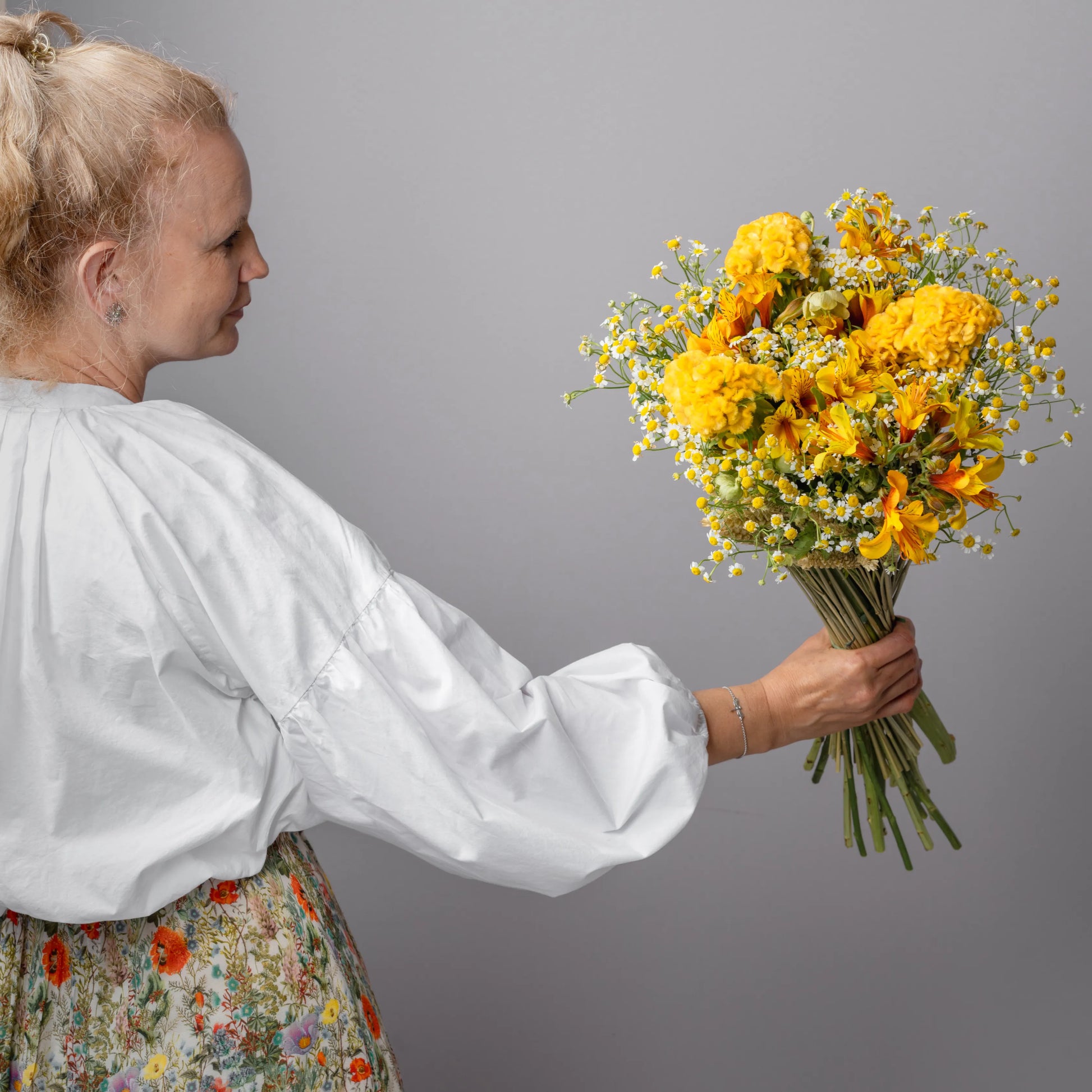 O ramo “Campo Dourado” é a personificação da luz solar e do calor de um dia de verão. As vibrantes celósias e alstroemérias amarelas trazem alegria e brilho à composição, enquanto o delicado tanaçeto (margaridas do campo) adiciona um toque de simplicidade e frescor natural. As espigas de painço conferem ao ramo uma sensação de aconchego e rusticidade, lembrando os campos dourados ao pôr do sol. “Campo Dourado” é a escolha perfeita para quem deseja trazer o calor da natureza para casa e transmitir seus sentimentos calorosos.