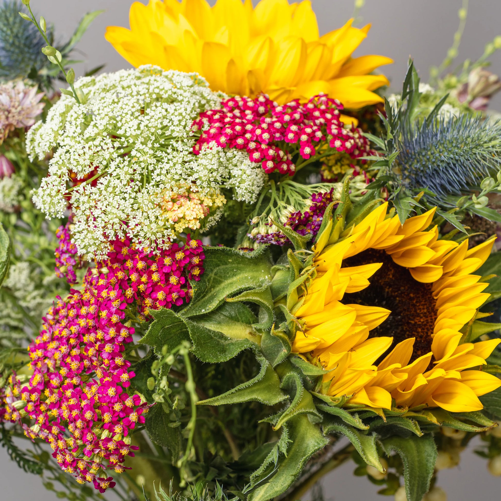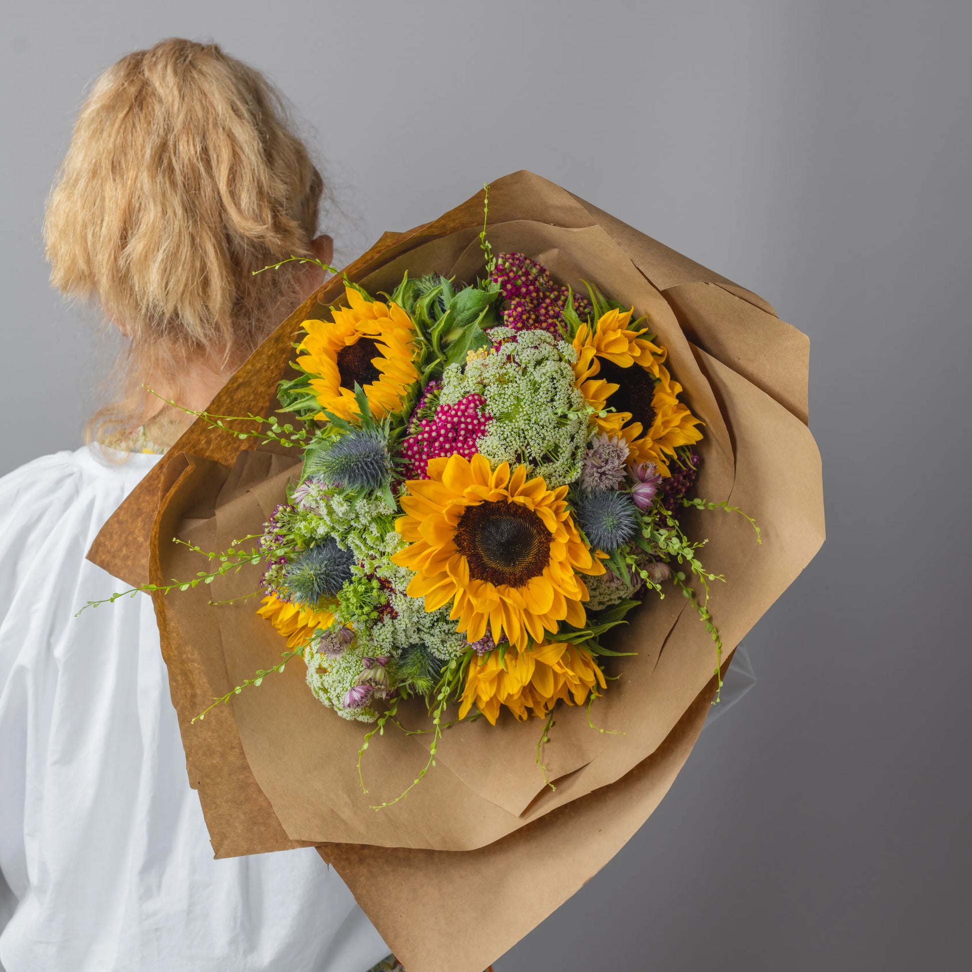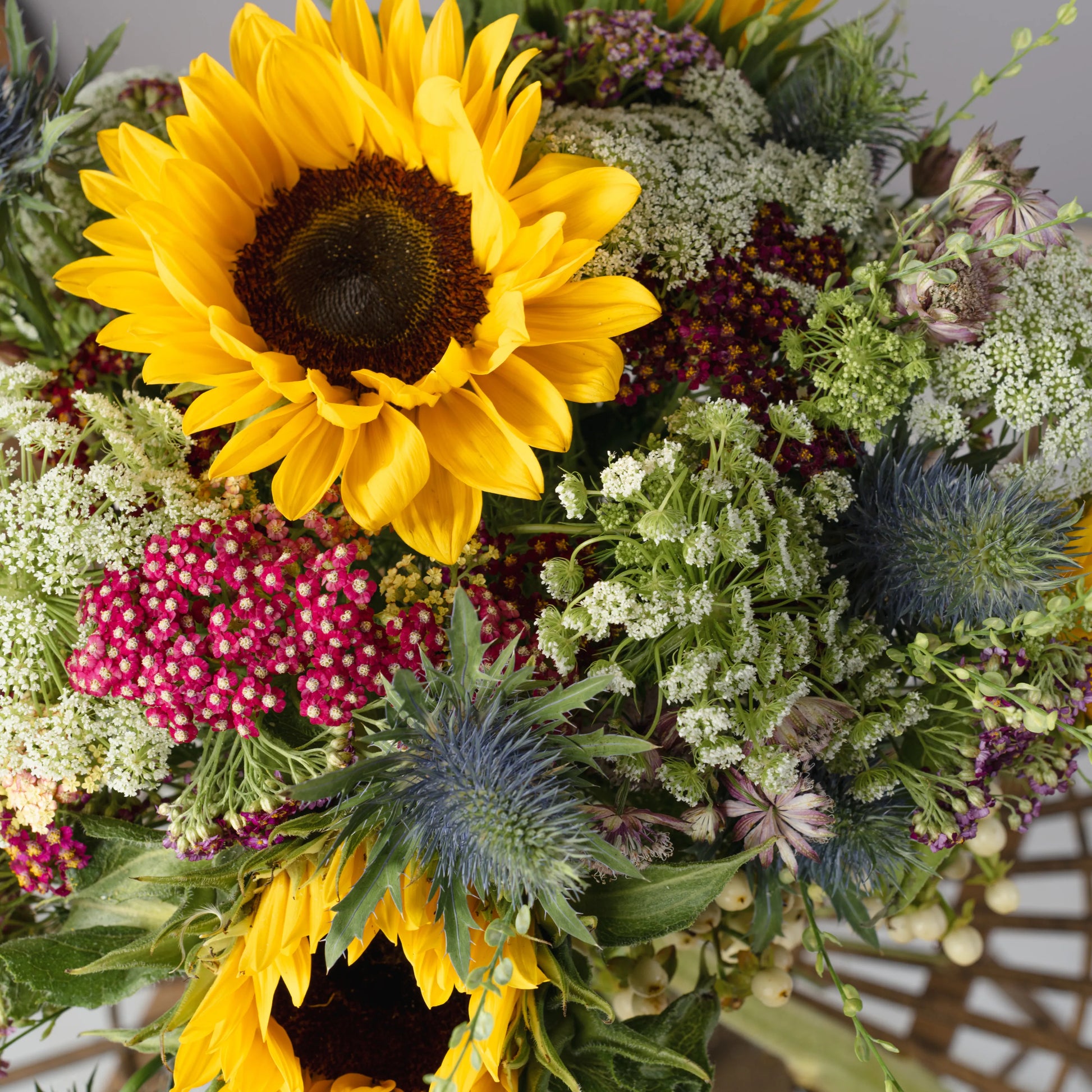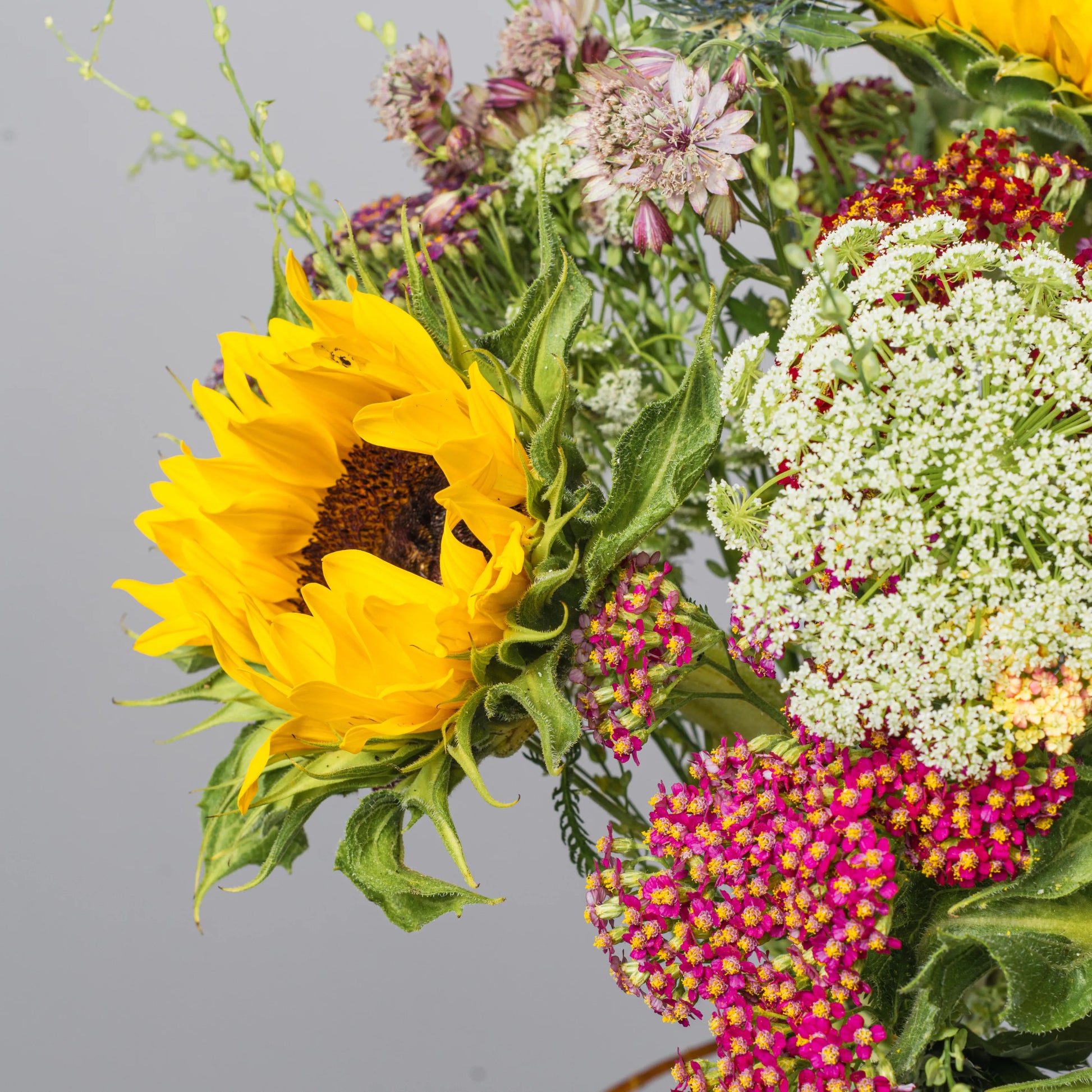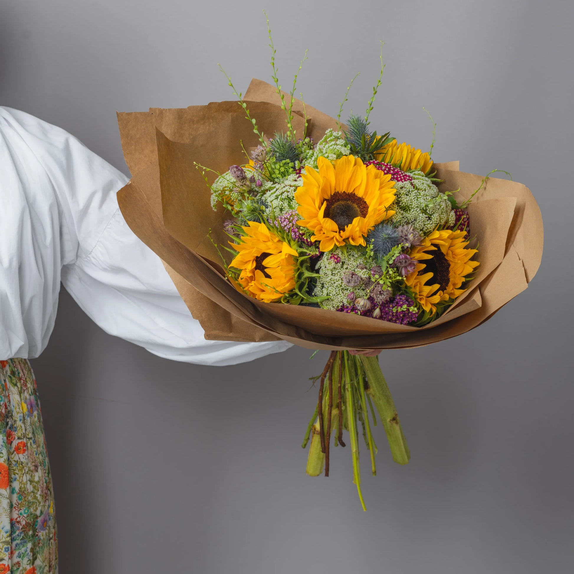 O ramo “Aroma dos Campos” é uma harmoniosa combinação de vibrantes girassóis, elegante eryngium, delicado hipérico branco, etéreo ammi majus, refinada astrância e mil-folhas bordô. Esta composição transporta você para o coração de campos floridos, repletos de aromas e cores da natureza. Os girassóis brilhantes personificam a energia solar, enquanto o eryngium e a astrância adicionam estrutura e sofisticação ao buquê. O hipéricum branco e o ammi majus conferem leveza e frescor, enquanto o mil-folhas bordô aporta profundidade e riqueza. “Aroma dos Campos” é a escolha perfeita para quem deseja trazer para casa um pedaço da natureza e inundá-la com a atmosfera de um campo de verão.