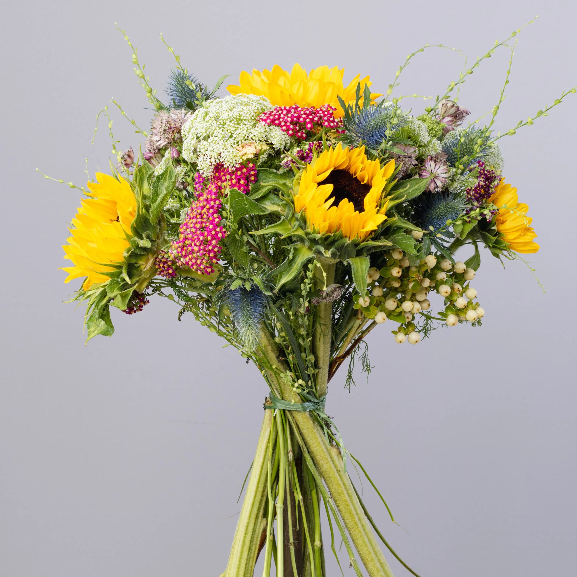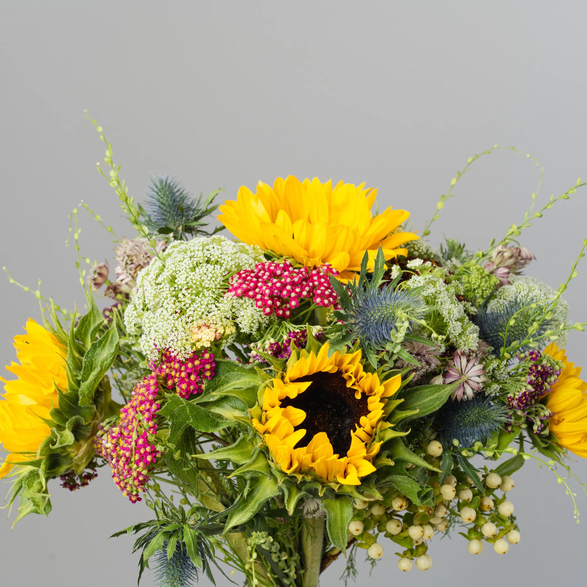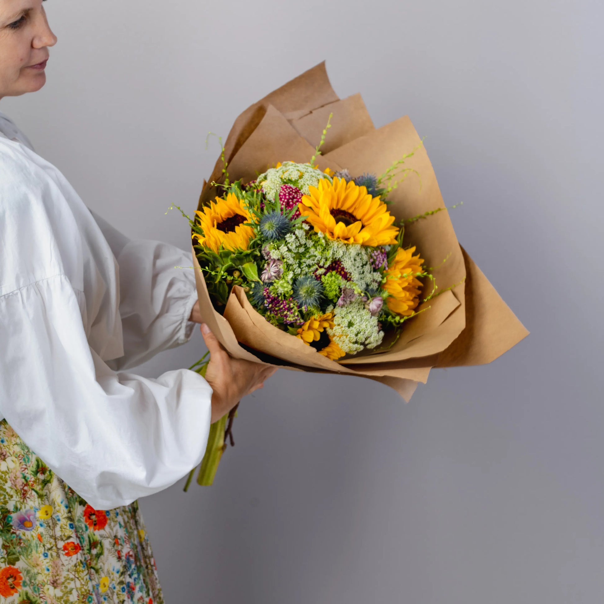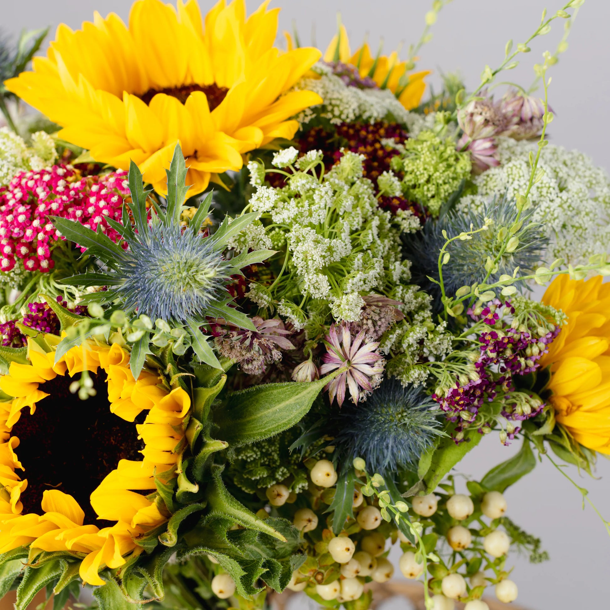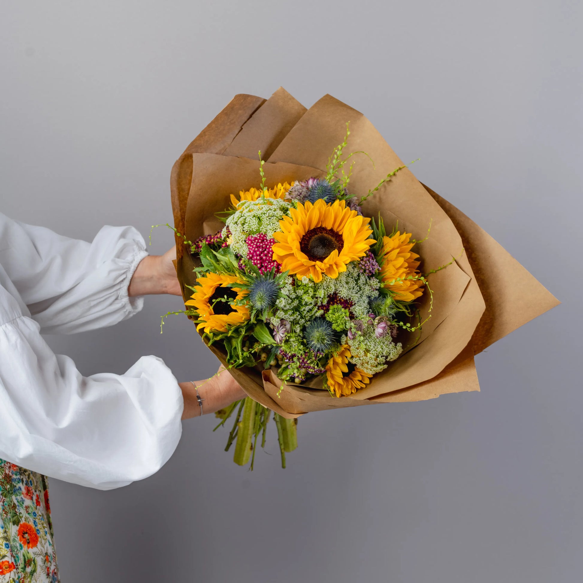 O ramo “Aroma dos Campos” é uma harmoniosa combinação de vibrantes girassóis, elegante eryngium, delicado hipérico branco, etéreo ammi majus, refinada astrância e mil-folhas bordô. Esta composição transporta você para o coração de campos floridos, repletos de aromas e cores da natureza. Os girassóis brilhantes personificam a energia solar, enquanto o eryngium e a astrância adicionam estrutura e sofisticação ao buquê. O hipéricum branco e o ammi majus conferem leveza e frescor, enquanto o mil-folhas bordô aporta profundidade e riqueza. “Aroma dos Campos” é a escolha perfeita para quem deseja trazer para casa um pedaço da natureza e inundá-la com a atmosfera de um campo de verão.
