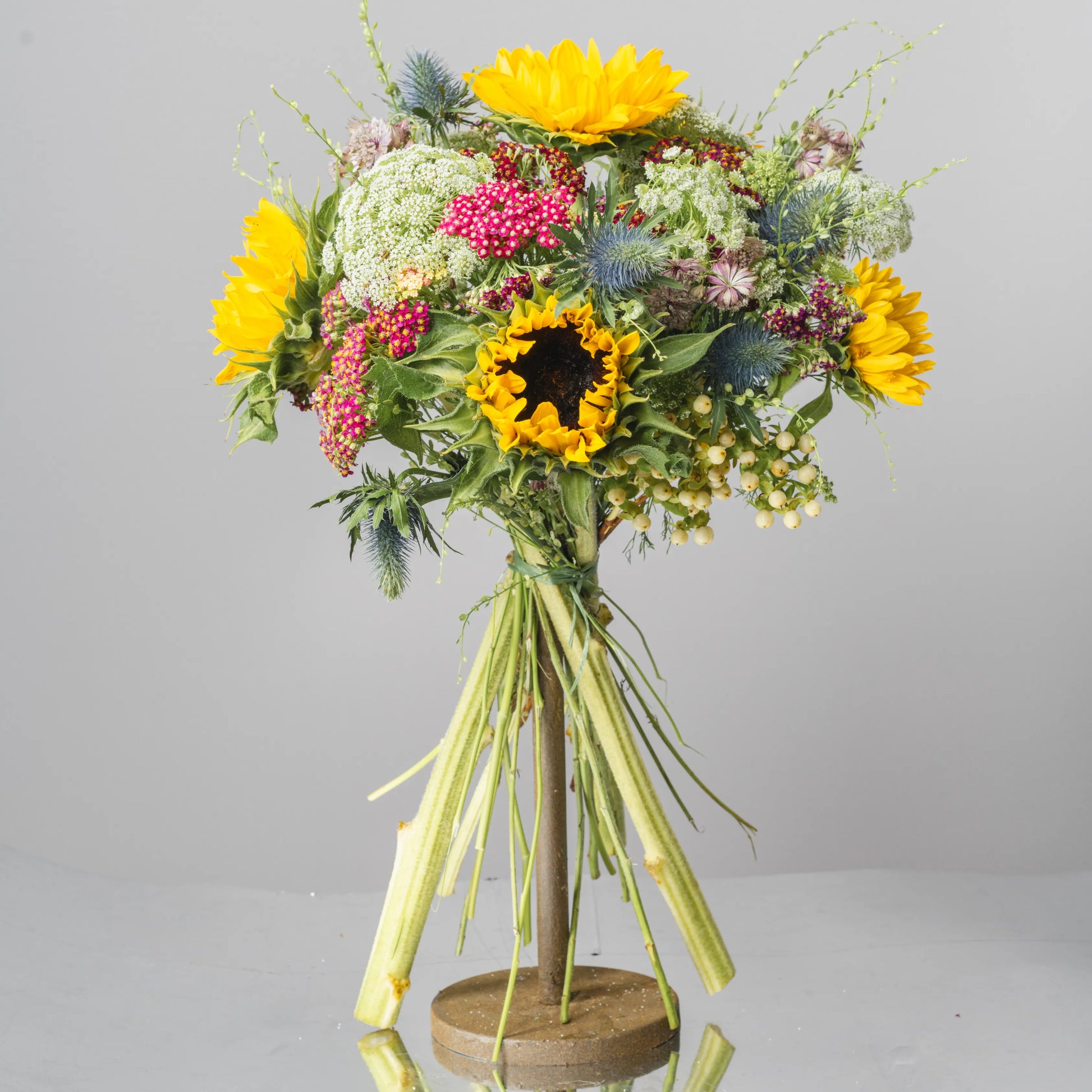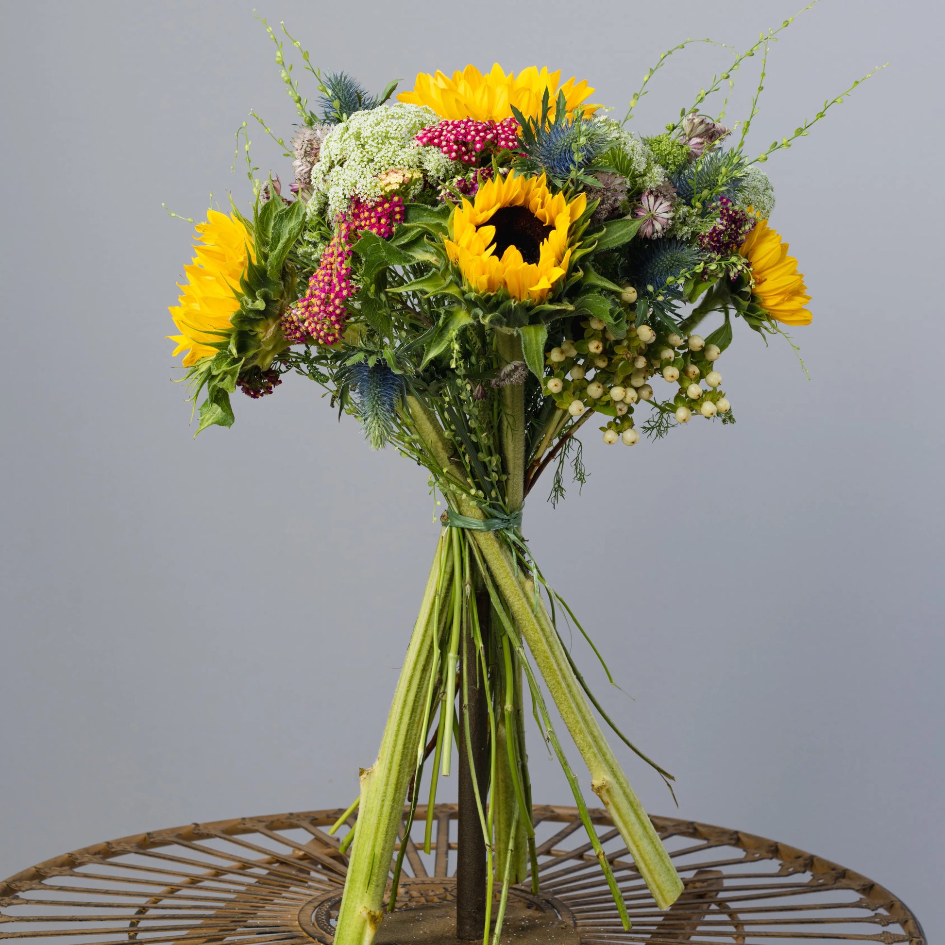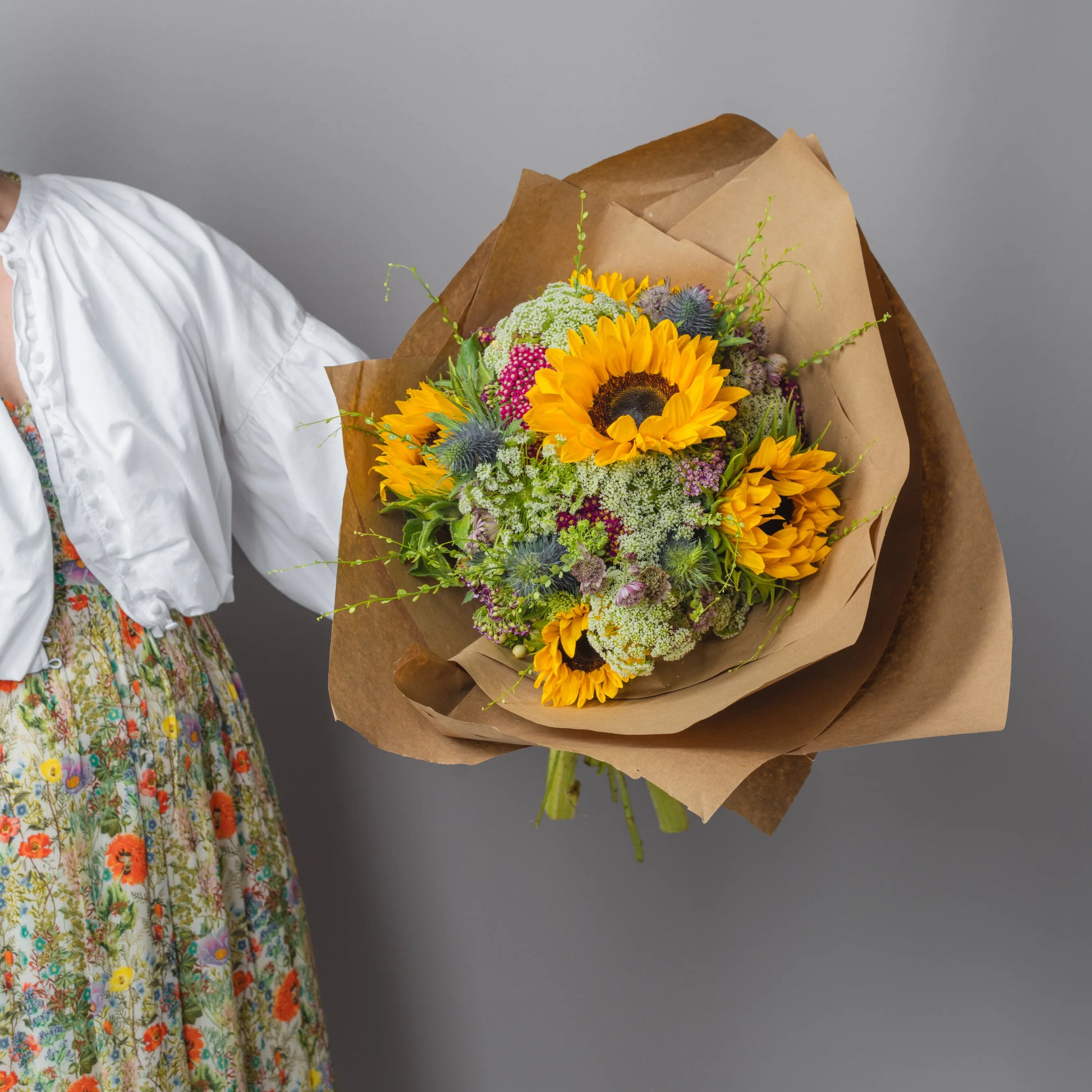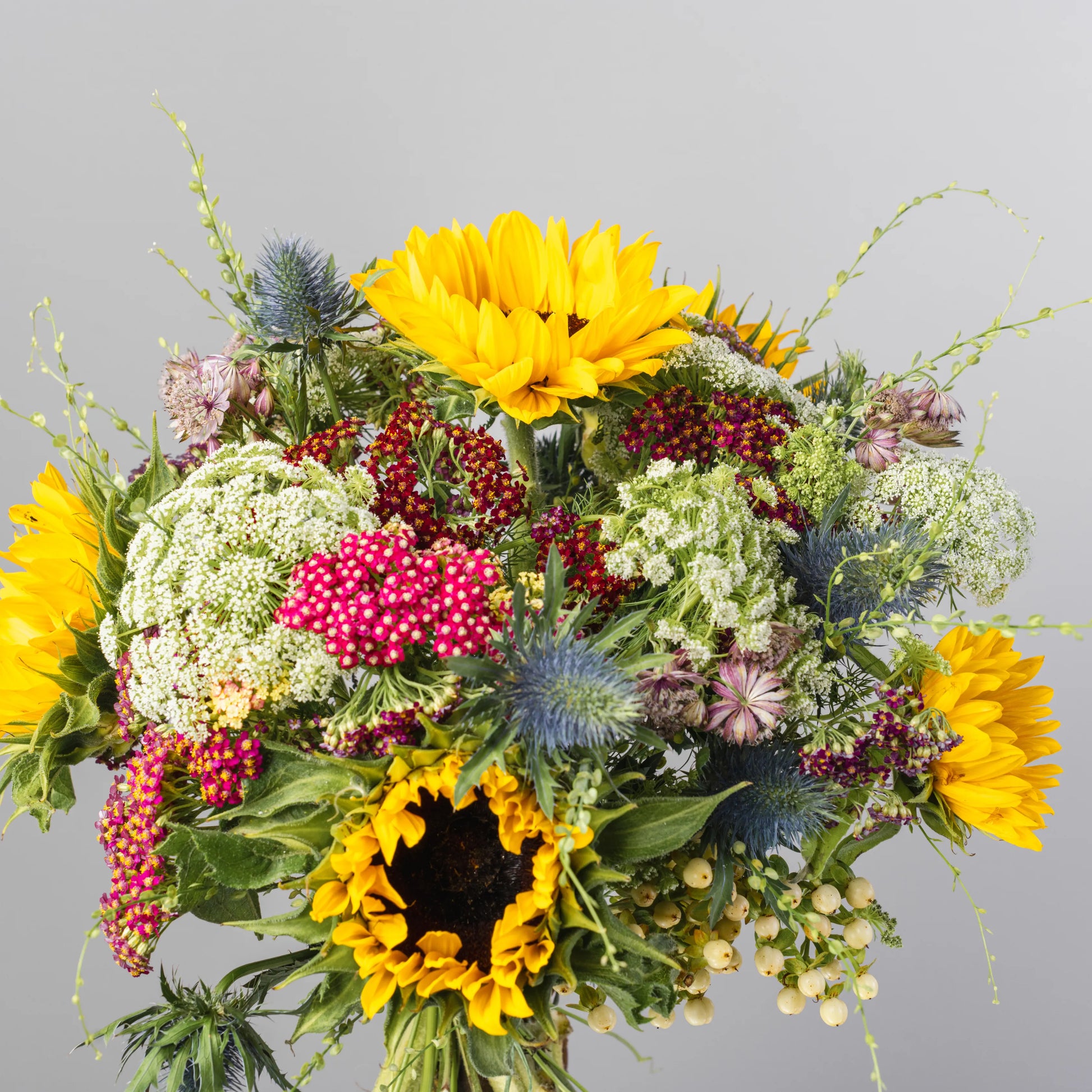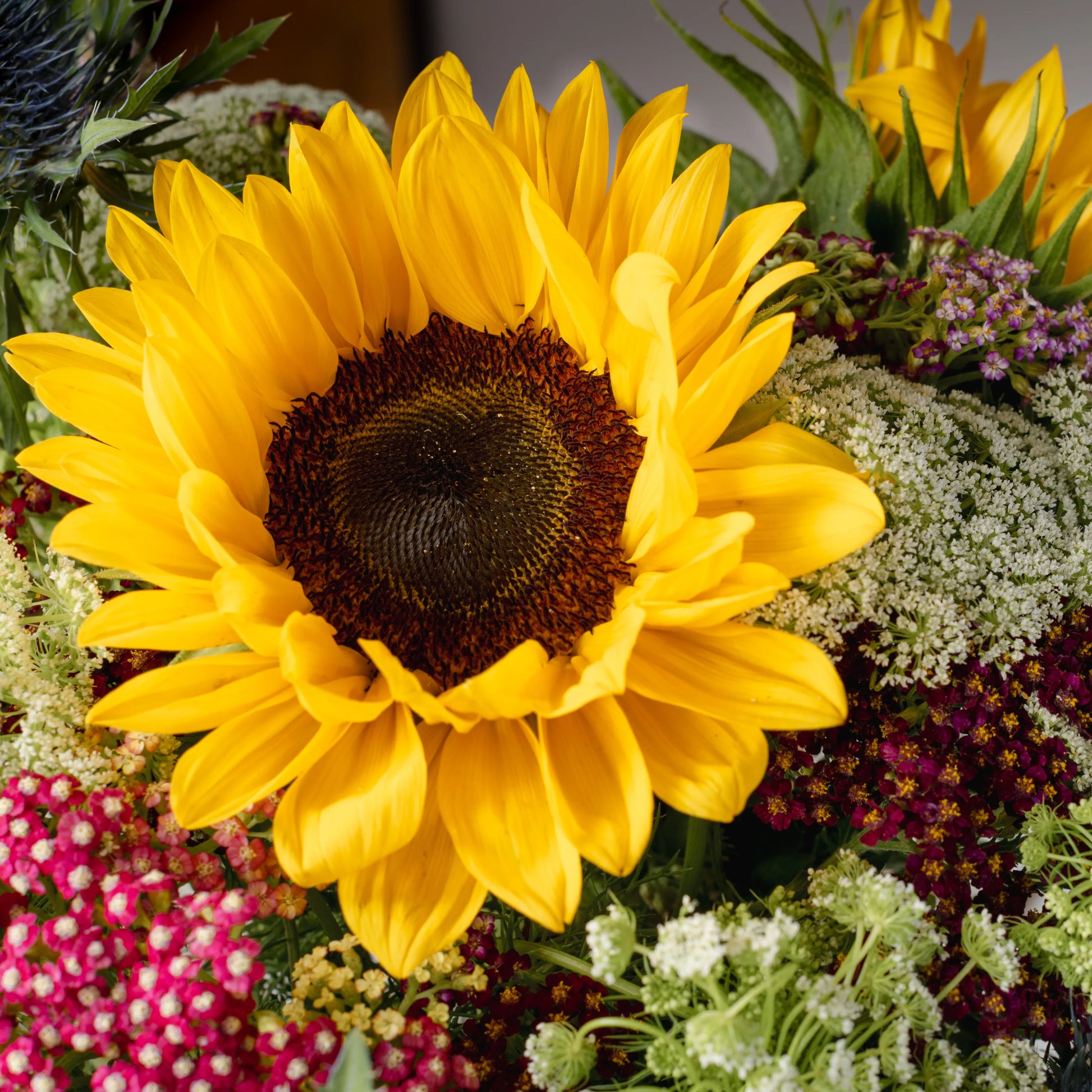 O ramo “Aroma dos Campos” é uma harmoniosa combinação de vibrantes girassóis, elegante eryngium, delicado hipérico branco, etéreo ammi majus, refinada astrância e mil-folhas bordô. Esta composição transporta você para o coração de campos floridos, repletos de aromas e cores da natureza. Os girassóis brilhantes personificam a energia solar, enquanto o eryngium e a astrância adicionam estrutura e sofisticação ao buquê. O hipéricum branco e o ammi majus conferem leveza e frescor, enquanto o mil-folhas bordô aporta profundidade e riqueza. “Aroma dos Campos” é a escolha perfeita para quem deseja trazer para casa um pedaço da natureza e inundá-la com a atmosfera de um campo de verão.