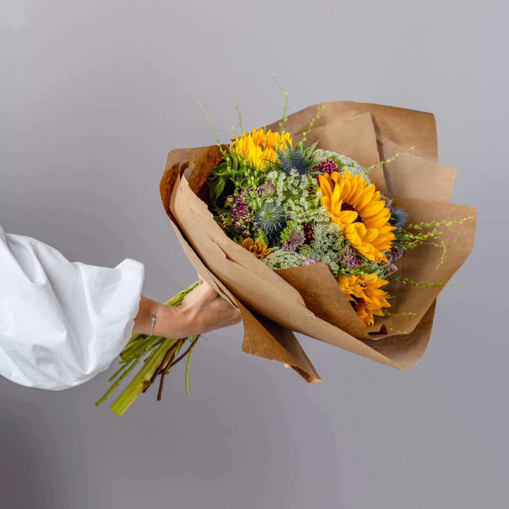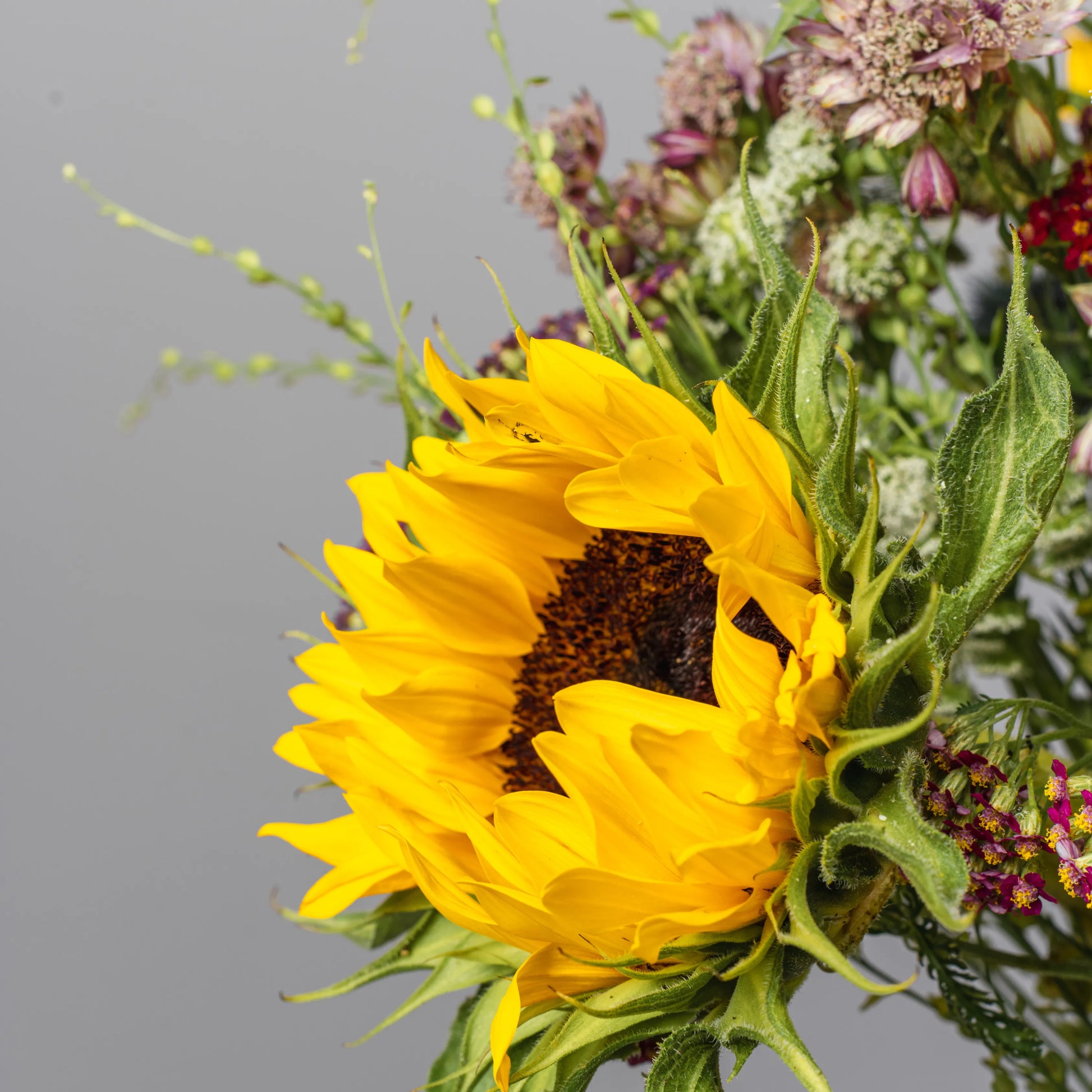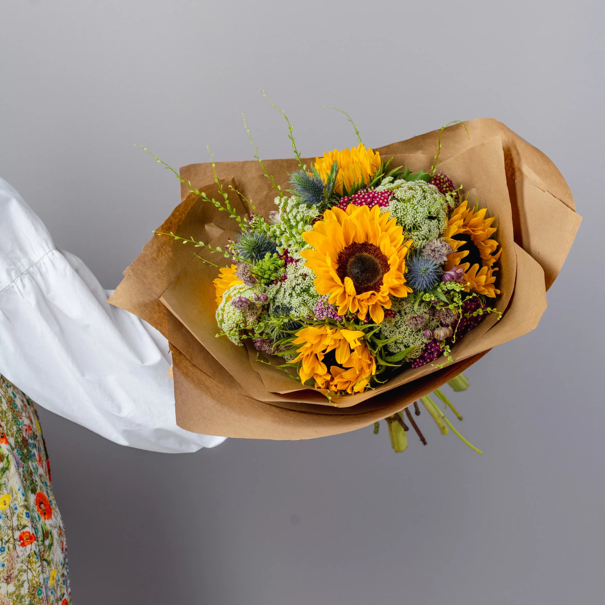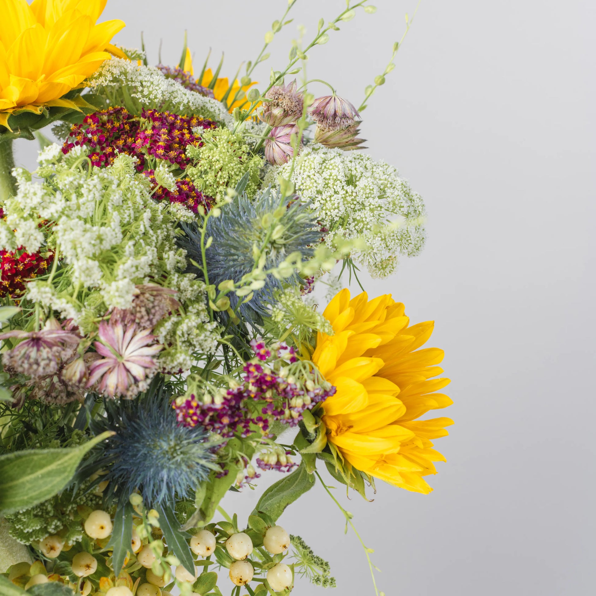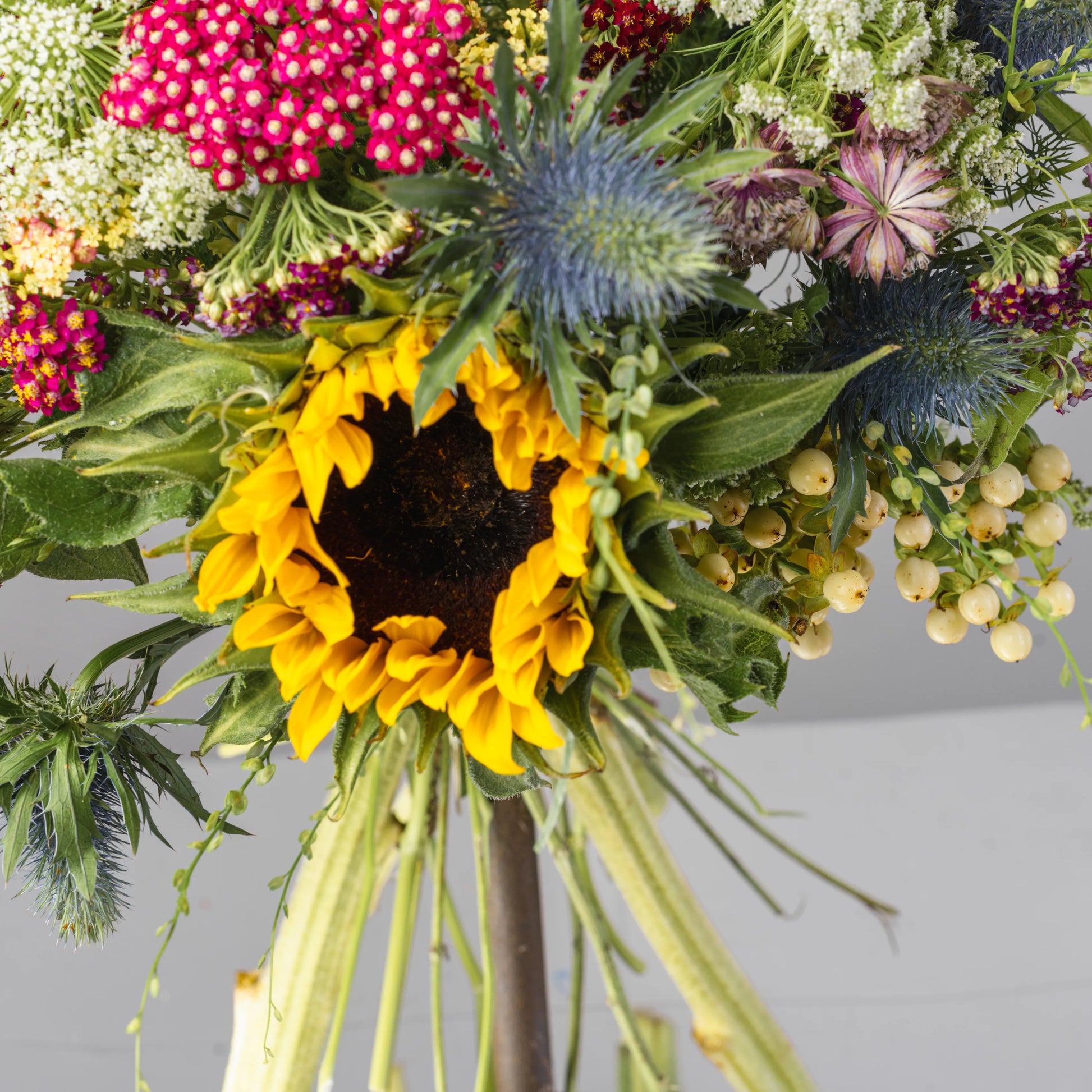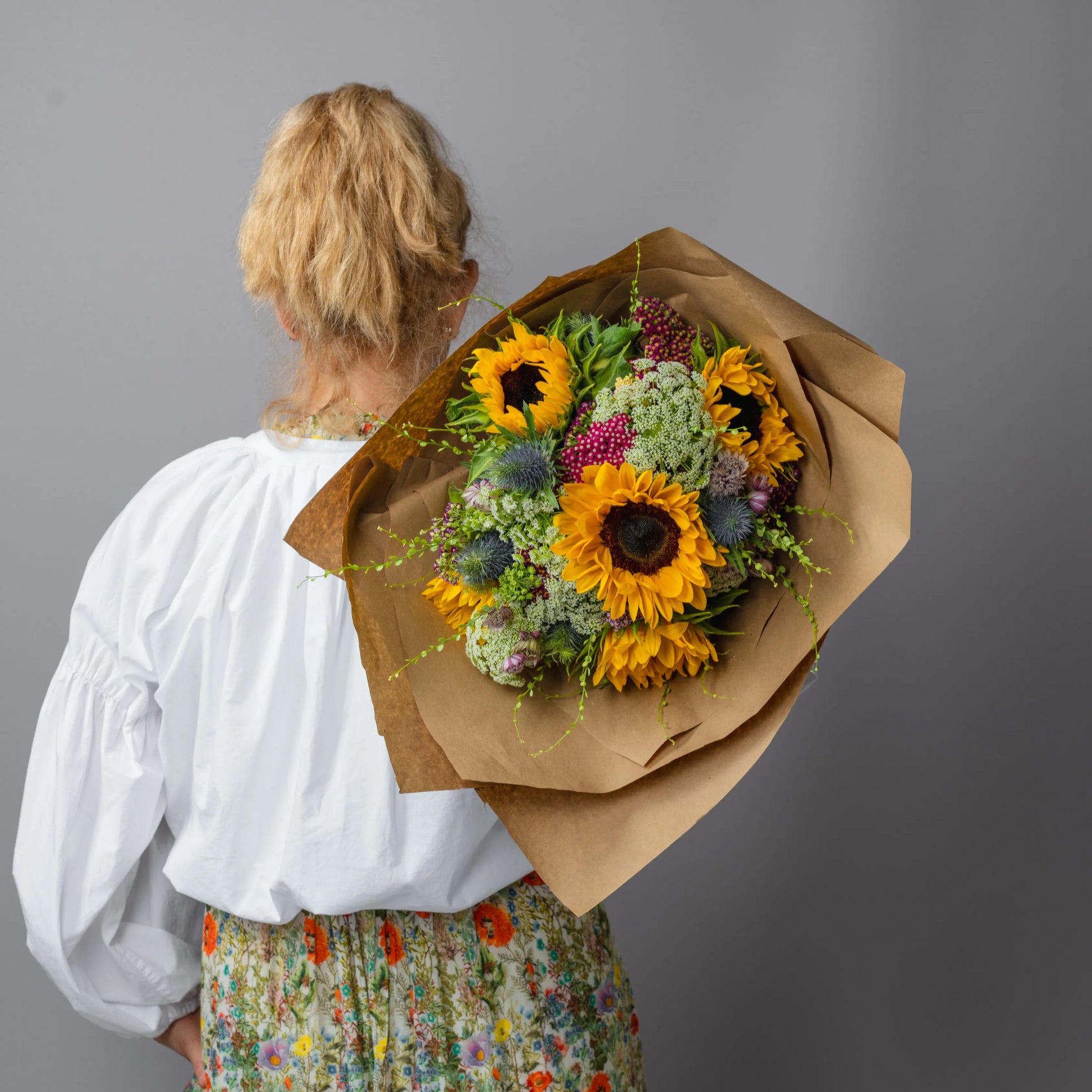 O ramo “Aroma dos Campos” é uma harmoniosa combinação de vibrantes girassóis, elegante eryngium, delicado hipérico branco, etéreo ammi majus, refinada astrância e mil-folhas bordô. Esta composição transporta você para o coração de campos floridos, repletos de aromas e cores da natureza. Os girassóis brilhantes personificam a energia solar, enquanto o eryngium e a astrância adicionam estrutura e sofisticação ao buquê. O hipéricum branco e o ammi majus conferem leveza e frescor, enquanto o mil-folhas bordô aporta profundidade e riqueza. “Aroma dos Campos” é a escolha perfeita para quem deseja trazer para casa um pedaço da natureza e inundá-la com a atmosfera de um campo de verão.