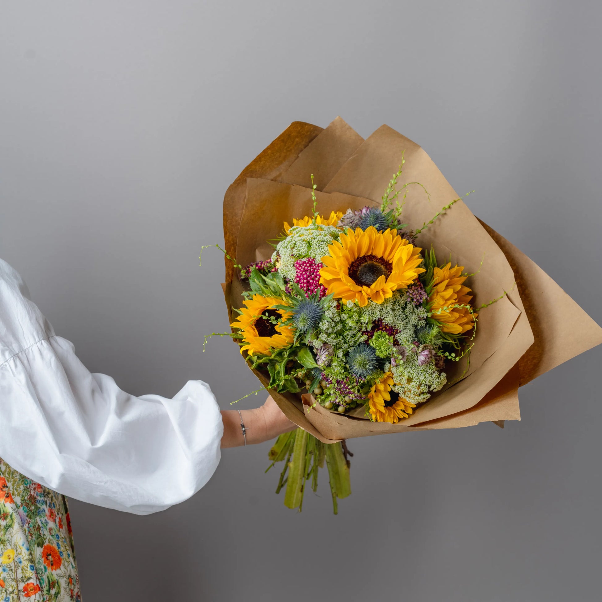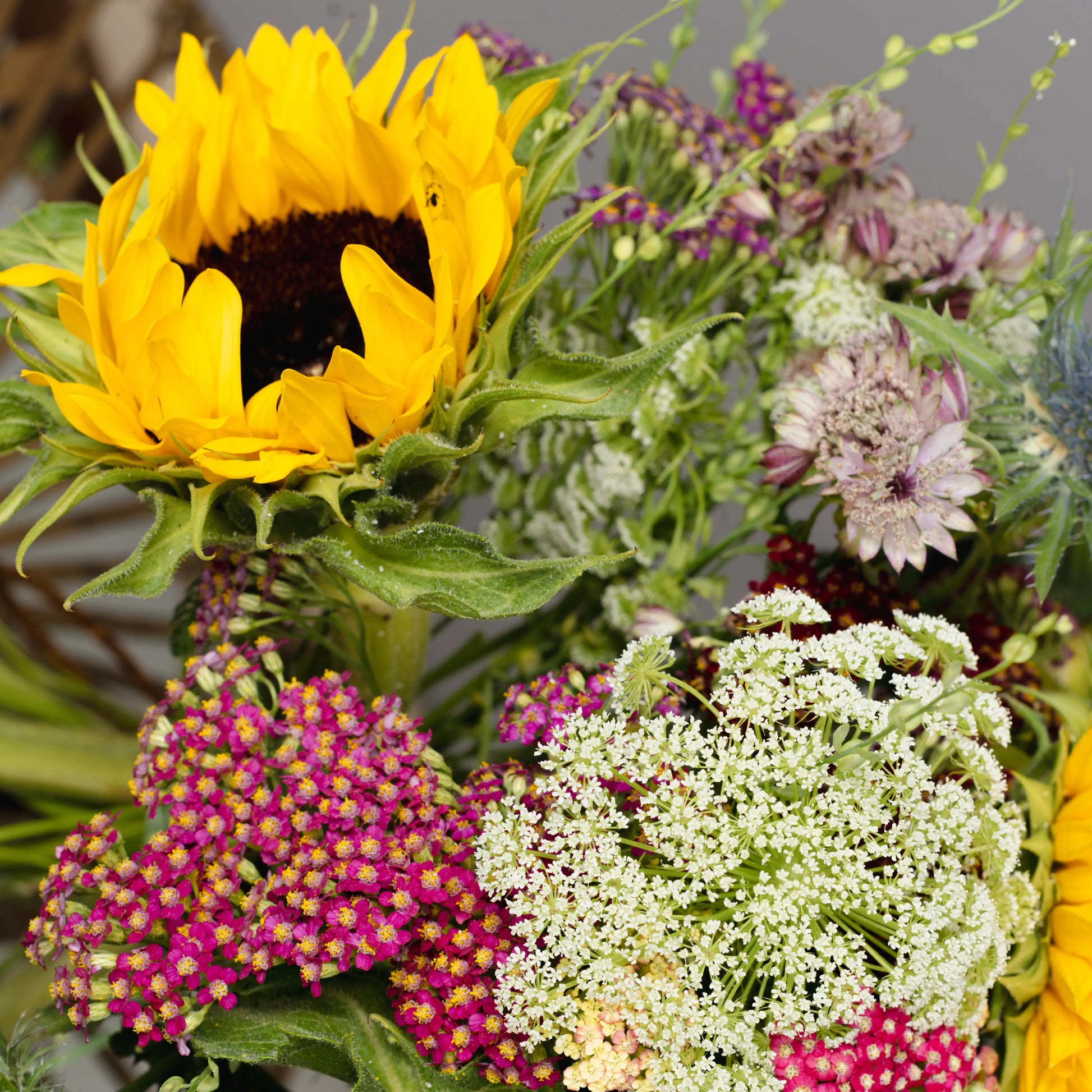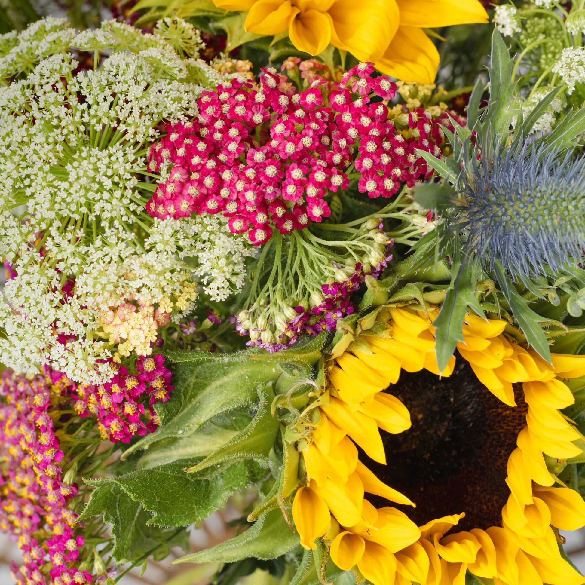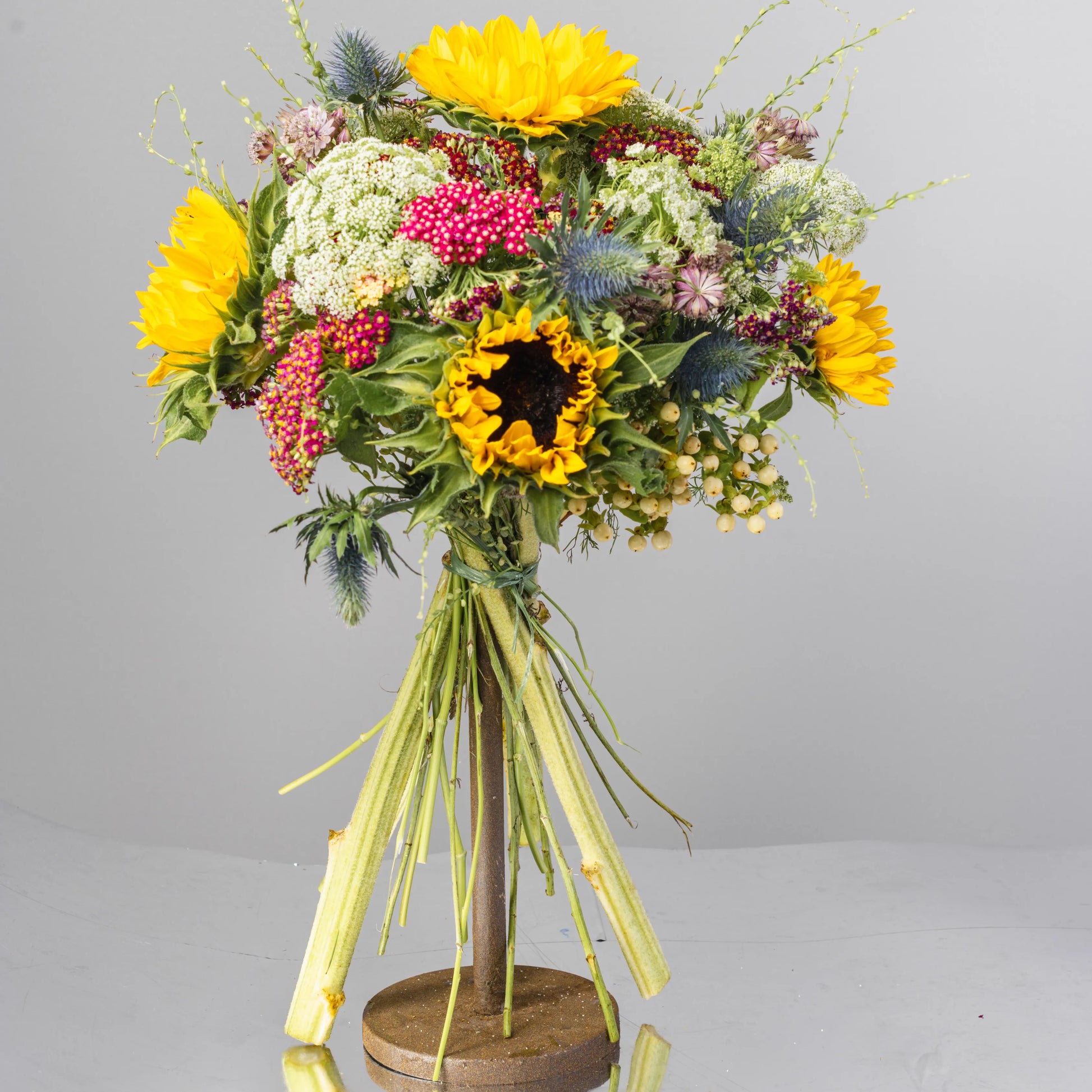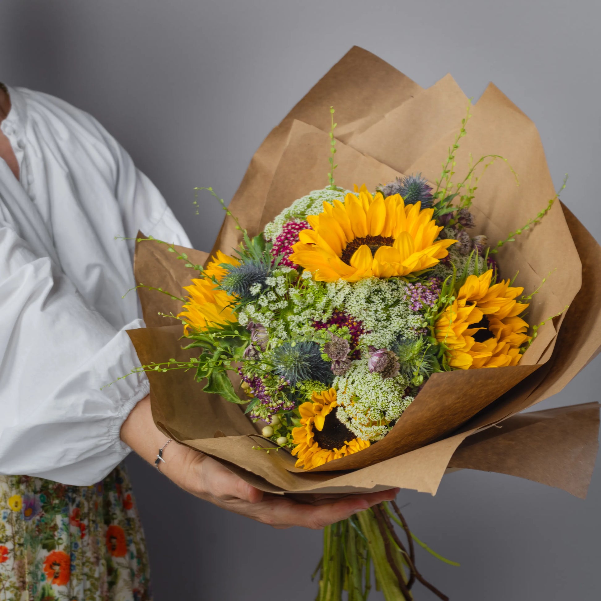 O ramo “Aroma dos Campos” é uma harmoniosa combinação de vibrantes girassóis, elegante eryngium, delicado hipérico branco, etéreo ammi majus, refinada astrância e mil-folhas bordô. Esta composição transporta você para o coração de campos floridos, repletos de aromas e cores da natureza. Os girassóis brilhantes personificam a energia solar, enquanto o eryngium e a astrância adicionam estrutura e sofisticação ao buquê. O hipéricum branco e o ammi majus conferem leveza e frescor, enquanto o mil-folhas bordô aporta profundidade e riqueza. “Aroma dos Campos” é a escolha perfeita para quem deseja trazer para casa um pedaço da natureza e inundá-la com a atmosfera de um campo de verão.