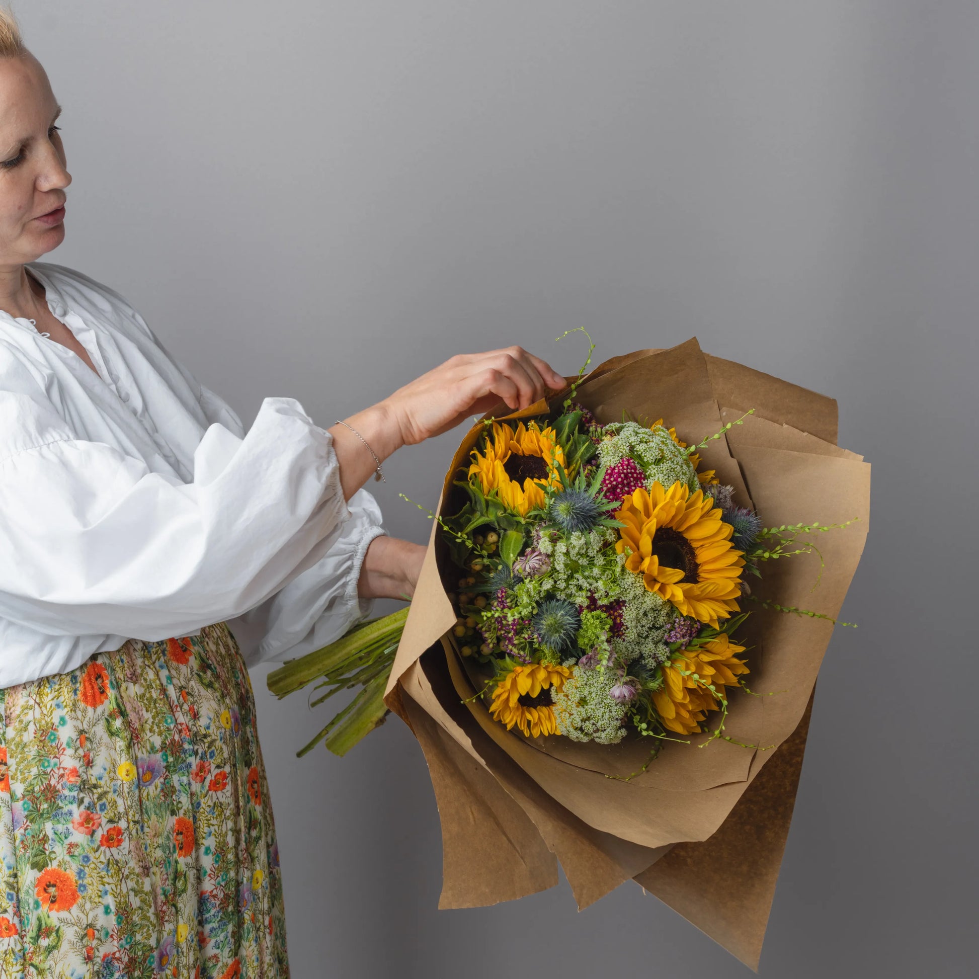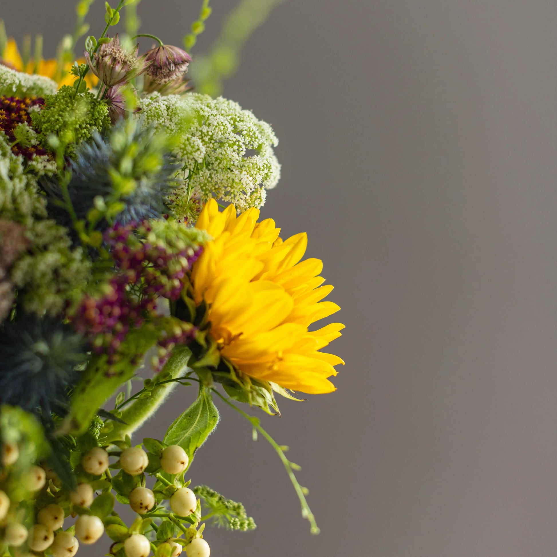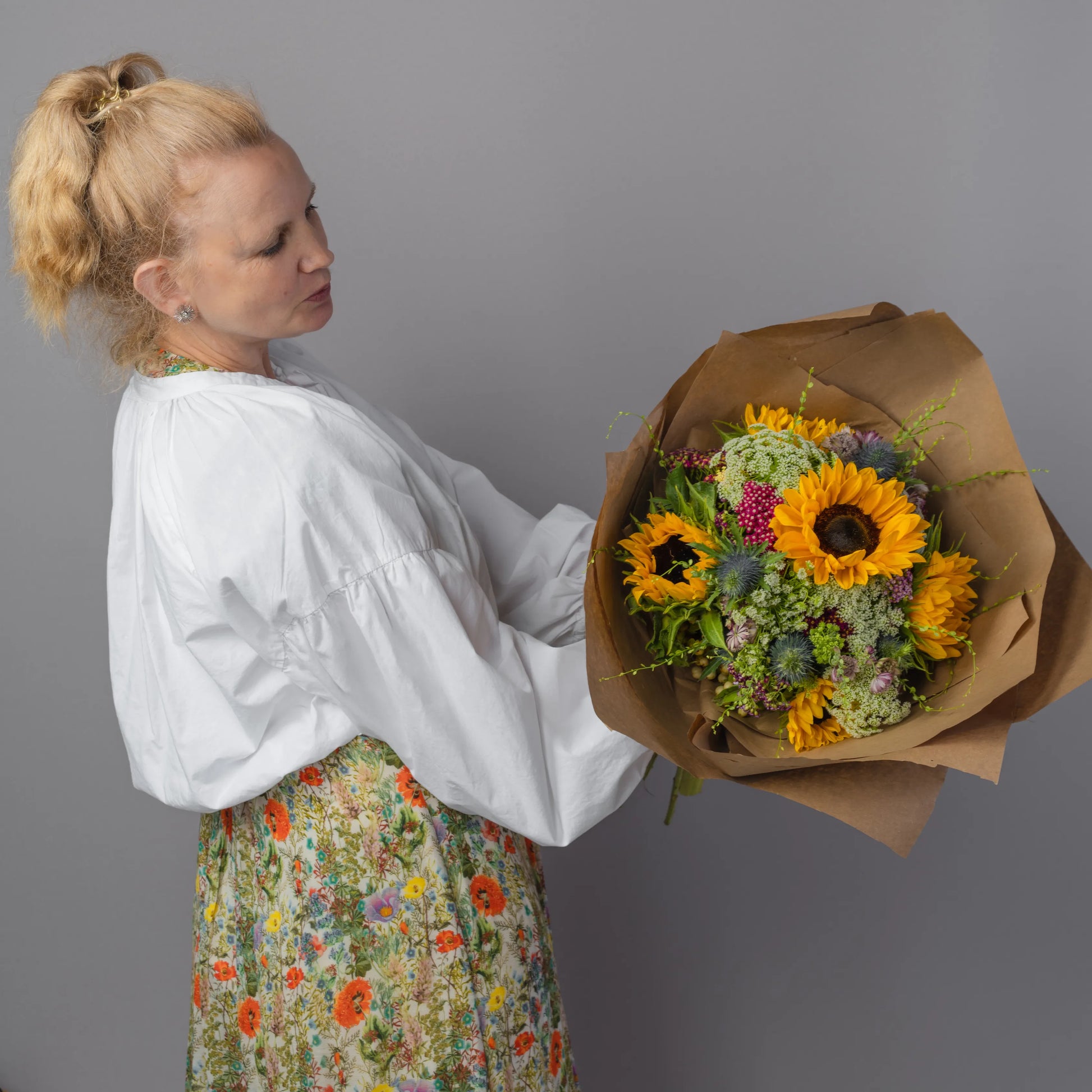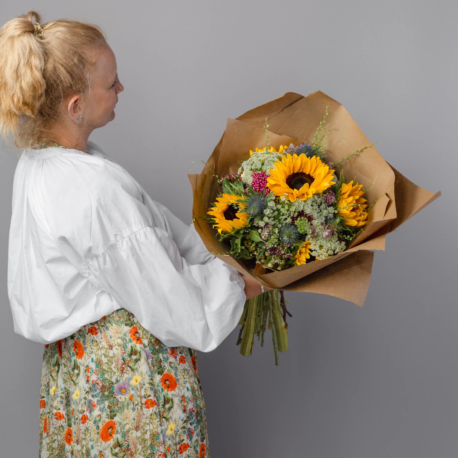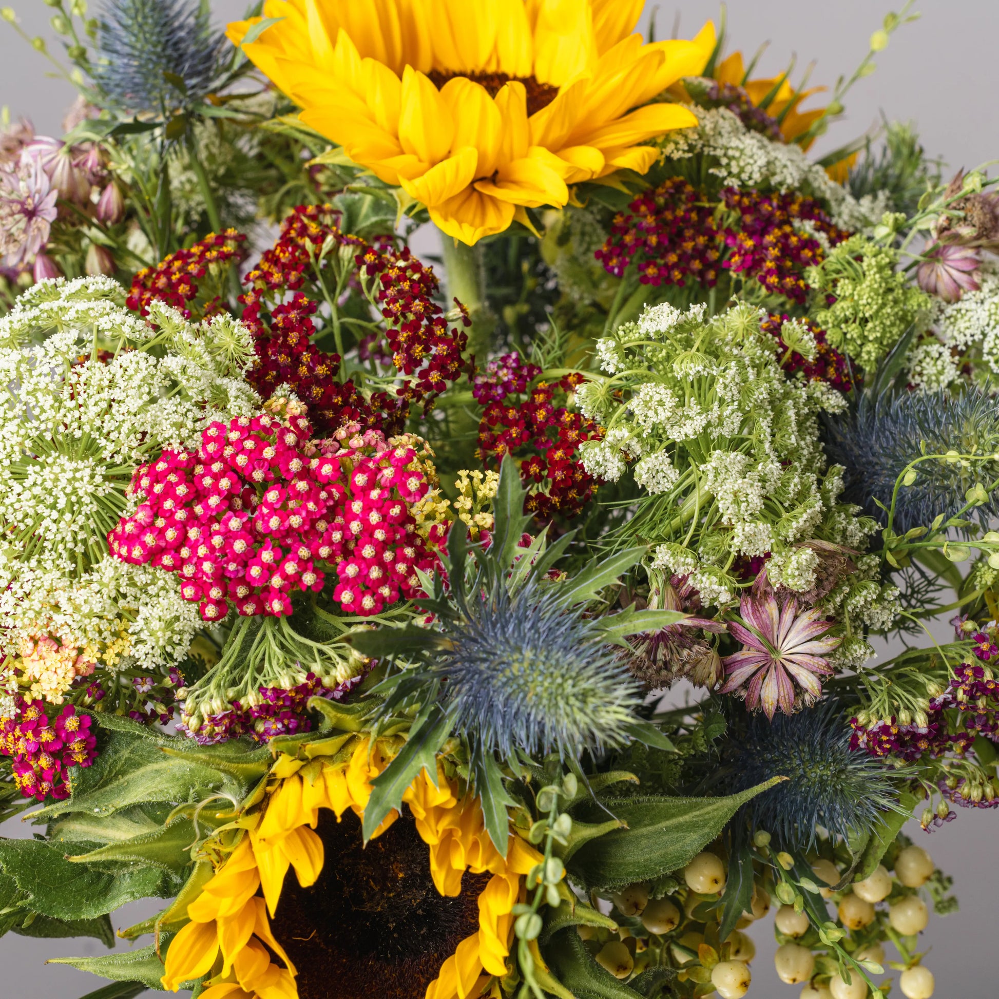 O ramo “Aroma dos Campos” é uma harmoniosa combinação de vibrantes girassóis, elegante eryngium, delicado hipérico branco, etéreo ammi majus, refinada astrância e mil-folhas bordô. Esta composição transporta você para o coração de campos floridos, repletos de aromas e cores da natureza. Os girassóis brilhantes personificam a energia solar, enquanto o eryngium e a astrância adicionam estrutura e sofisticação ao buquê. O hipéricum branco e o ammi majus conferem leveza e frescor, enquanto o mil-folhas bordô aporta profundidade e riqueza. “Aroma dos Campos” é a escolha perfeita para quem deseja trazer para casa um pedaço da natureza e inundá-la com a atmosfera de um campo de verão.