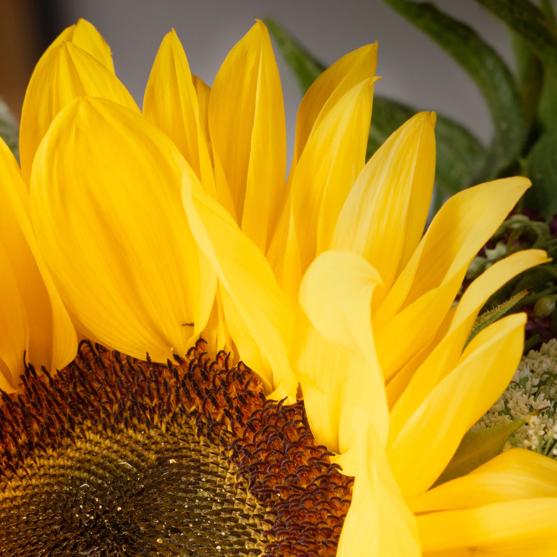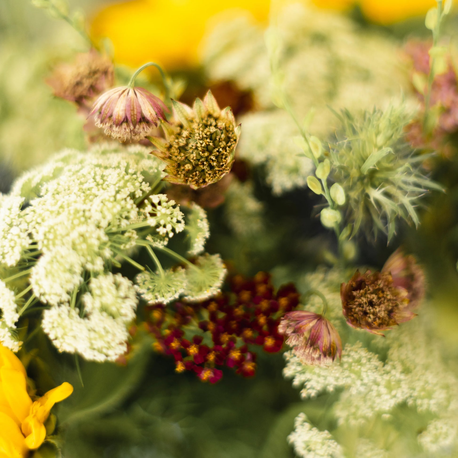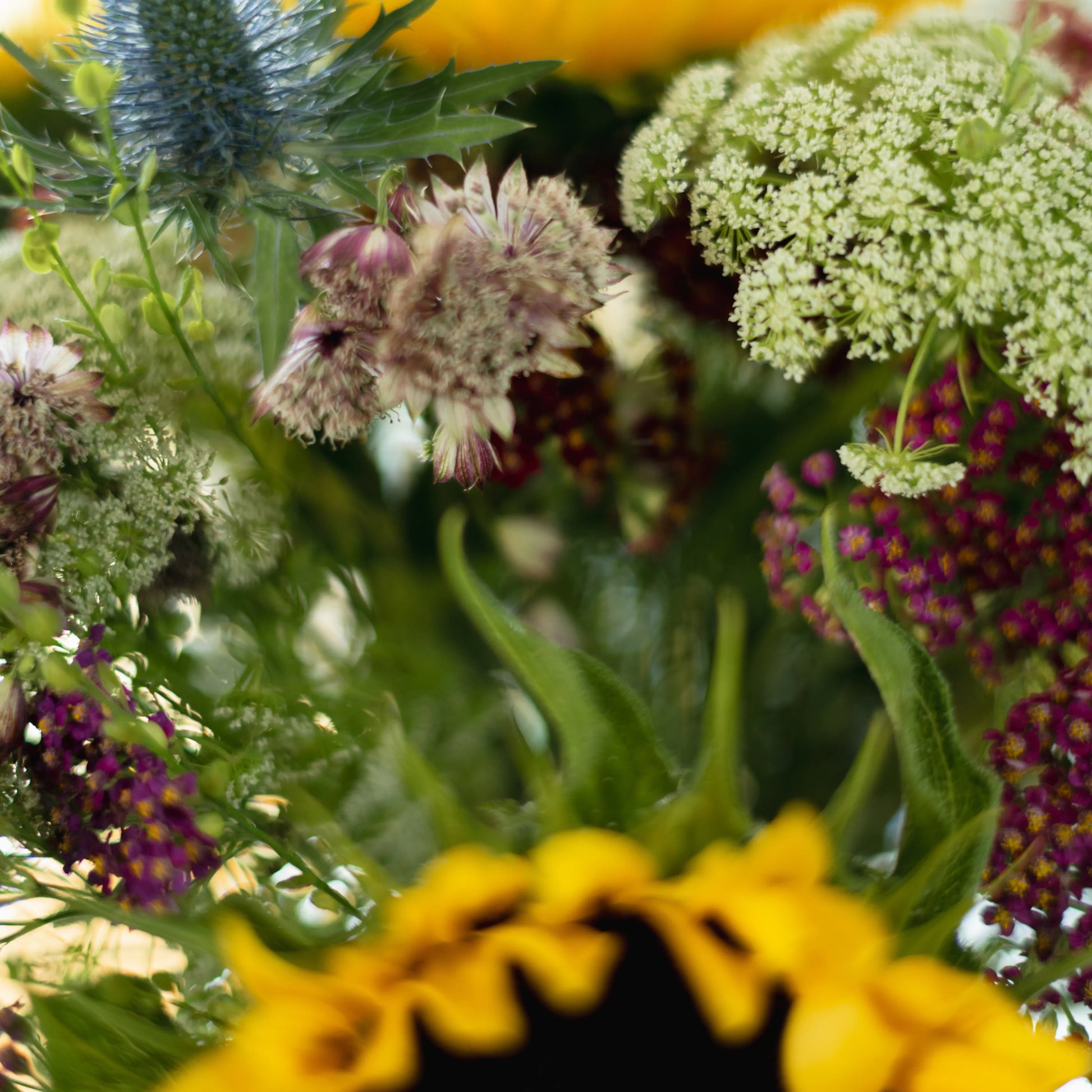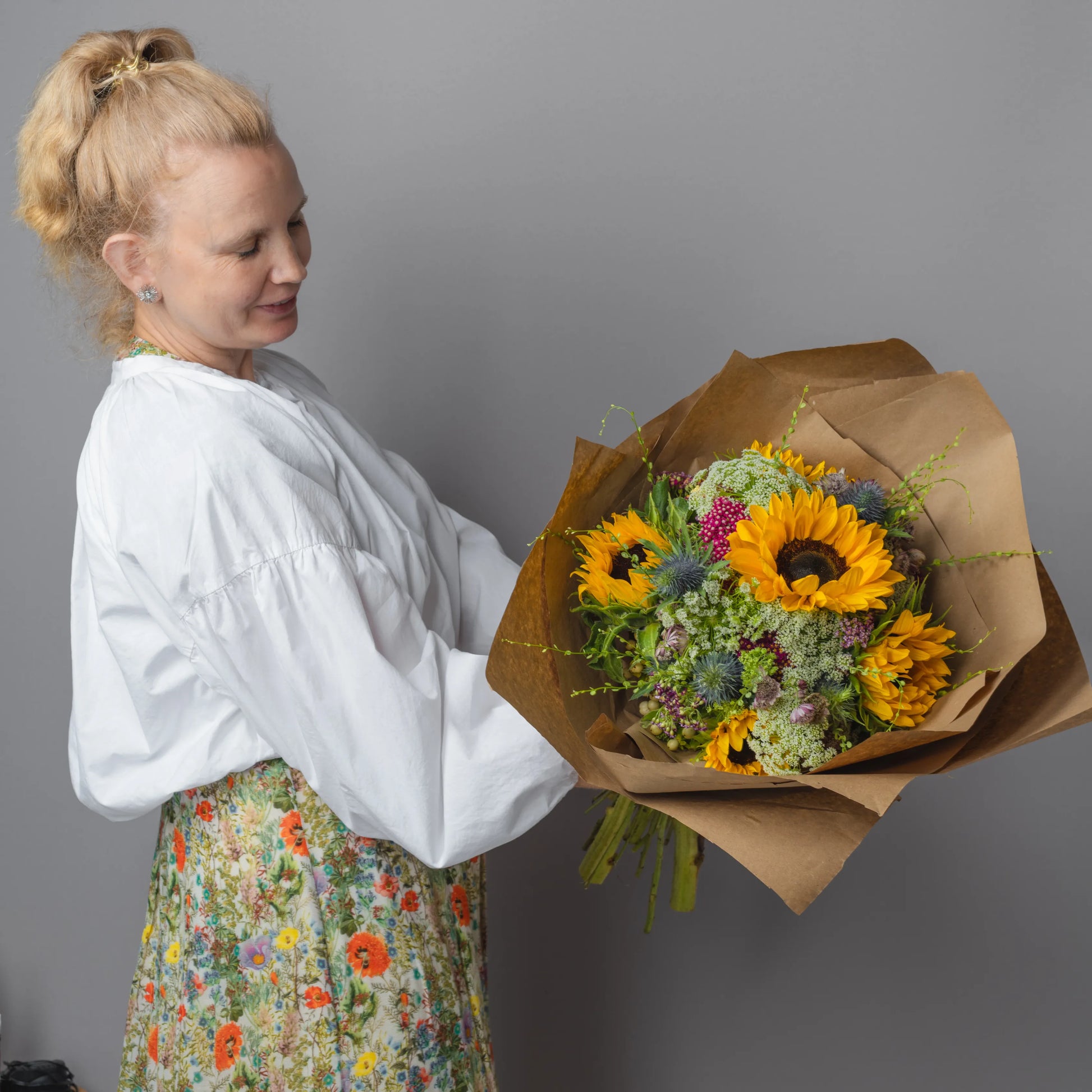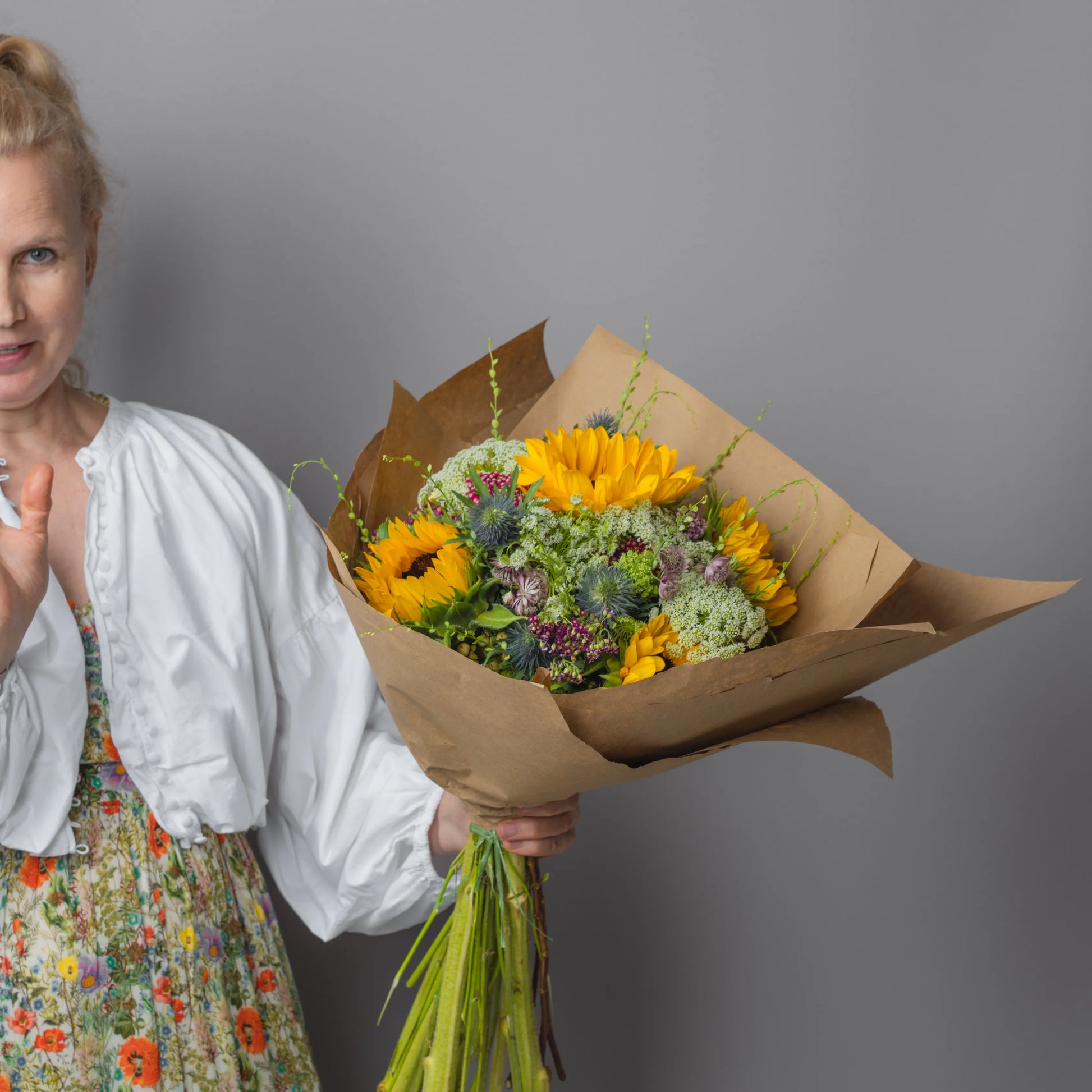 O ramo “Aroma dos Campos” é uma harmoniosa combinação de vibrantes girassóis, elegante eryngium, delicado hipérico branco, etéreo ammi majus, refinada astrância e mil-folhas bordô. Esta composição transporta você para o coração de campos floridos, repletos de aromas e cores da natureza. Os girassóis brilhantes personificam a energia solar, enquanto o eryngium e a astrância adicionam estrutura e sofisticação ao buquê. O hipéricum branco e o ammi majus conferem leveza e frescor, enquanto o mil-folhas bordô aporta profundidade e riqueza. “Aroma dos Campos” é a escolha perfeita para quem deseja trazer para casa um pedaço da natureza e inundá-la com a atmosfera de um campo de verão.