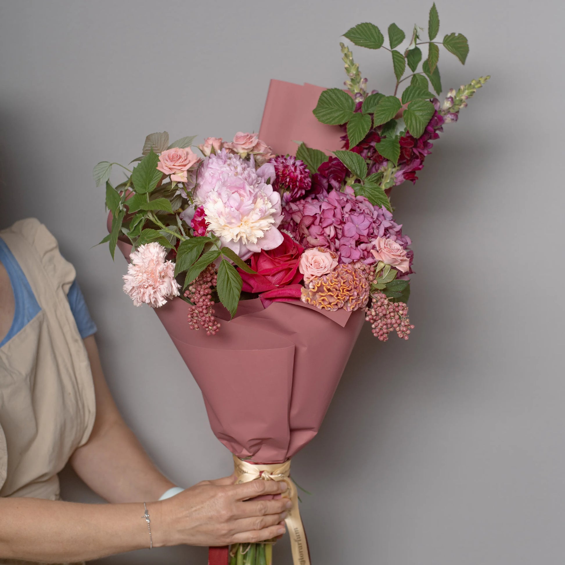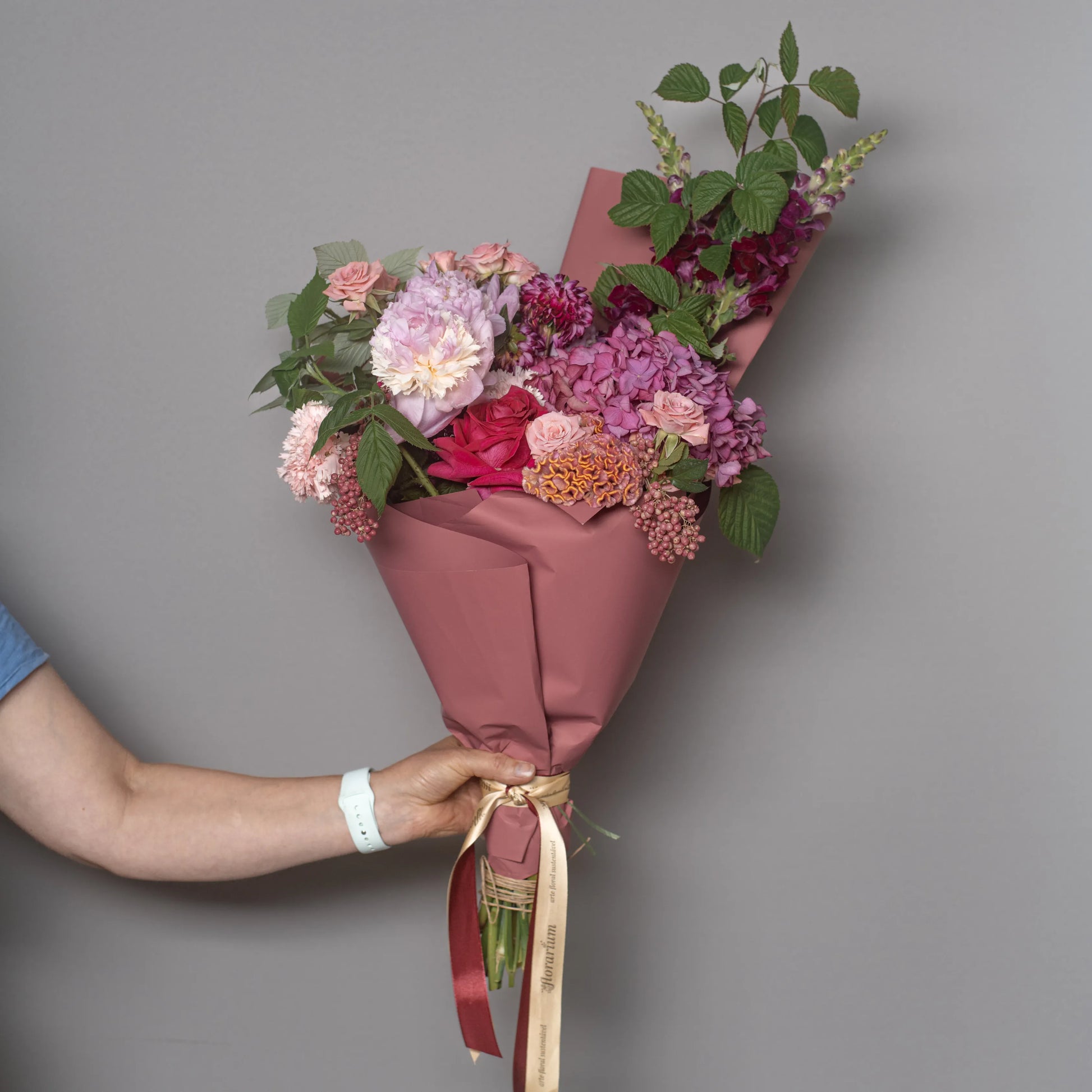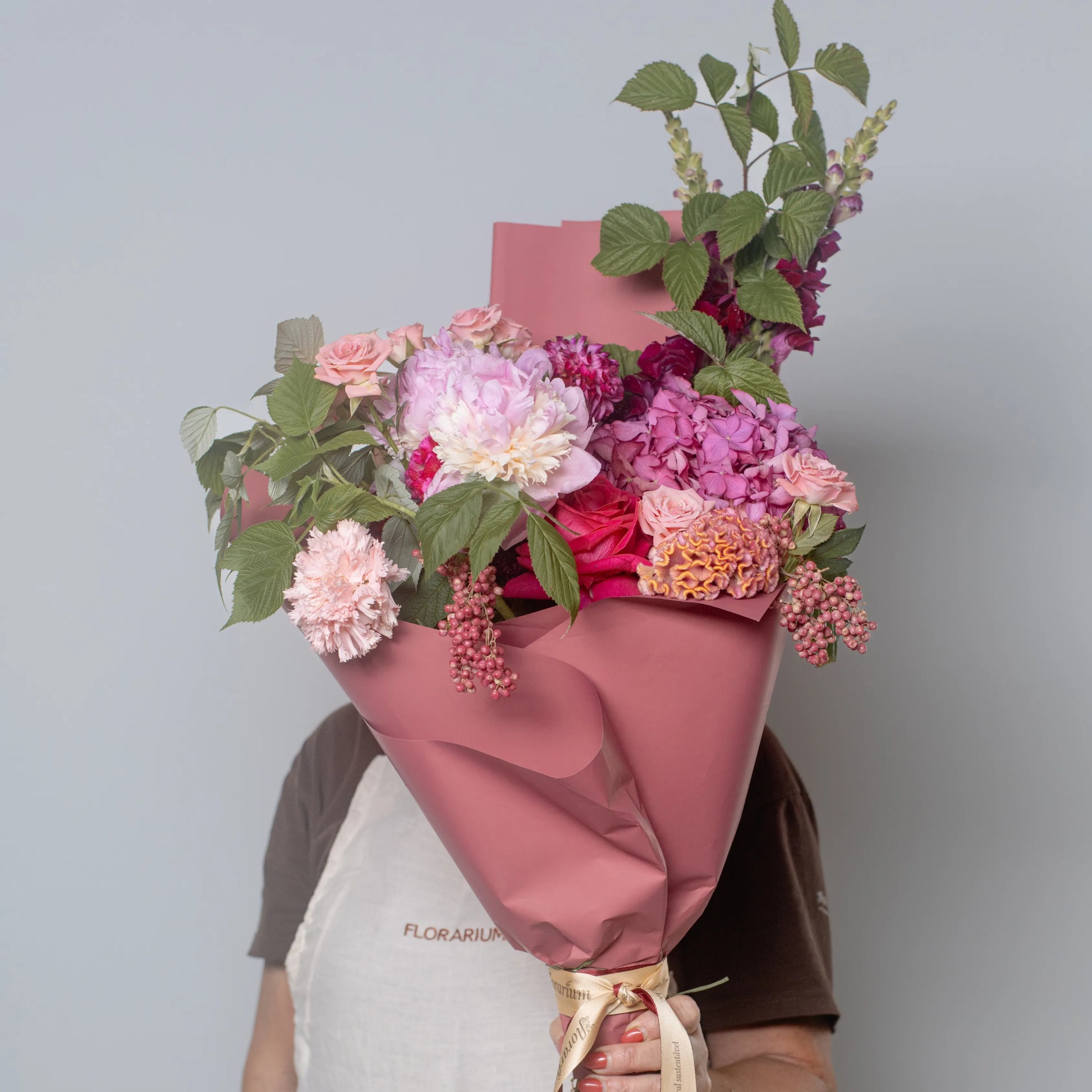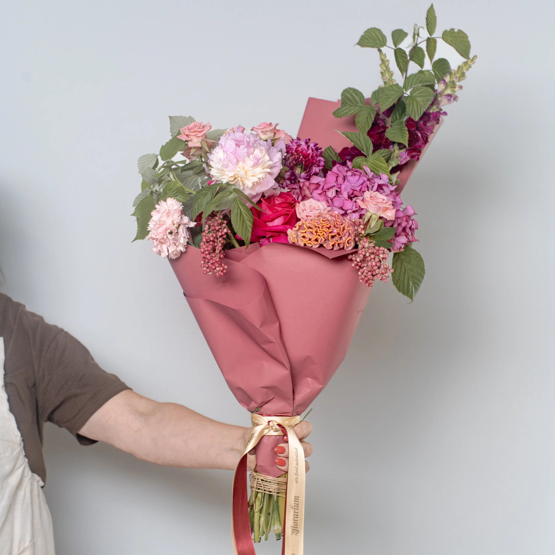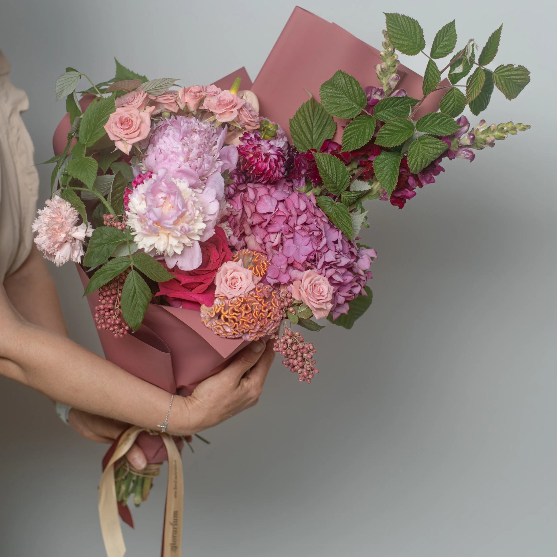 O ramo “Encanto do Jardim” é uma representação refinada do romantismo de um jardim, combinando suaves e ricos tons de rosa e bordô. A hortênsia rosa cria a base da composição, conferindo ao buquê plenitude e delicadeza. As peônias e rosas rosas adicionam leveza e elegância, destacando o caráter romântico do buquê. As rosas bordô e o antirrínio aportam profundidade e intensidade, intensificando a expressividade da composição. As celósias rosa e as bagas de pimenta rosa trazem acentos texturais, enquanto os ramos de framboesa acrescentam um toque de selvageria natural e unicidade. “Encanto do Jardim” é a escolha perfeita para quem valoriza a beleza requintada e a suavidade dos tons naturais.
