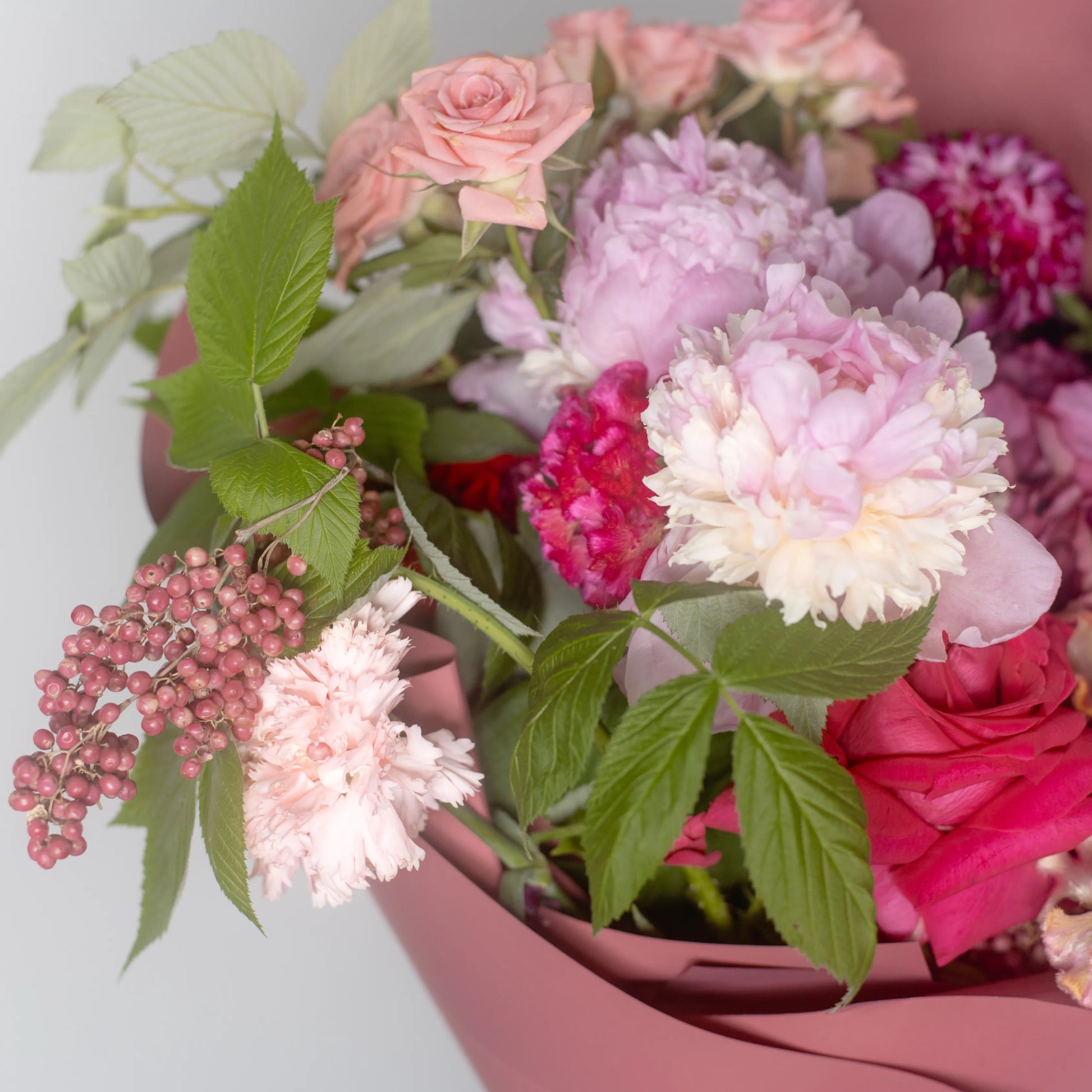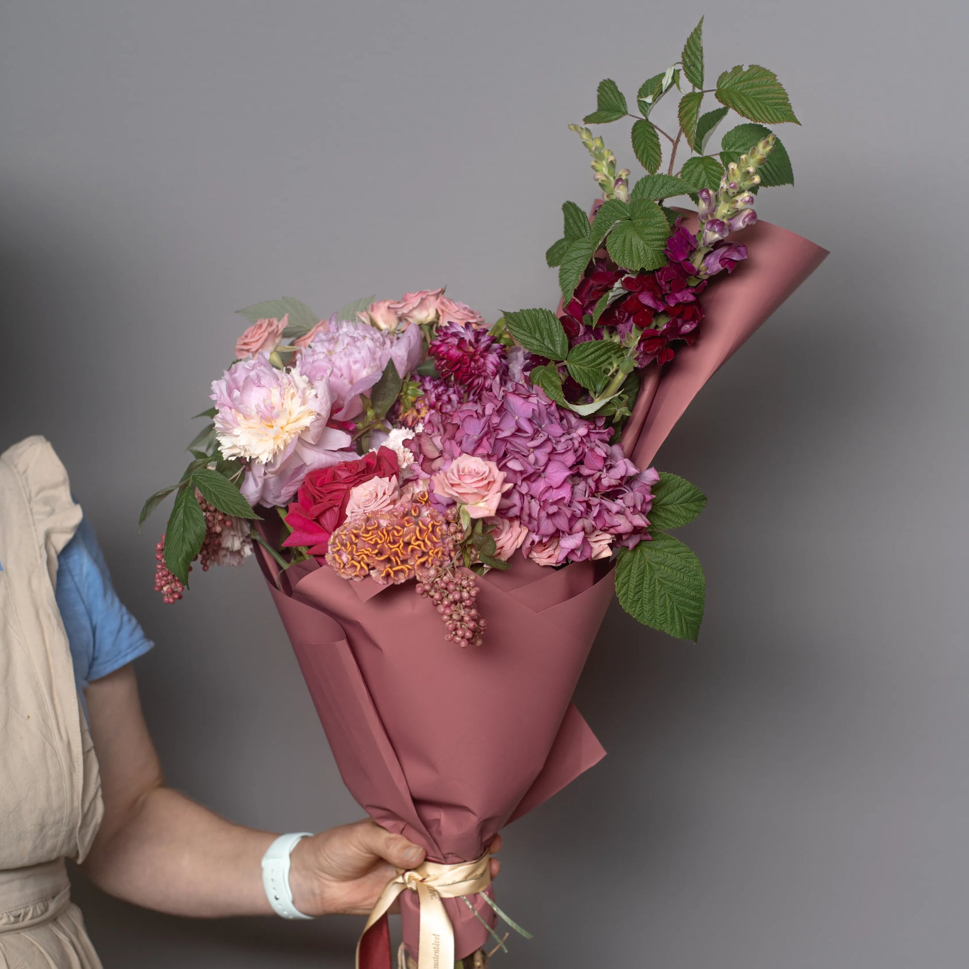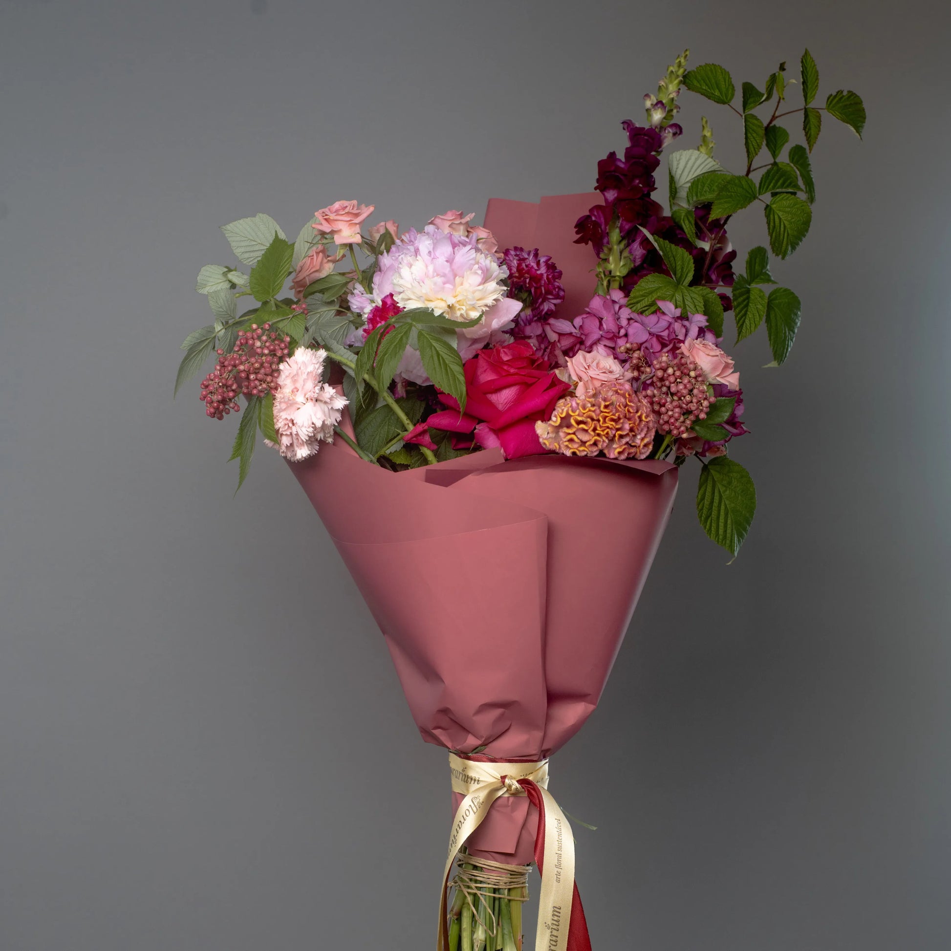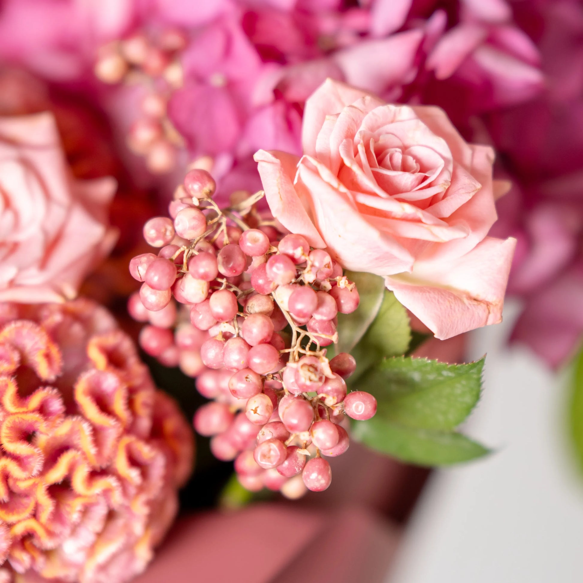 O ramo “Encanto do Jardim” é uma representação refinada do romantismo de um jardim, combinando suaves e ricos tons de rosa e bordô. A hortênsia rosa cria a base da composição, conferindo ao buquê plenitude e delicadeza. As peônias e rosas rosas adicionam leveza e elegância, destacando o caráter romântico do buquê. As rosas bordô e o antirrínio aportam profundidade e intensidade, intensificando a expressividade da composição. As celósias rosa e as bagas de pimenta rosa trazem acentos texturais, enquanto os ramos de framboesa acrescentam um toque de selvageria natural e unicidade. “Encanto do Jardim” é a escolha perfeita para quem valoriza a beleza requintada e a suavidade dos tons naturais.