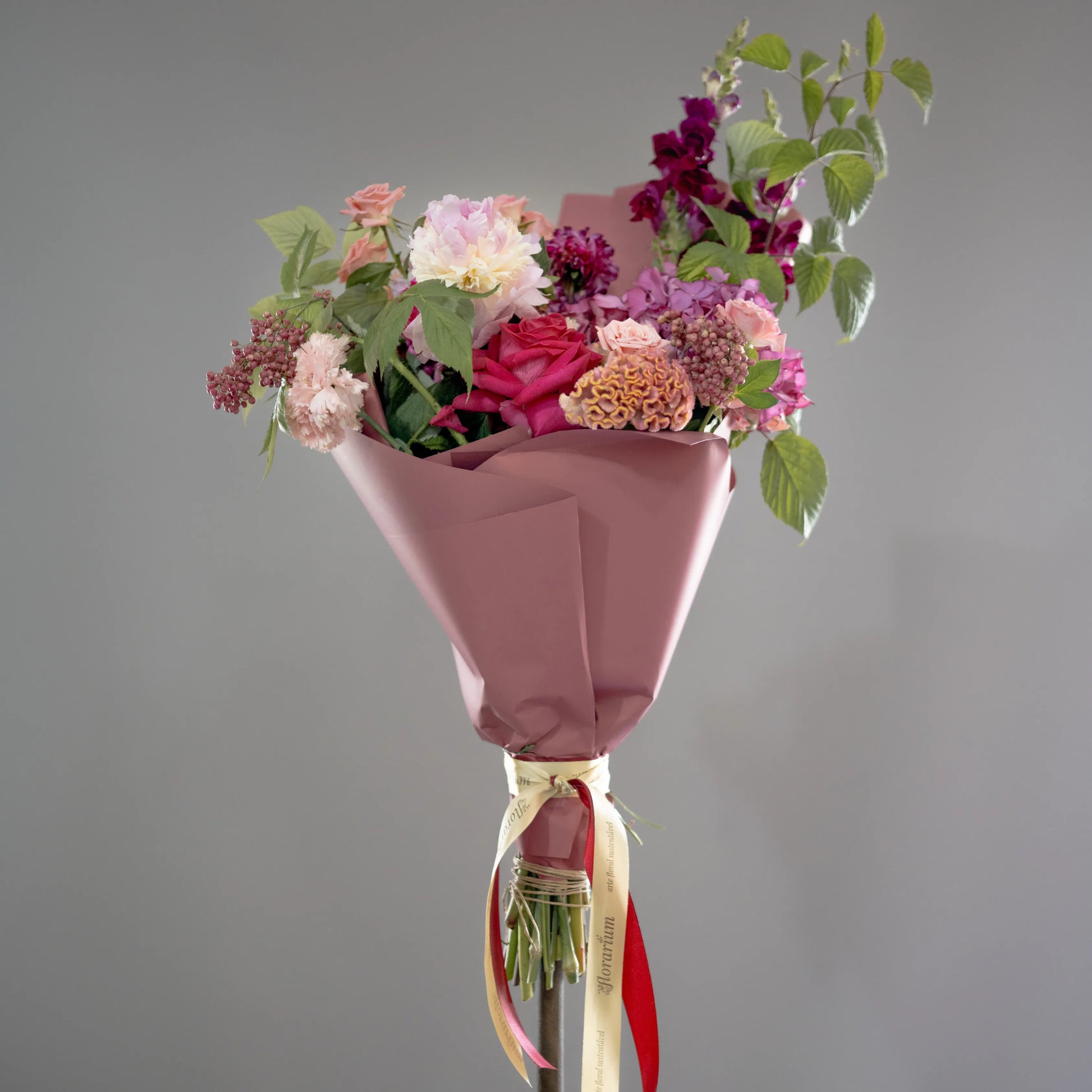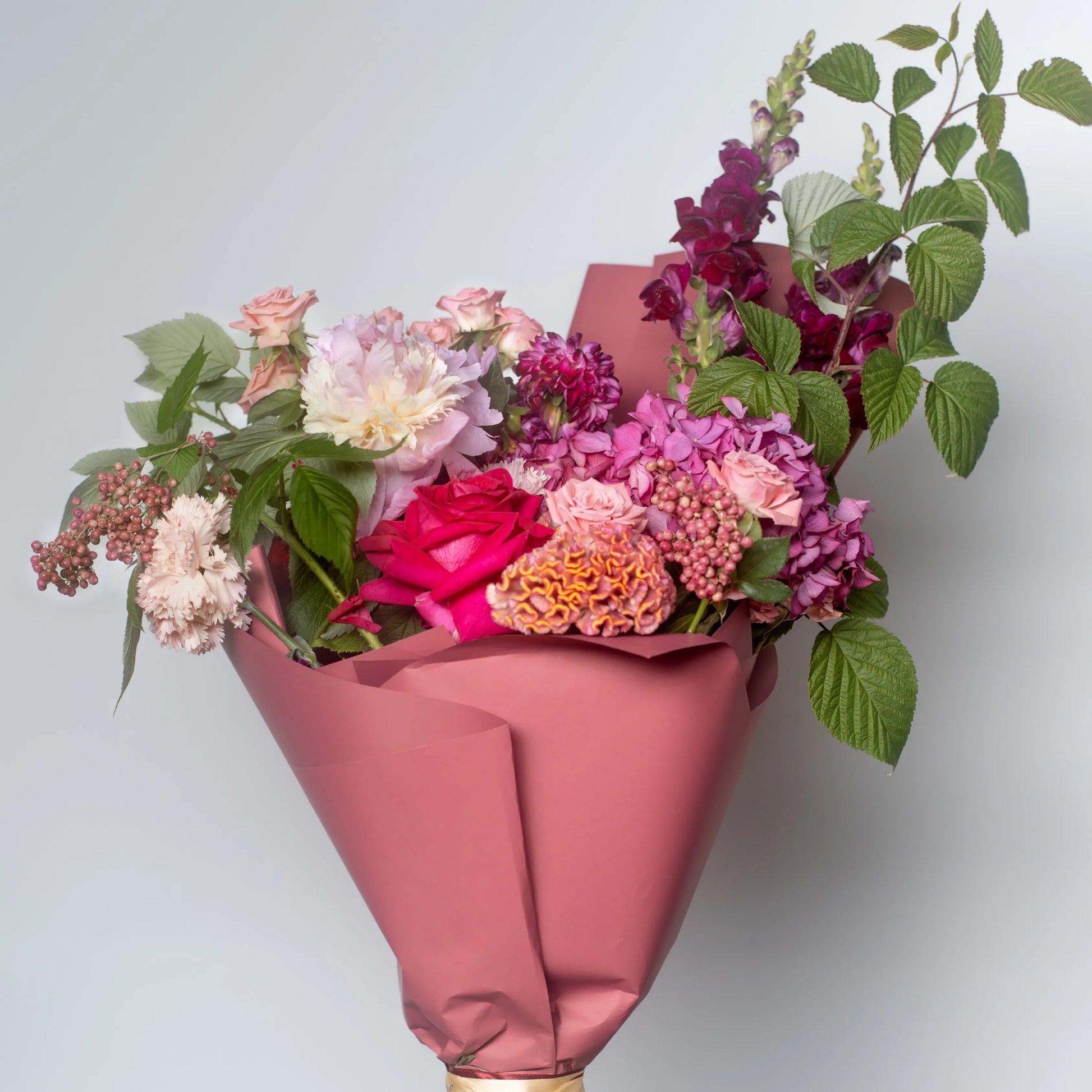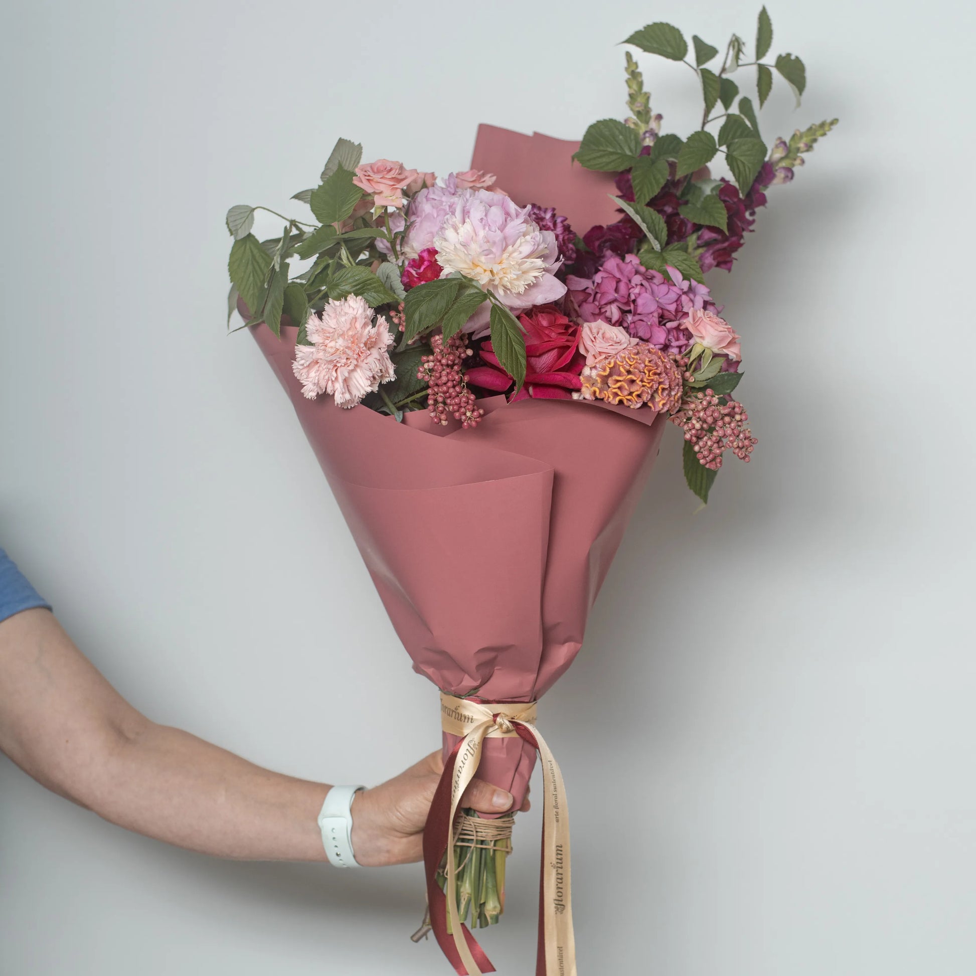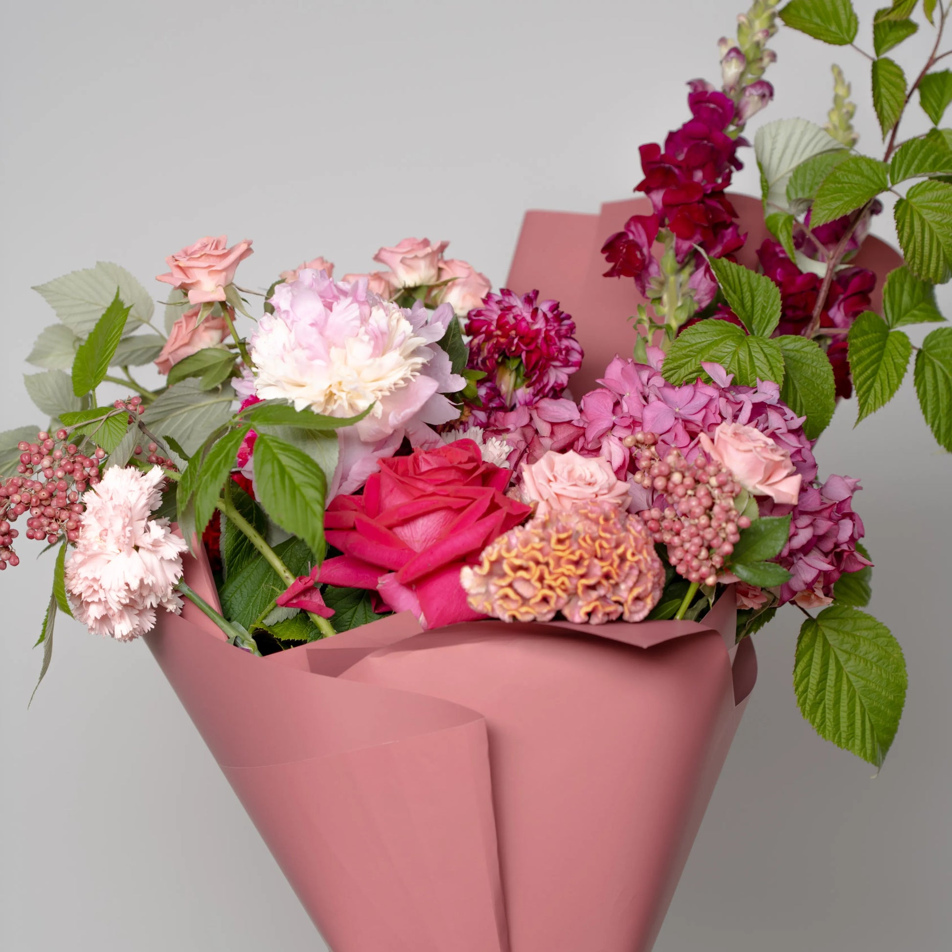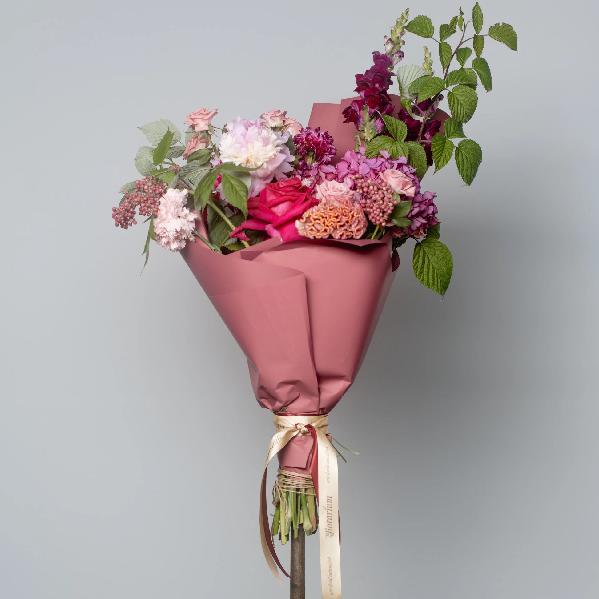 O ramo “Encanto do Jardim” é uma representação refinada do romantismo de um jardim, combinando suaves e ricos tons de rosa e bordô. A hortênsia rosa cria a base da composição, conferindo ao buquê plenitude e delicadeza. As peônias e rosas rosas adicionam leveza e elegância, destacando o caráter romântico do buquê. As rosas bordô e o antirrínio aportam profundidade e intensidade, intensificando a expressividade da composição. As celósias rosa e as bagas de pimenta rosa trazem acentos texturais, enquanto os ramos de framboesa acrescentam um toque de selvageria natural e unicidade. “Encanto do Jardim” é a escolha perfeita para quem valoriza a beleza requintada e a suavidade dos tons naturais.