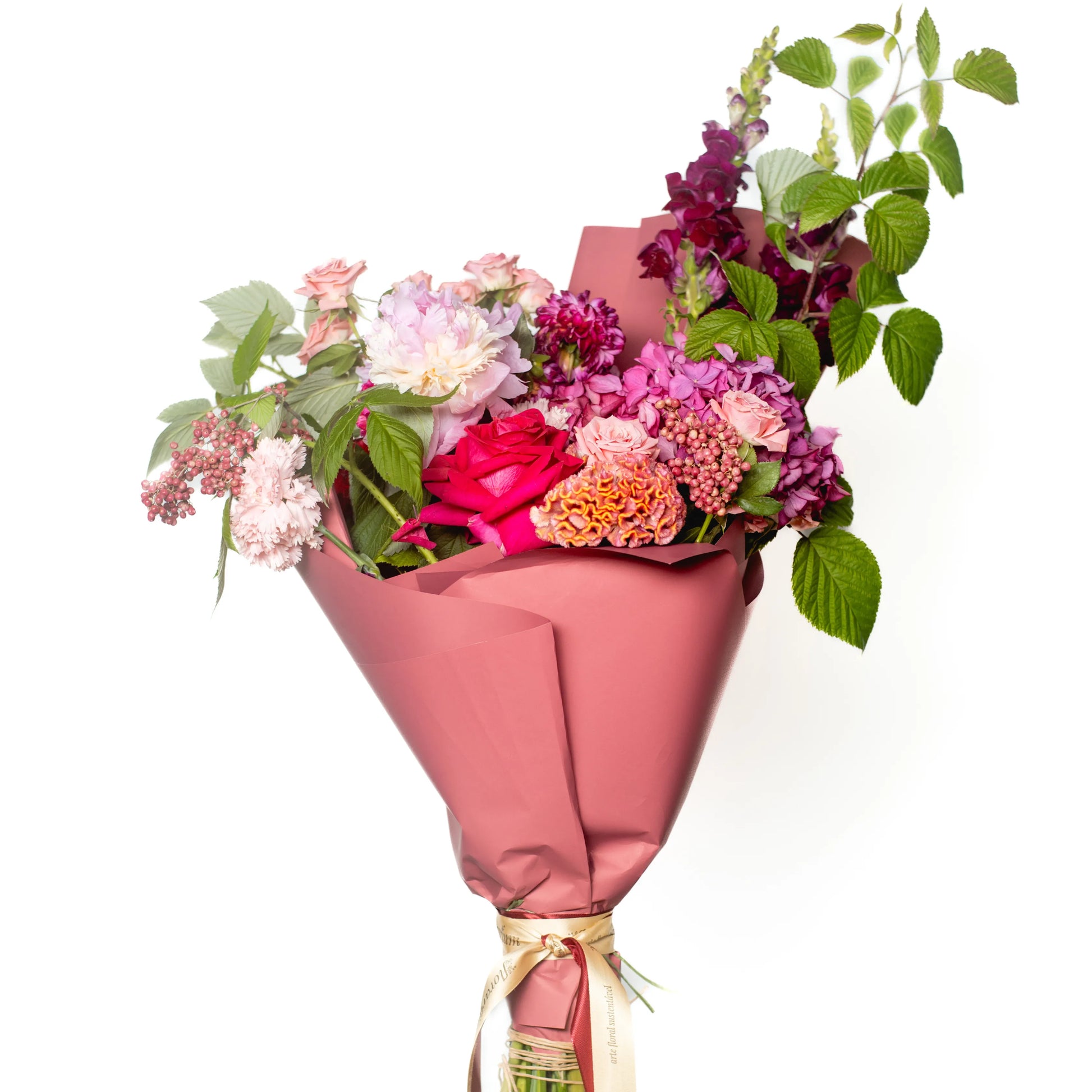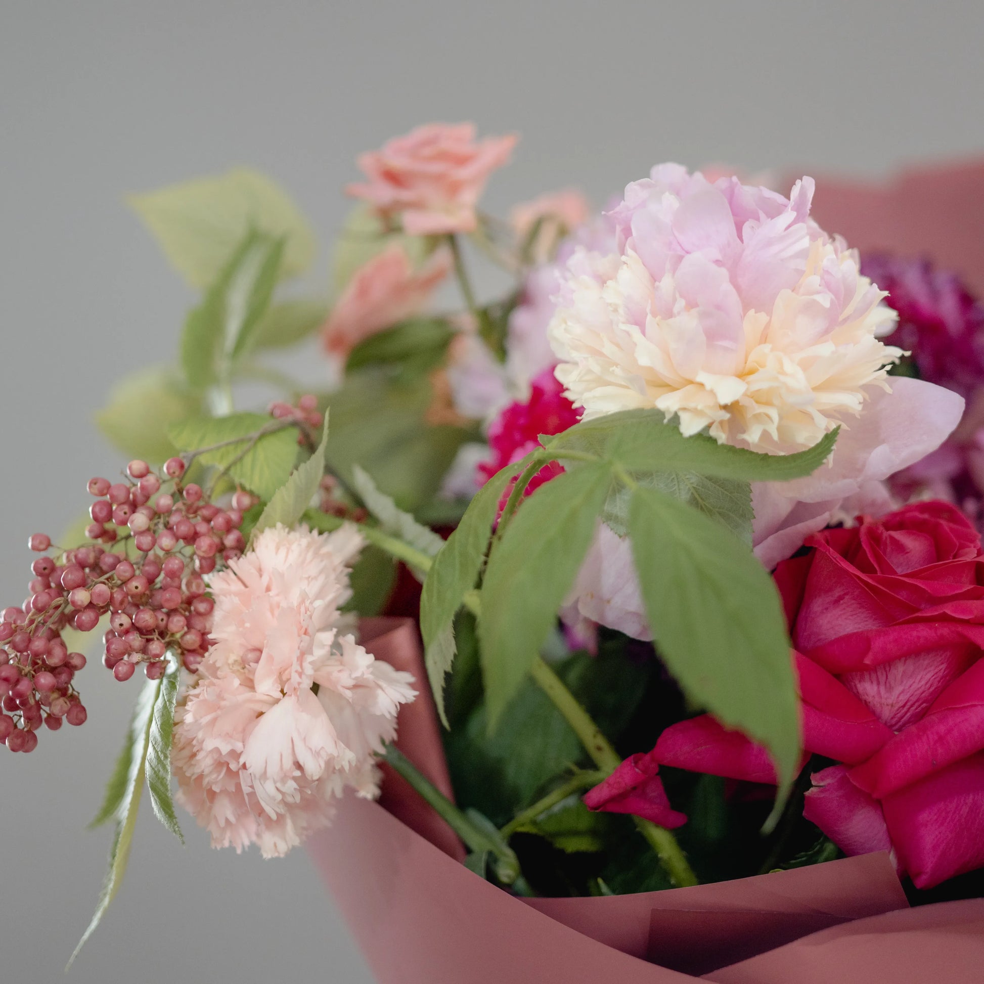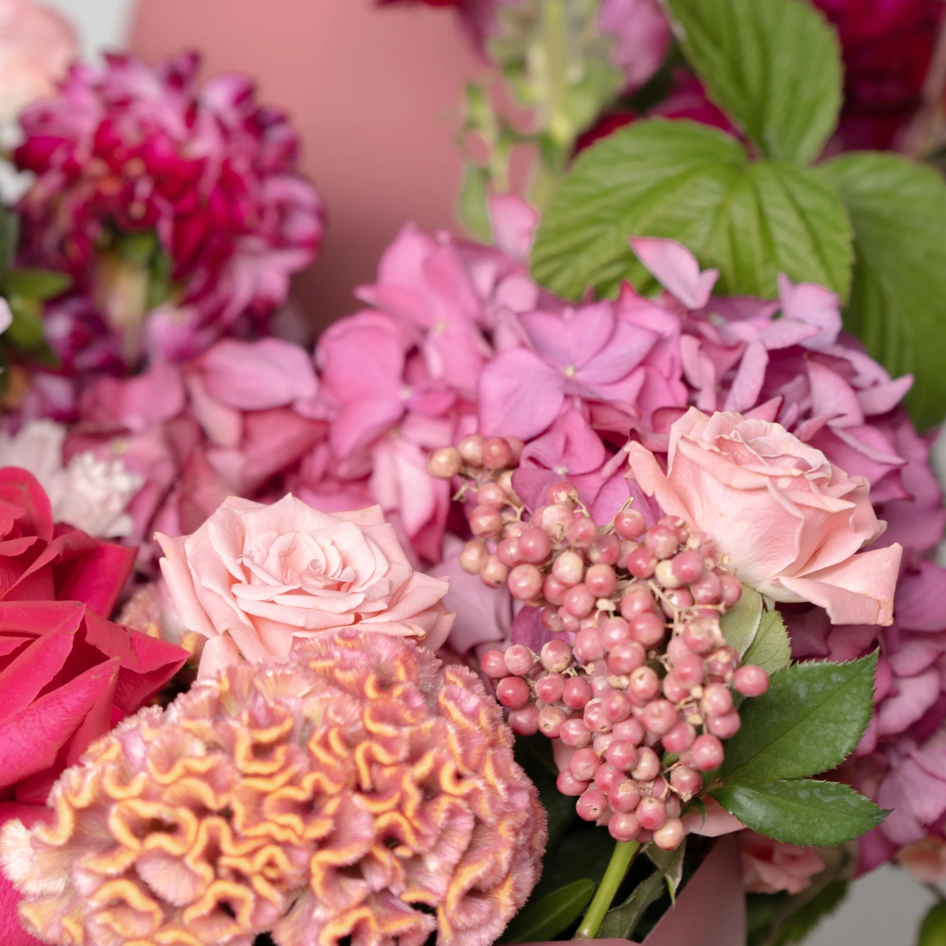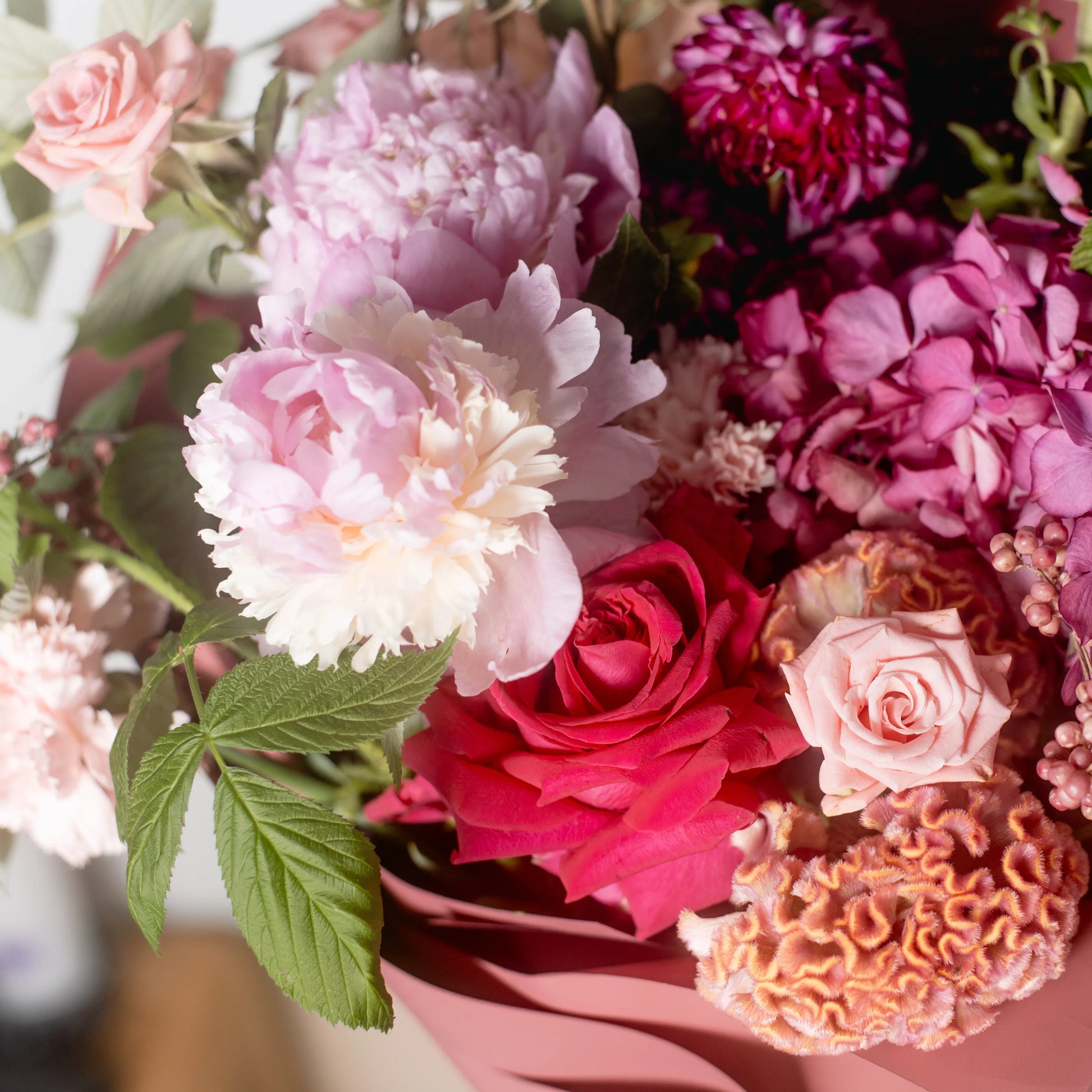 O ramo “Encanto do Jardim” é uma representação refinada do romantismo de um jardim, combinando suaves e ricos tons de rosa e bordô. A hortênsia rosa cria a base da composição, conferindo ao buquê plenitude e delicadeza. As peônias e rosas rosas adicionam leveza e elegância, destacando o caráter romântico do buquê. As rosas bordô e o antirrínio aportam profundidade e intensidade, intensificando a expressividade da composição. As celósias rosa e as bagas de pimenta rosa trazem acentos texturais, enquanto os ramos de framboesa acrescentam um toque de selvageria natural e unicidade. “Encanto do Jardim” é a escolha perfeita para quem valoriza a beleza requintada e a suavidade dos tons naturais.