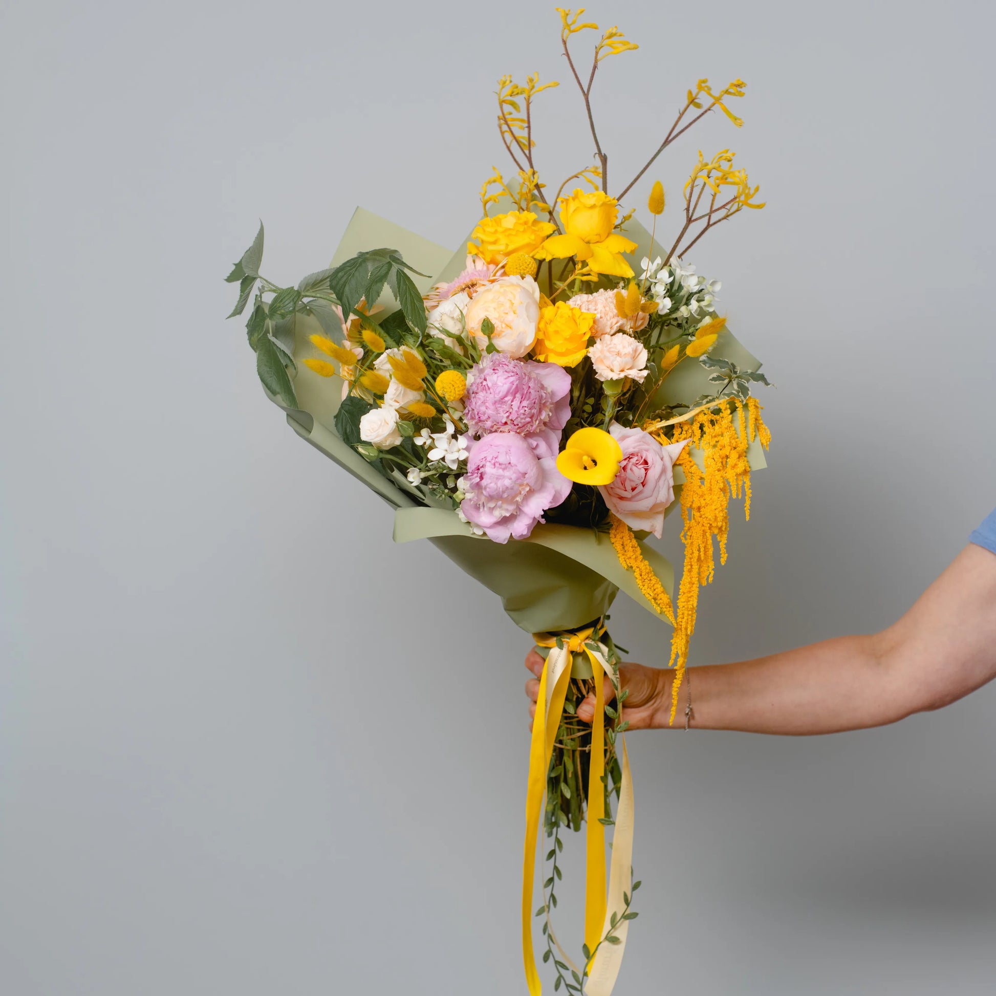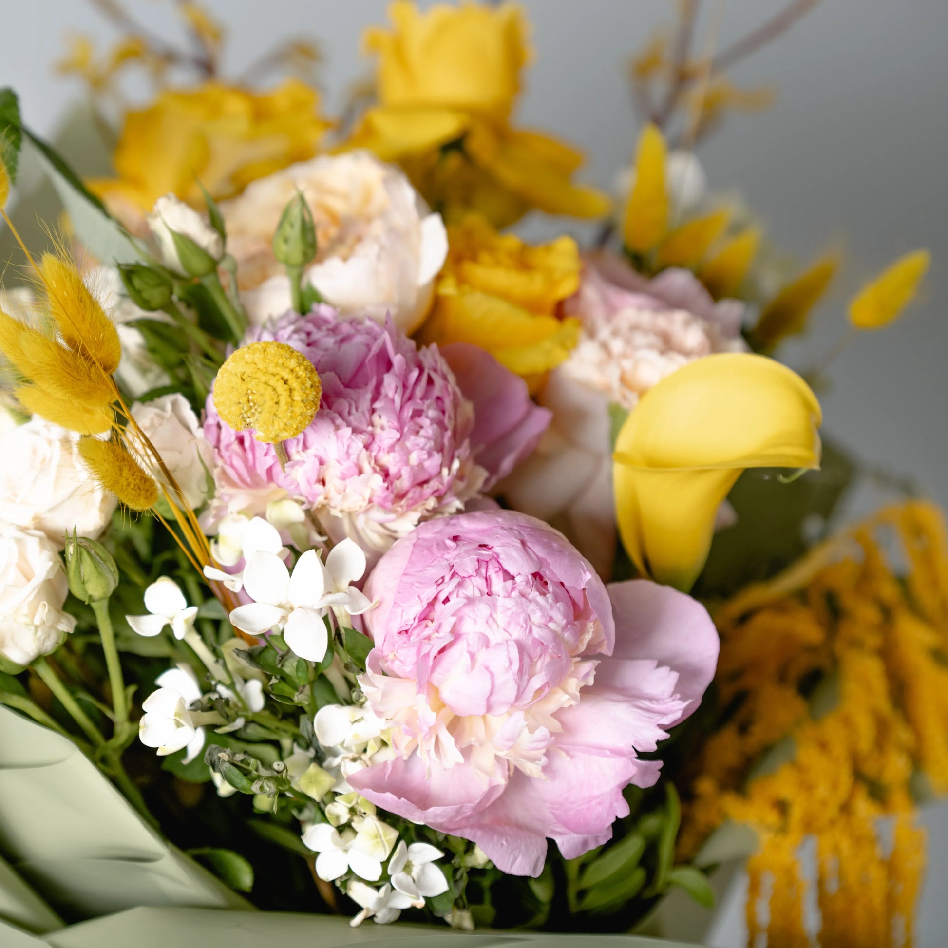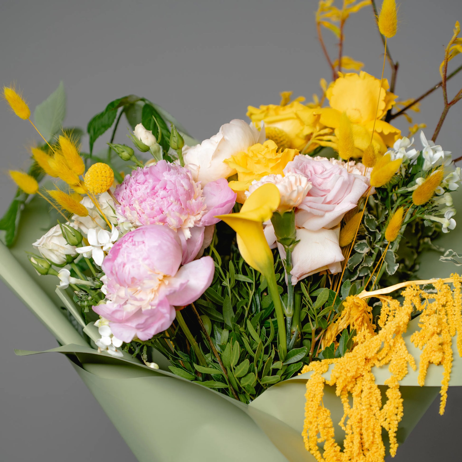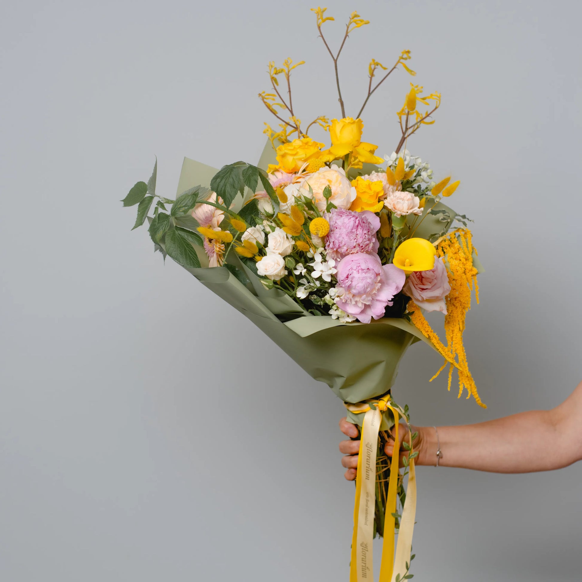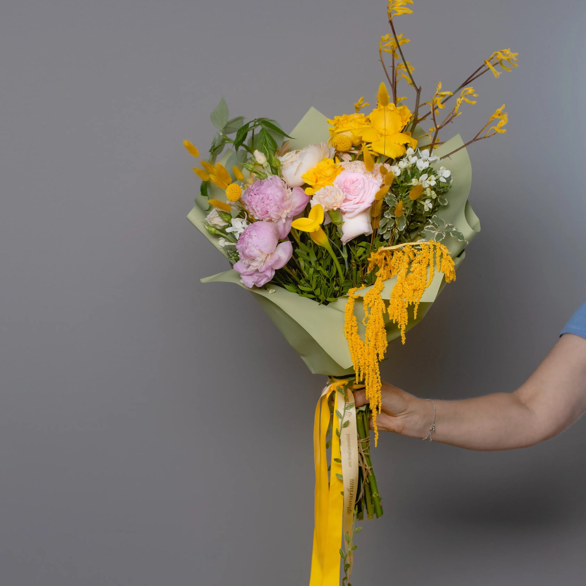 O ramo “Energia da Manhã Ensolorada” é uma combinação vibrante e alegre de flores que transmite a frescura revigorante e o calor dos primeiros raios de sol. As peônias rosas simbolizam a ternura e o romantismo da manhã, entrelaçando-se suavemente com as rosas rosa claro, que adicionam ao buquê uma elegância refinada. As rosas e jarros amarelas brilhantes personificam a luz solar e a alegria de um novo dia, enchendo a composição de energia e otimismo. O oxipétalo branco traz um toque de frescor e pureza, enquanto os ramos de anigozanthos amarelos acrescentam acentos texturais, destacando a beleza natural do ramo. “Energia da Manhã Ensolorado” é a maneira perfeita de começar o dia com positividade e pensamentos iluminados.