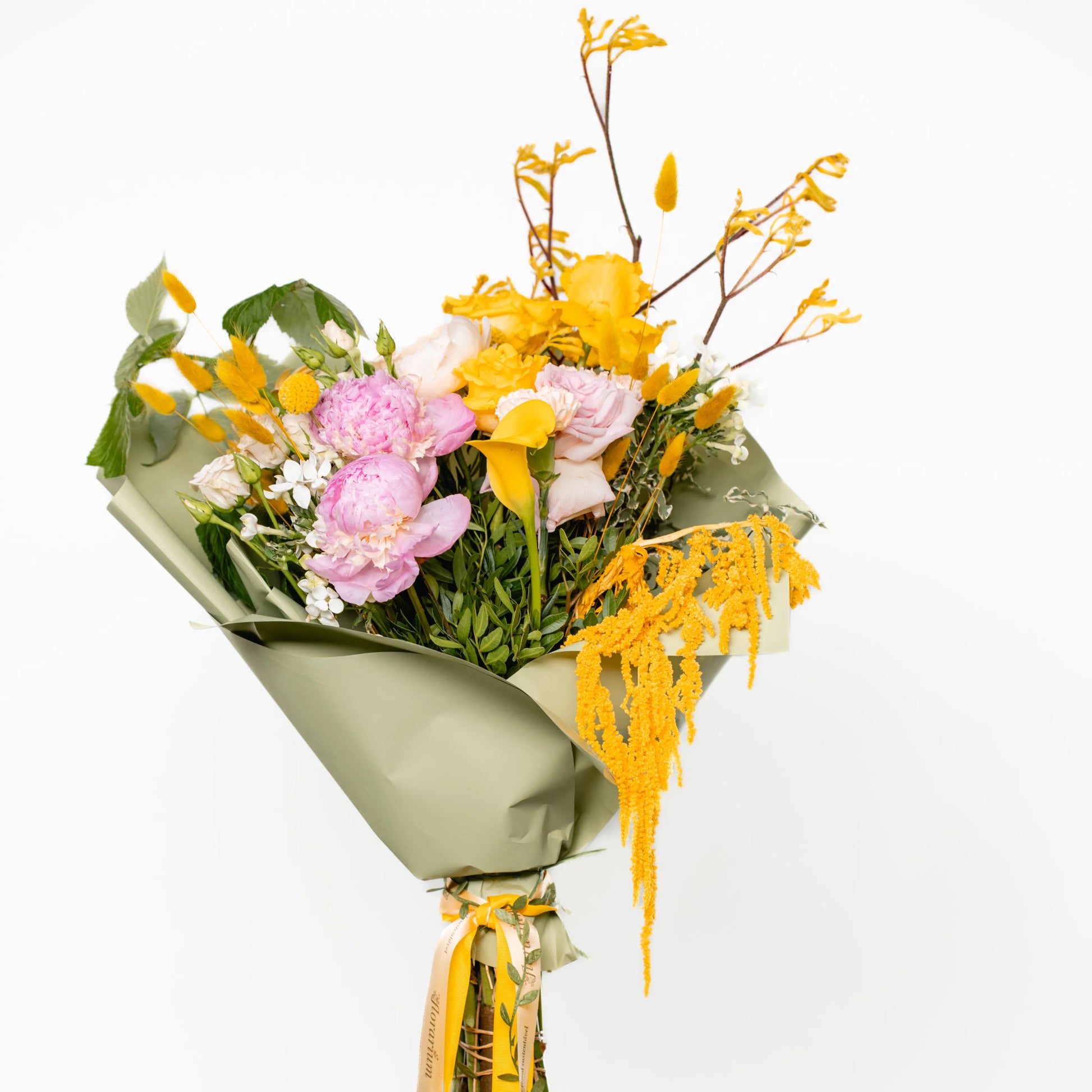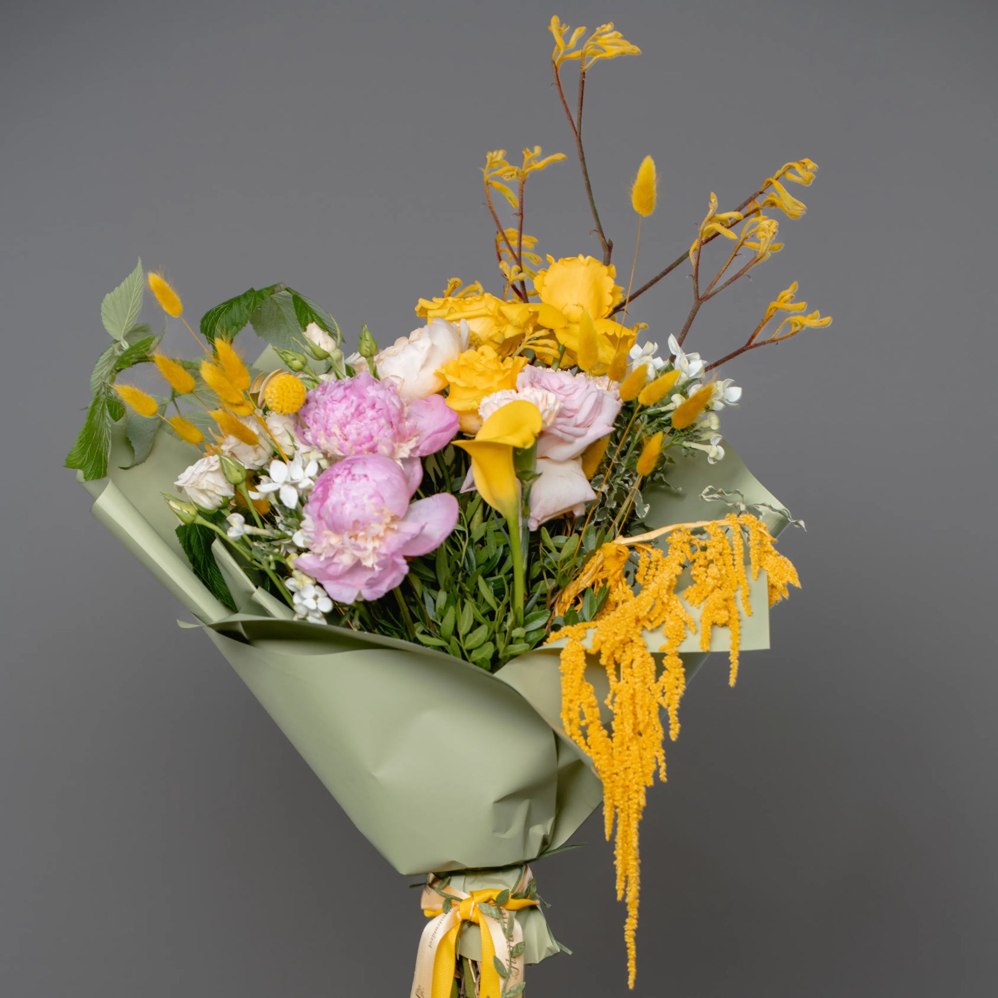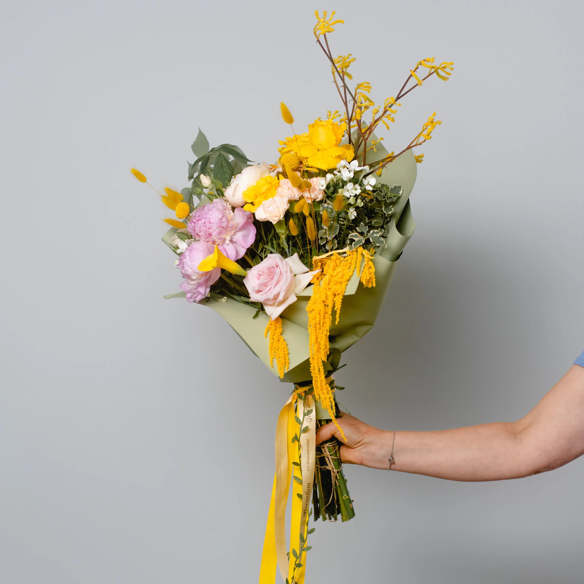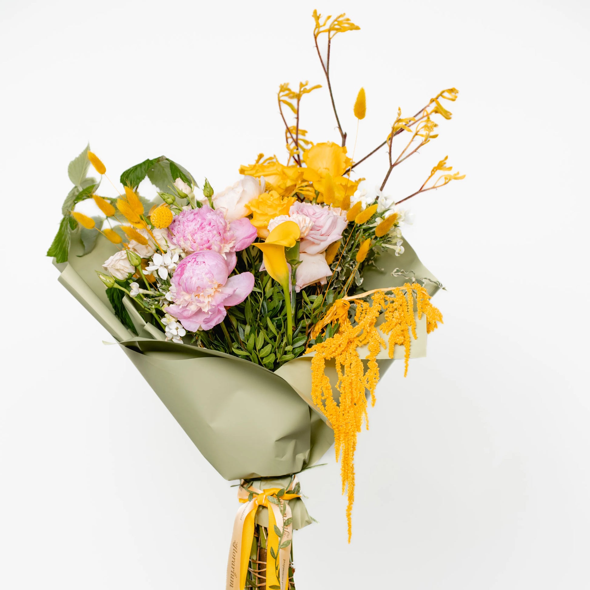 O ramo “Energia da Manhã Ensolorada” é uma combinação vibrante e alegre de flores que transmite a frescura revigorante e o calor dos primeiros raios de sol. As peônias rosas simbolizam a ternura e o romantismo da manhã, entrelaçando-se suavemente com as rosas rosa claro, que adicionam ao buquê uma elegância refinada. As rosas e jarros amarelas brilhantes personificam a luz solar e a alegria de um novo dia, enchendo a composição de energia e otimismo. O oxipétalo branco traz um toque de frescor e pureza, enquanto os ramos de anigozanthos amarelos acrescentam acentos texturais, destacando a beleza natural do ramo. “Energia da Manhã Ensolorado” é a maneira perfeita de começar o dia com positividade e pensamentos iluminados.