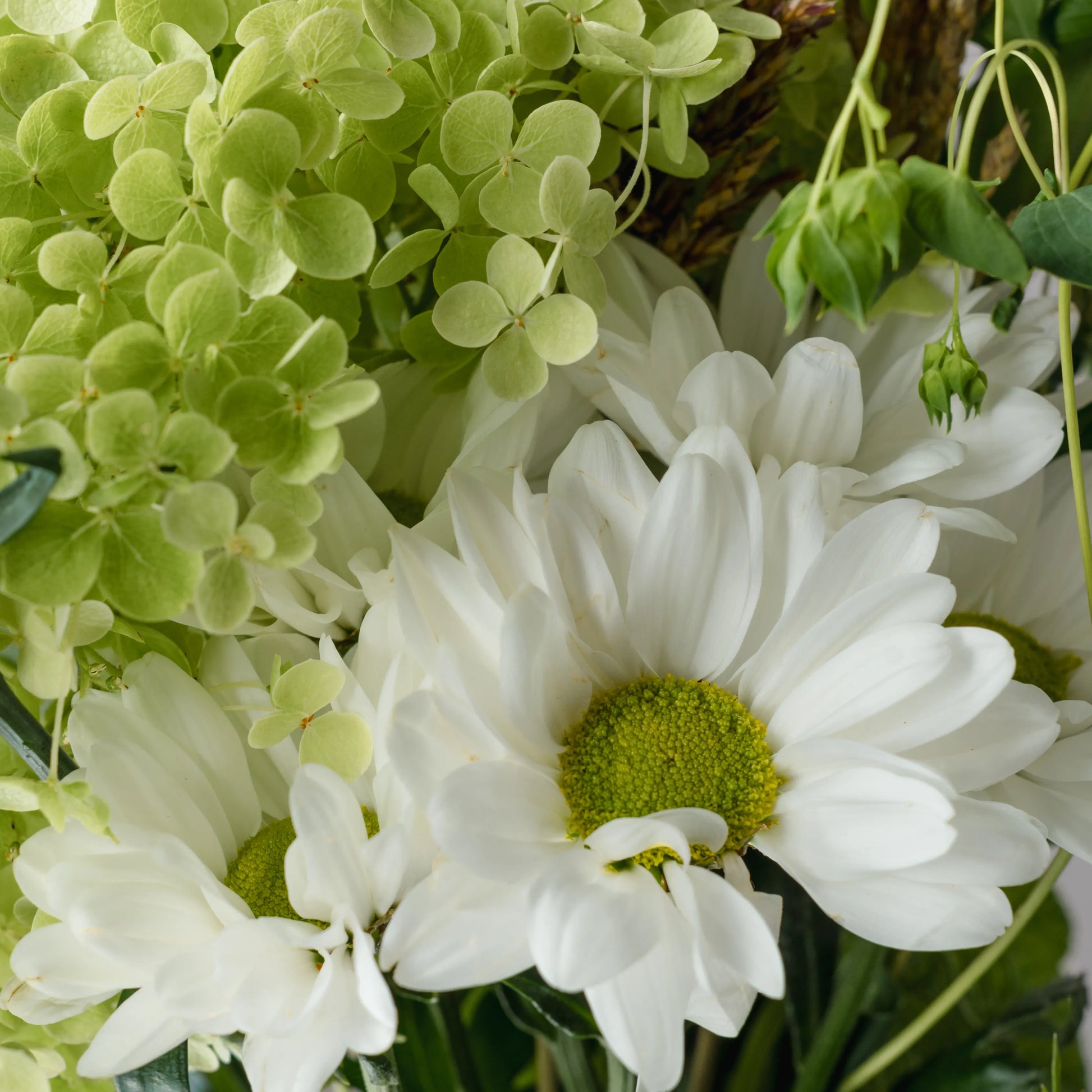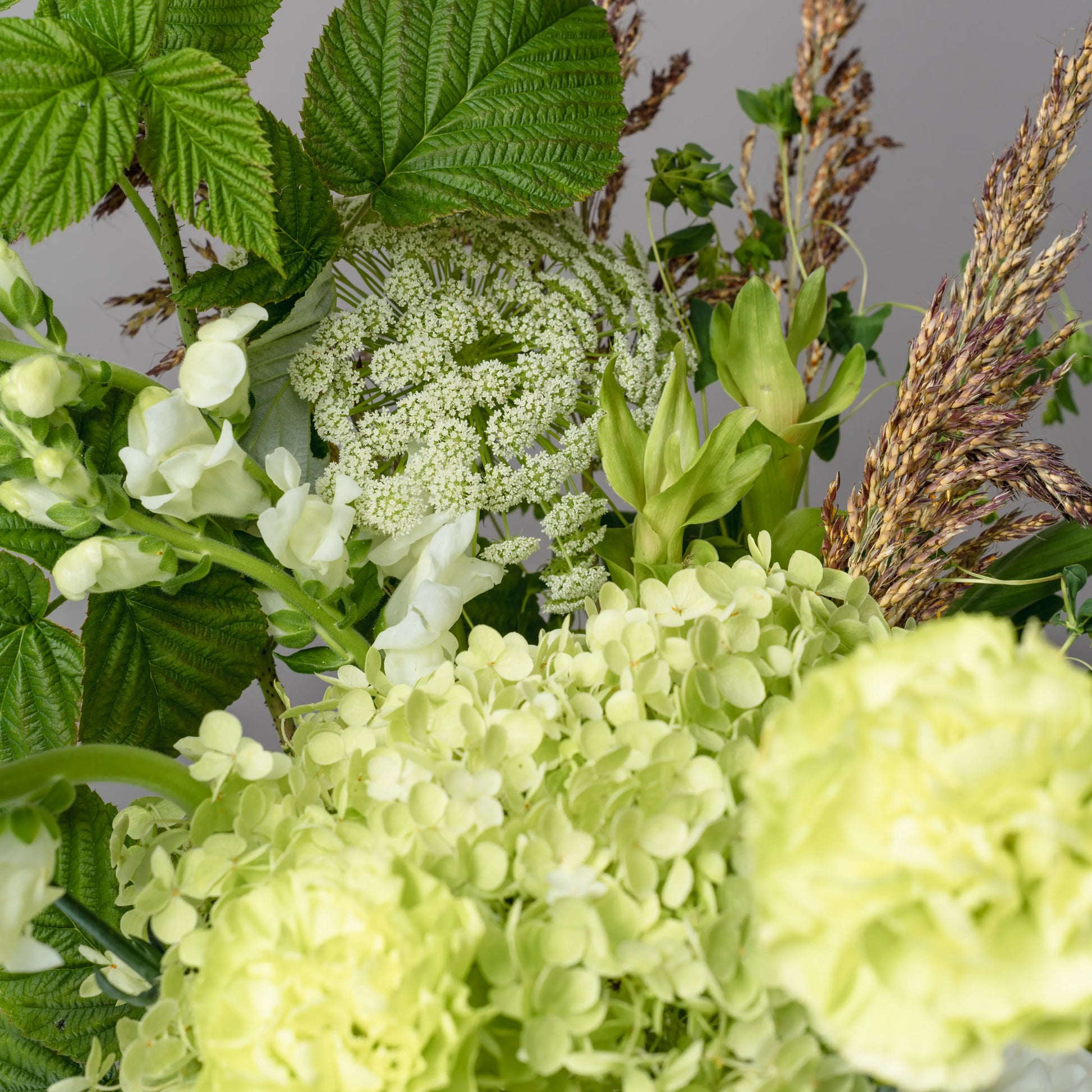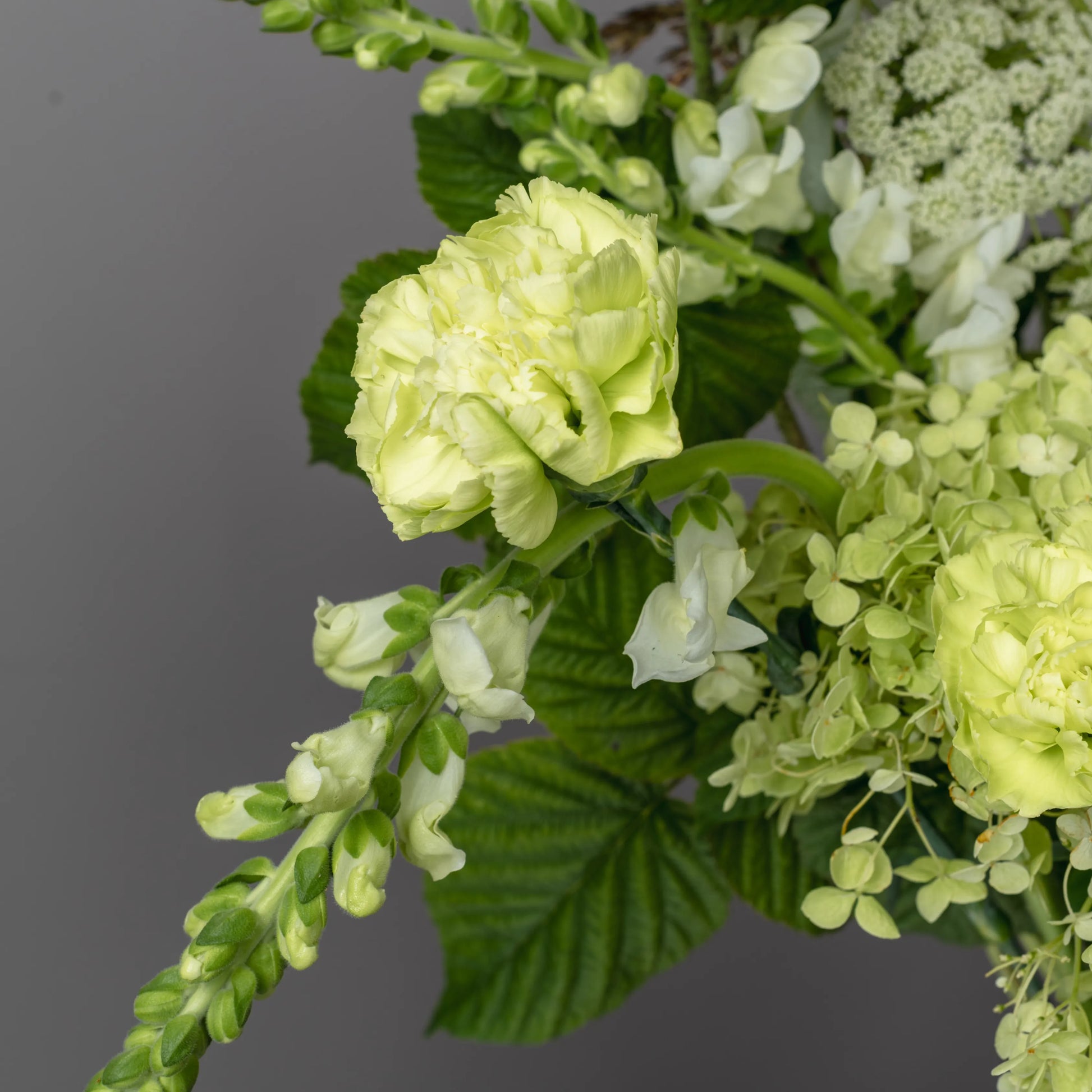 O ramo “Green Mix” é uma composição fresca e natural, reunida nos mais requintados tons de verde. A hortênsia verde cria volume e suavidade, tornando-se a base do ramo. O viburno e a alchemila adicionam textura e leveza, destacando a beleza natural e a simplicidade. Os cravos de cor de menta e o antúrio esverdeado conferem ao ramo suaves tons de frescor, lembrando uma manhã fresca de verão. As ervas campestres e os ramos de framboesa completam a composição, adicionando toques naturais leves e criando uma sensação de verdadeira harmonia verde. O ramo “Green Mix” simboliza simplicidade e sofisticação natural, proporcionando uma sensação de tranquilidade e frescor.