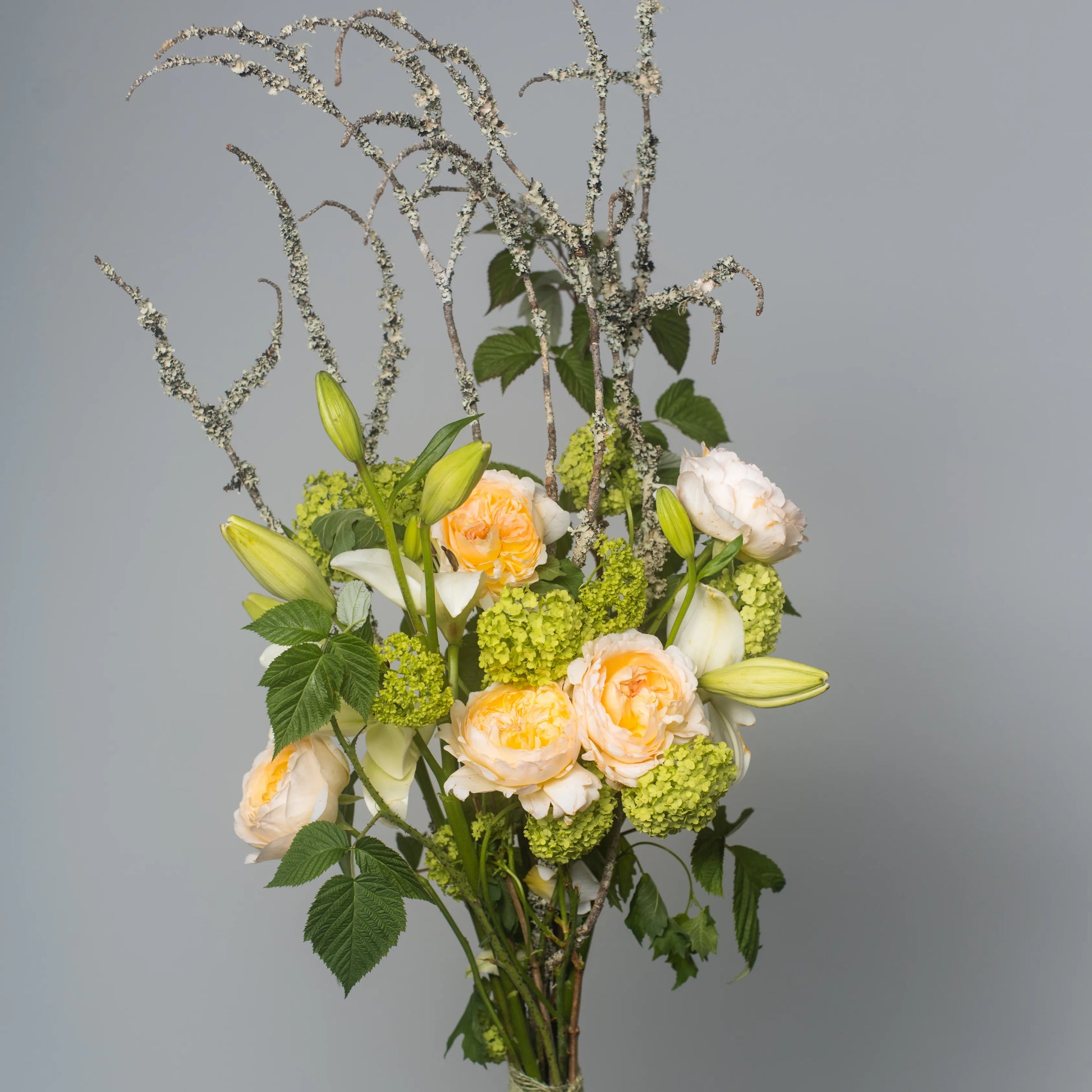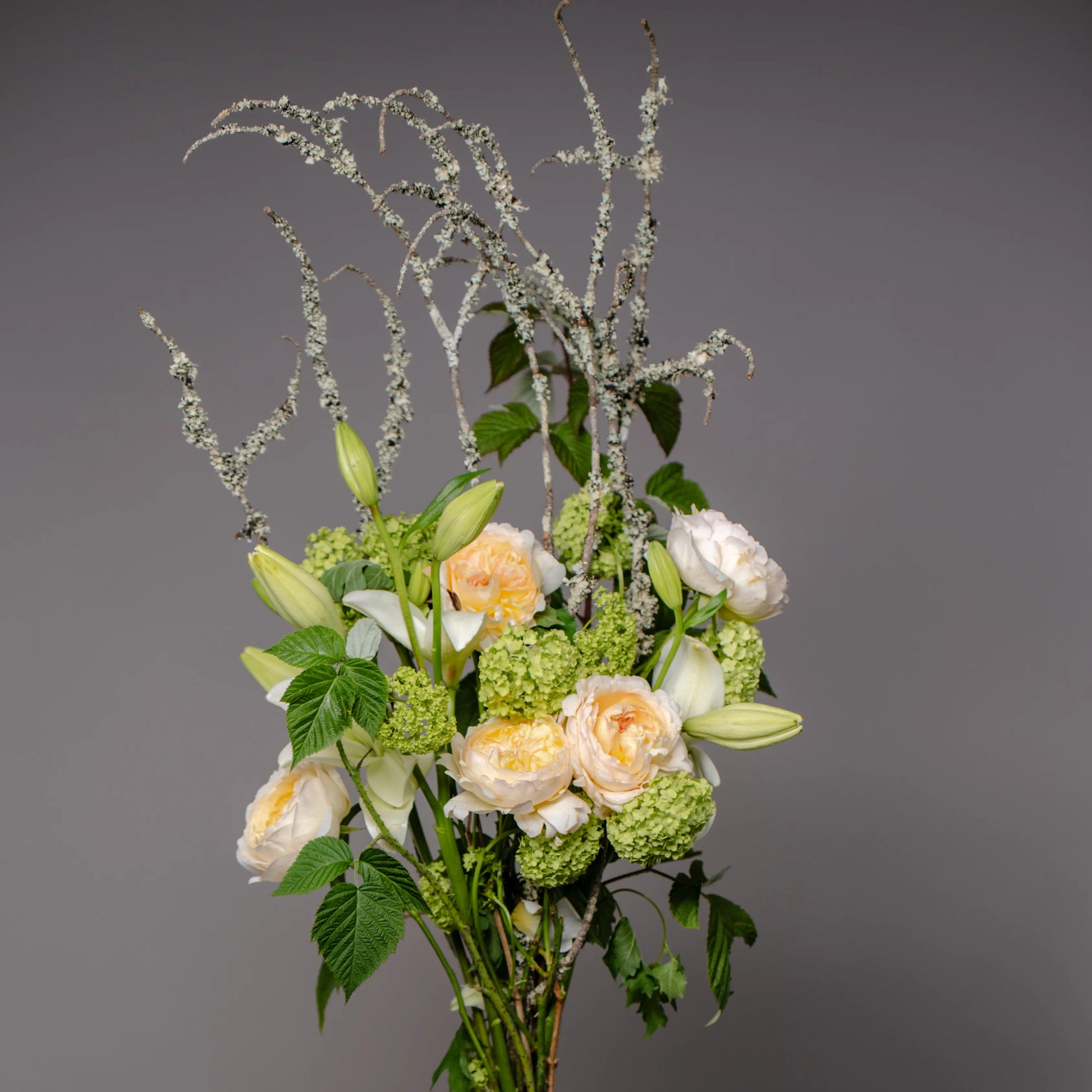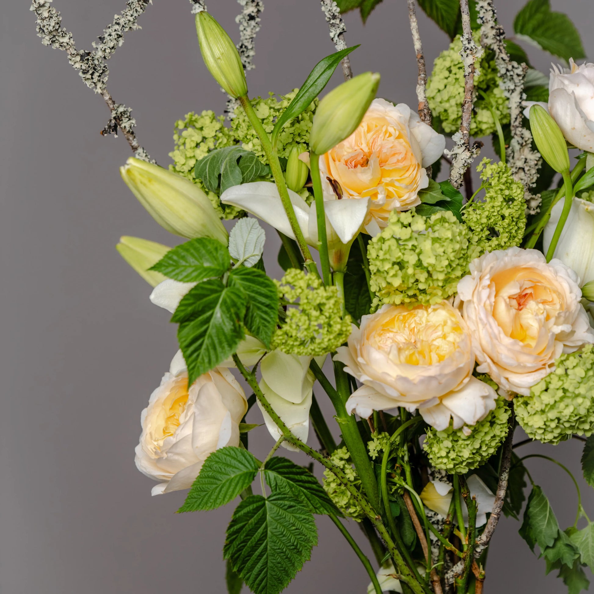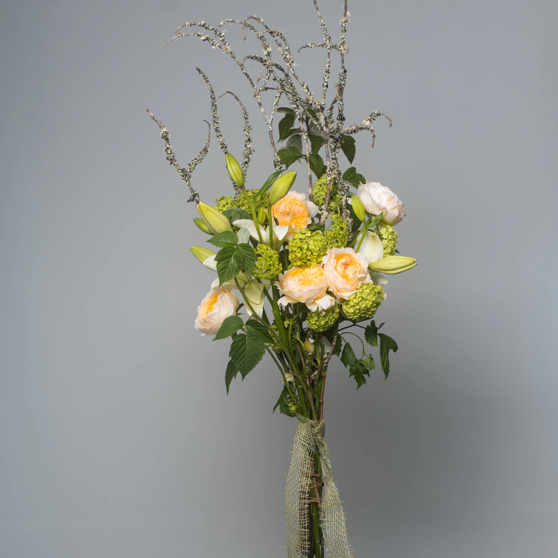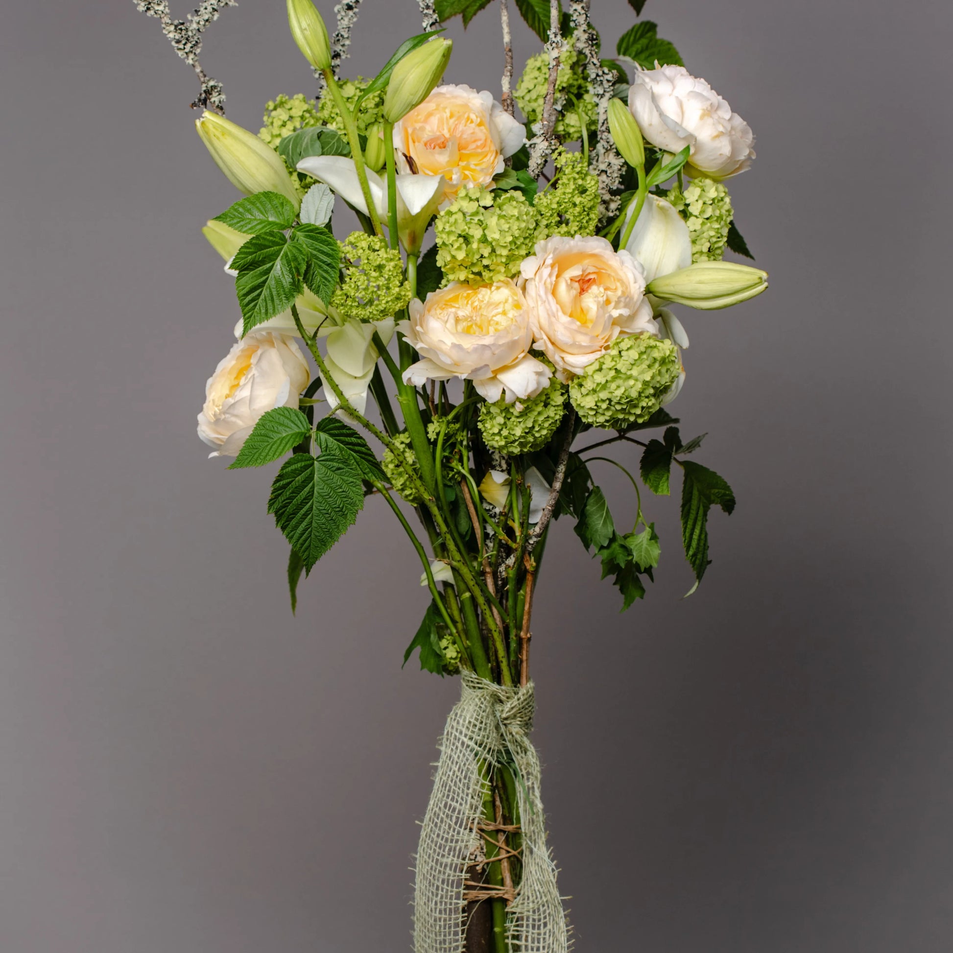 O ramo “Jardim Selvagem” é uma combinação refinada de beleza natural e elegância descontraída. As rosas pêssego em forma de peônia criam uma base calorosa e romântica, simbolizando ternura e harmonia. As lírios brancos adicionam sofisticação e pureza ao buquê, seus grandes flores lembram a tranquilidade e a majestade da natureza. Os ramos de framboesa conferem vivacidade e um toque de selvageria à composição, realçando a beleza natural. O viburno adiciona frescor e acentos vibrantes, enquanto os magníficos ramos com musgo completam o visual, trazendo ao buquê uma sensação de profundidade e mistério da floresta. “Jardim Selvagem” é a escolha perfeita para quem deseja mergulhar na atmosfera da natureza selvagem e trazer uma parte dela para casa.