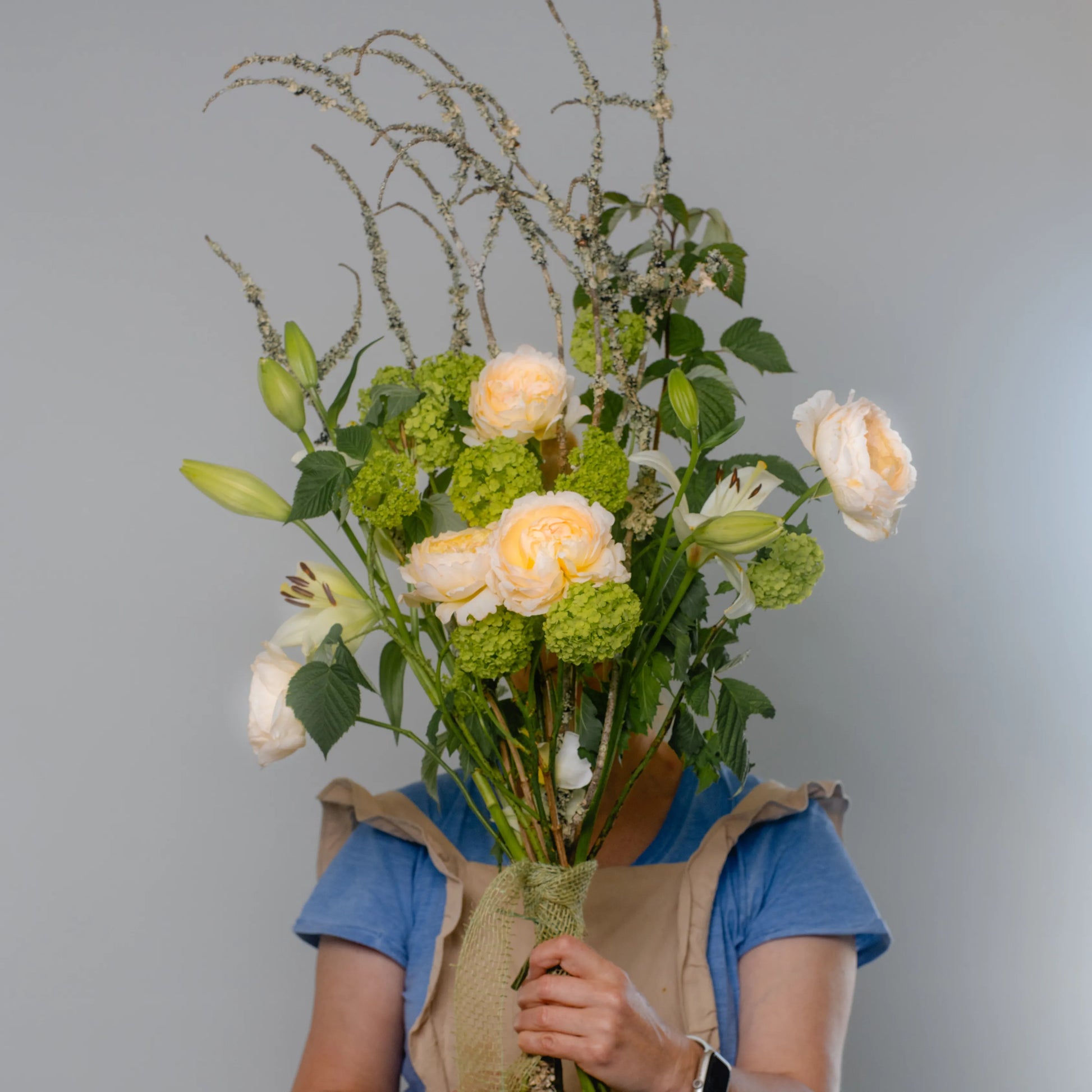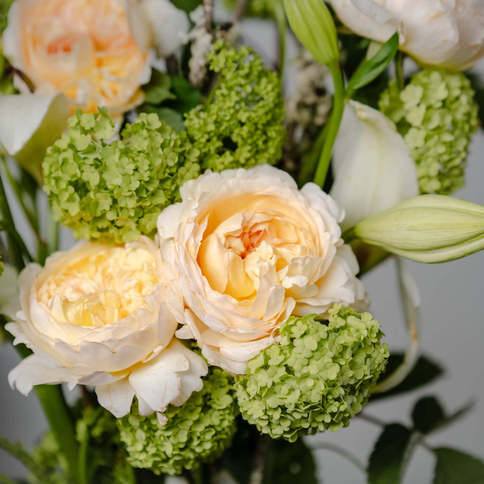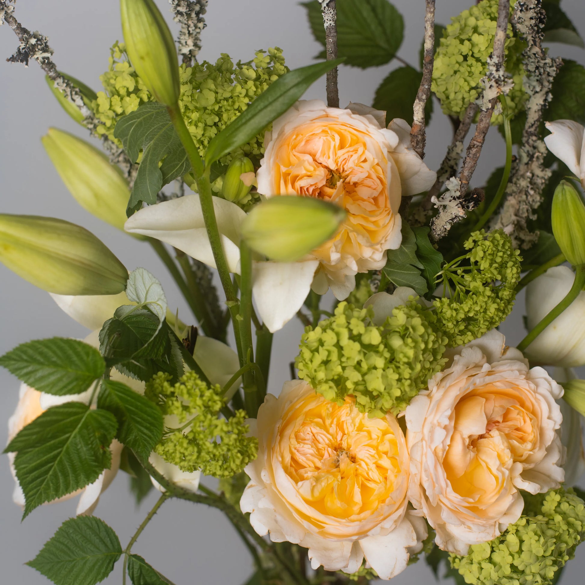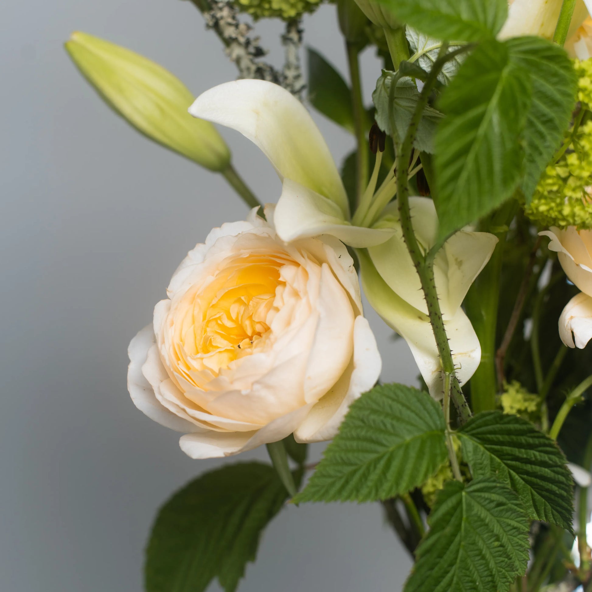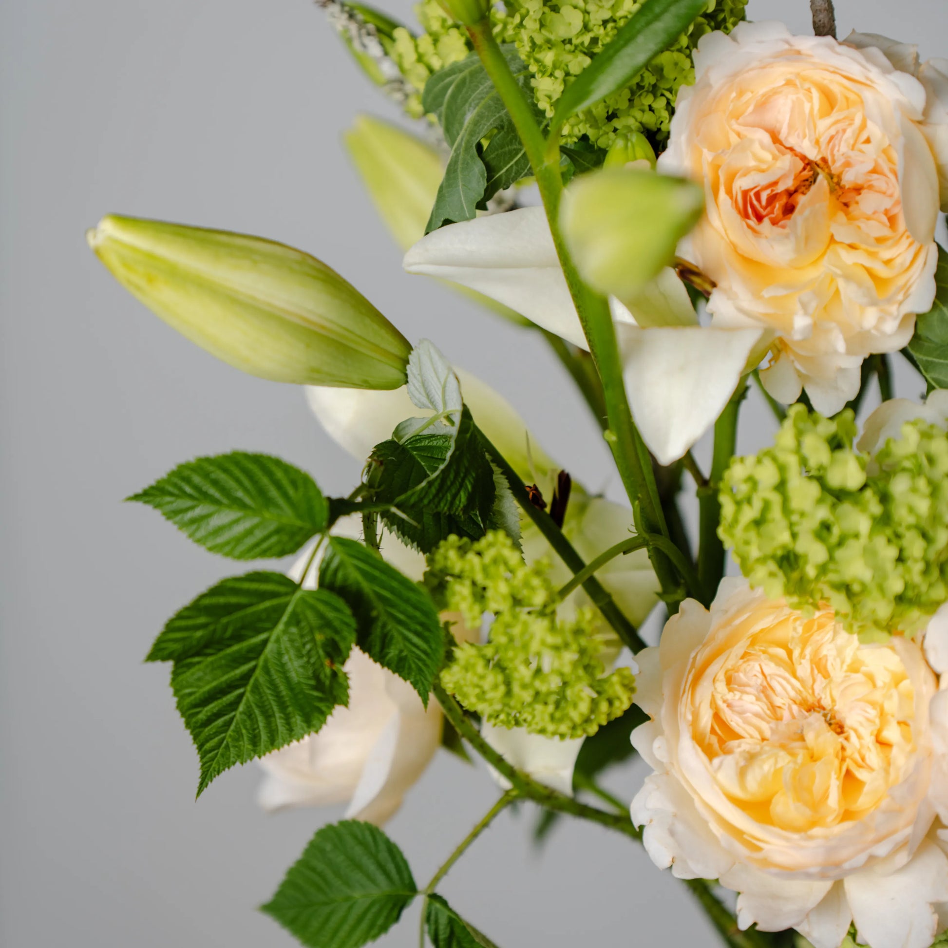 O ramo “Jardim Selvagem” é uma combinação refinada de beleza natural e elegância descontraída. As rosas pêssego em forma de peônia criam uma base calorosa e romântica, simbolizando ternura e harmonia. As lírios brancos adicionam sofisticação e pureza ao buquê, seus grandes flores lembram a tranquilidade e a majestade da natureza. Os ramos de framboesa conferem vivacidade e um toque de selvageria à composição, realçando a beleza natural. O viburno adiciona frescor e acentos vibrantes, enquanto os magníficos ramos com musgo completam o visual, trazendo ao buquê uma sensação de profundidade e mistério da floresta. “Jardim Selvagem” é a escolha perfeita para quem deseja mergulhar na atmosfera da natureza selvagem e trazer uma parte dela para casa.