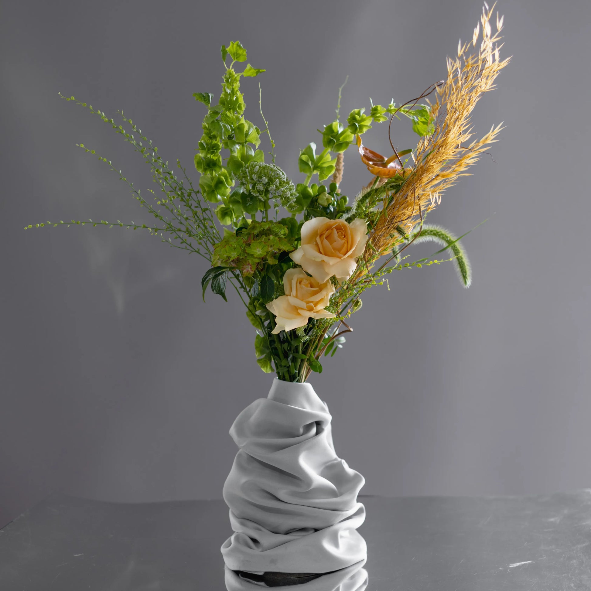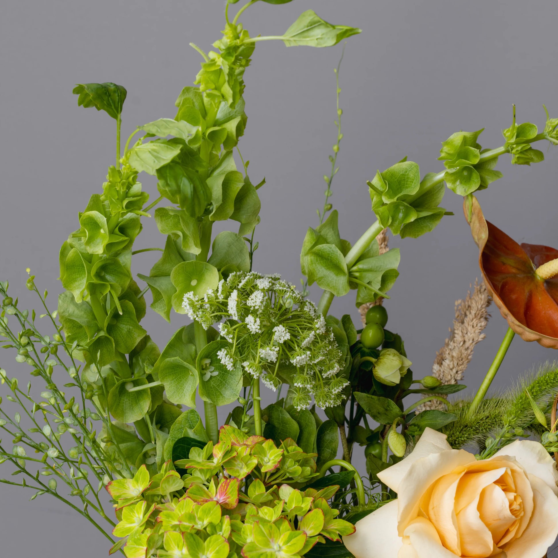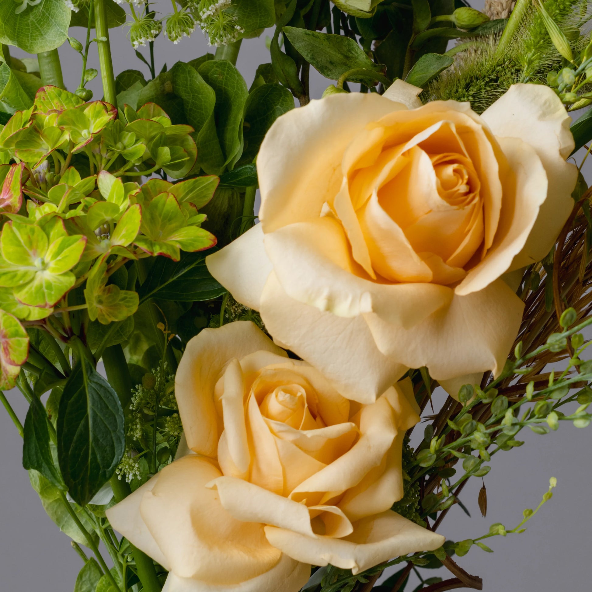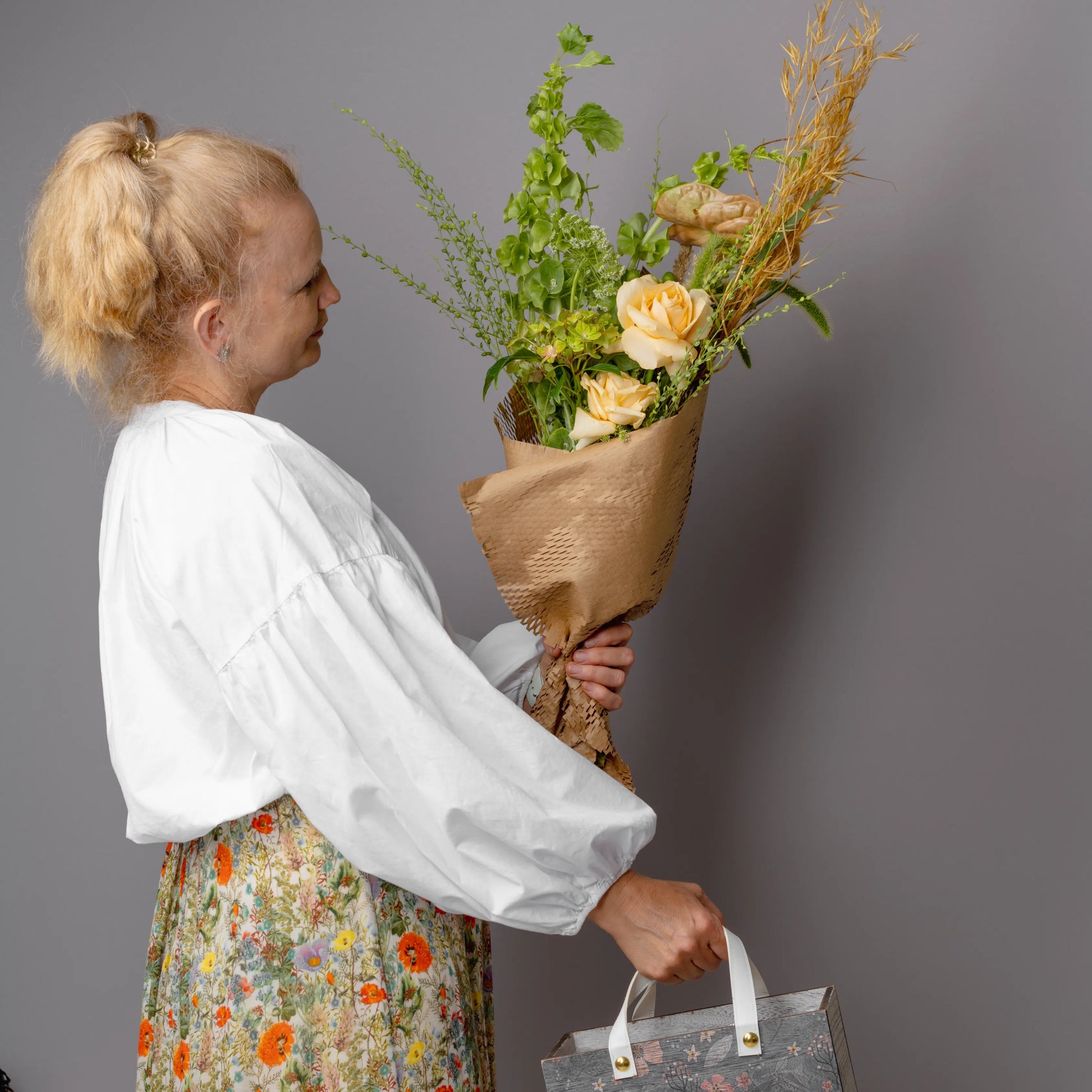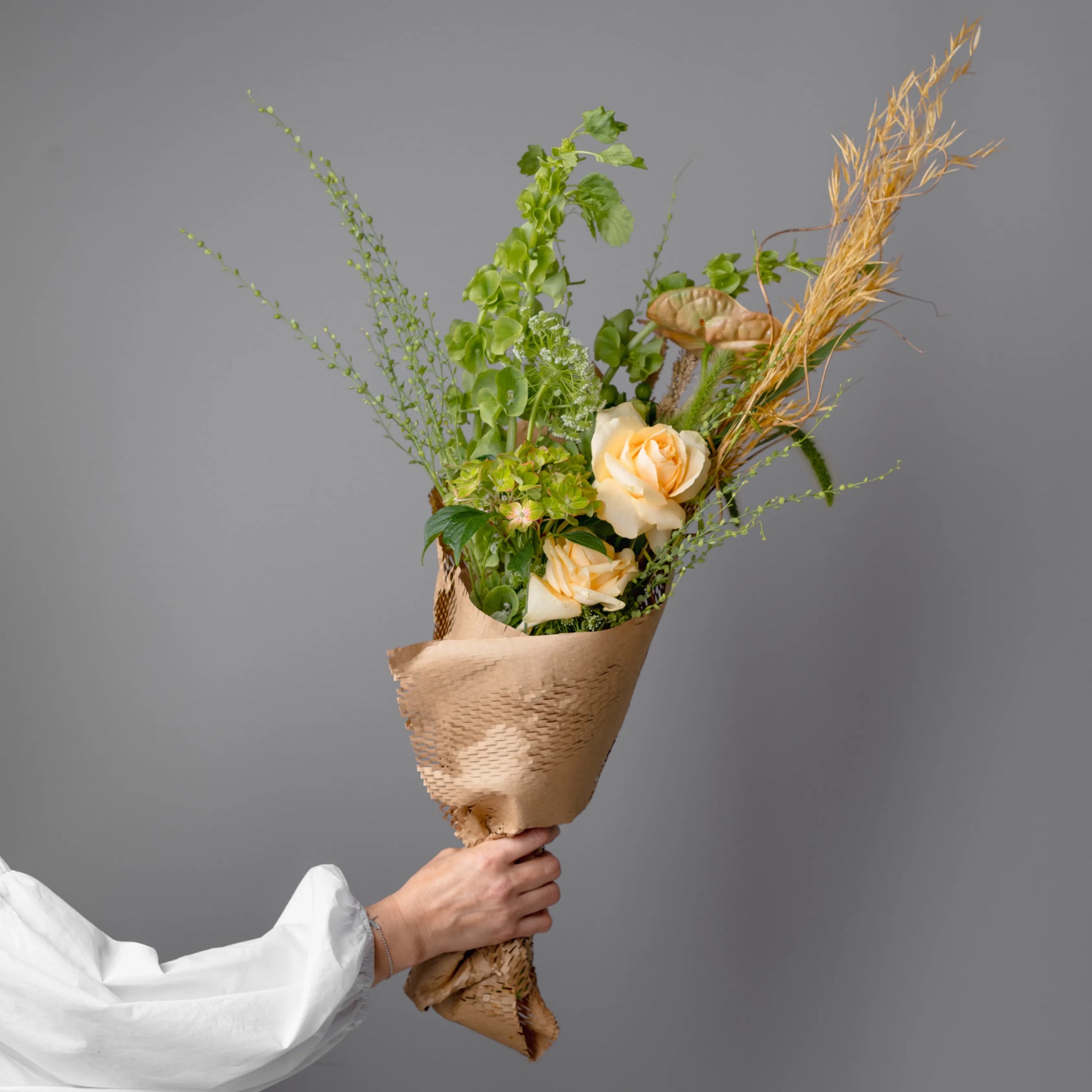 O ramo “Reflexões” é uma elegante combinação de tons verde-creme e bege, complementados por ervas campestres e delicadas rosas de cor bege. Este ramo personifica a tranquilidade e a reflexão, despertando memórias calorosas e sonhos sobre o futuro. Os elementos naturais e as cores suaves criam uma atmosfera de paz e harmonia, ideal para quem aprecia a beleza da natureza e momentos de silêncio.