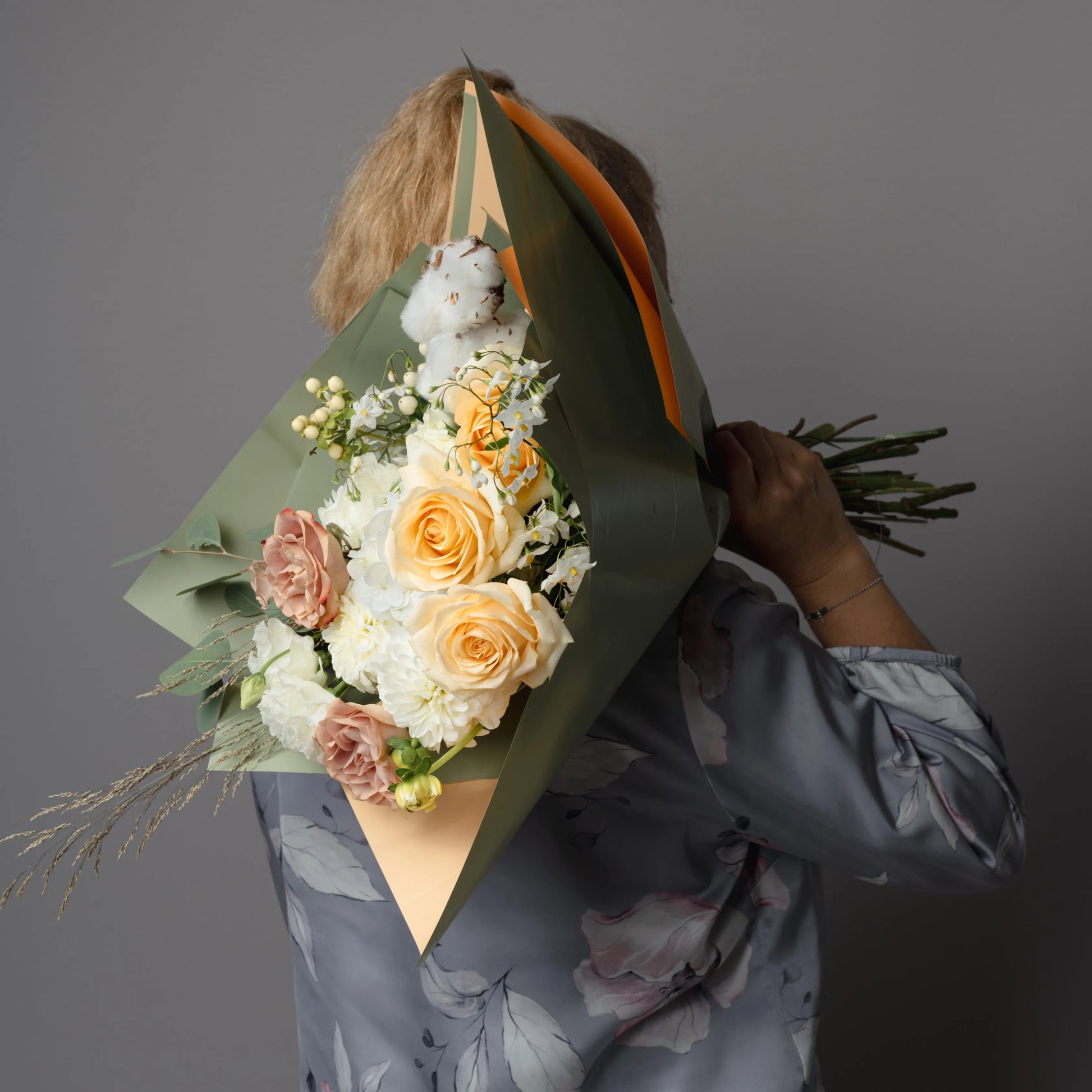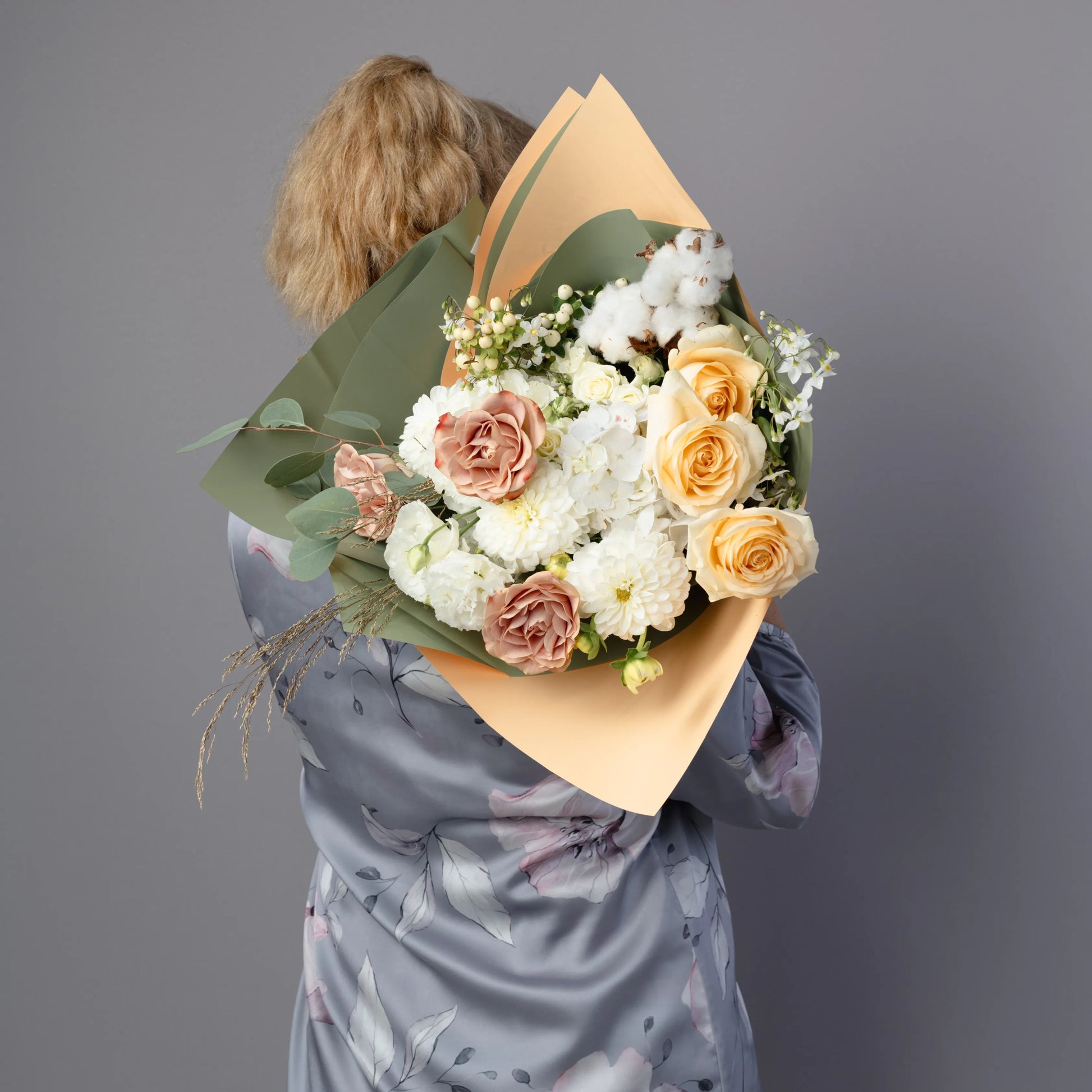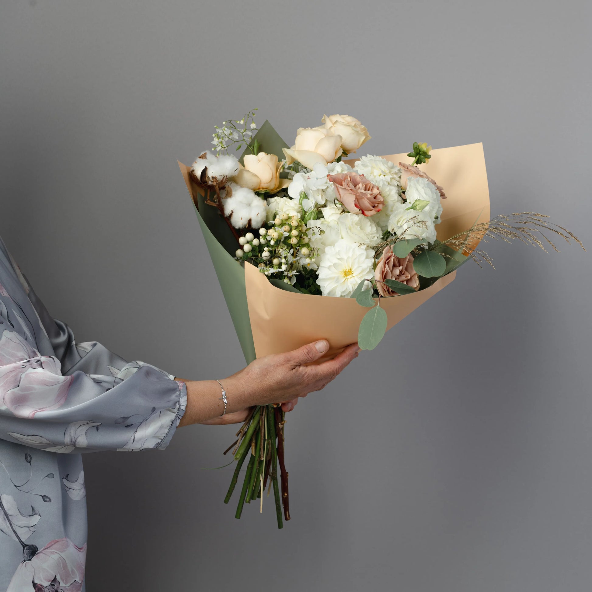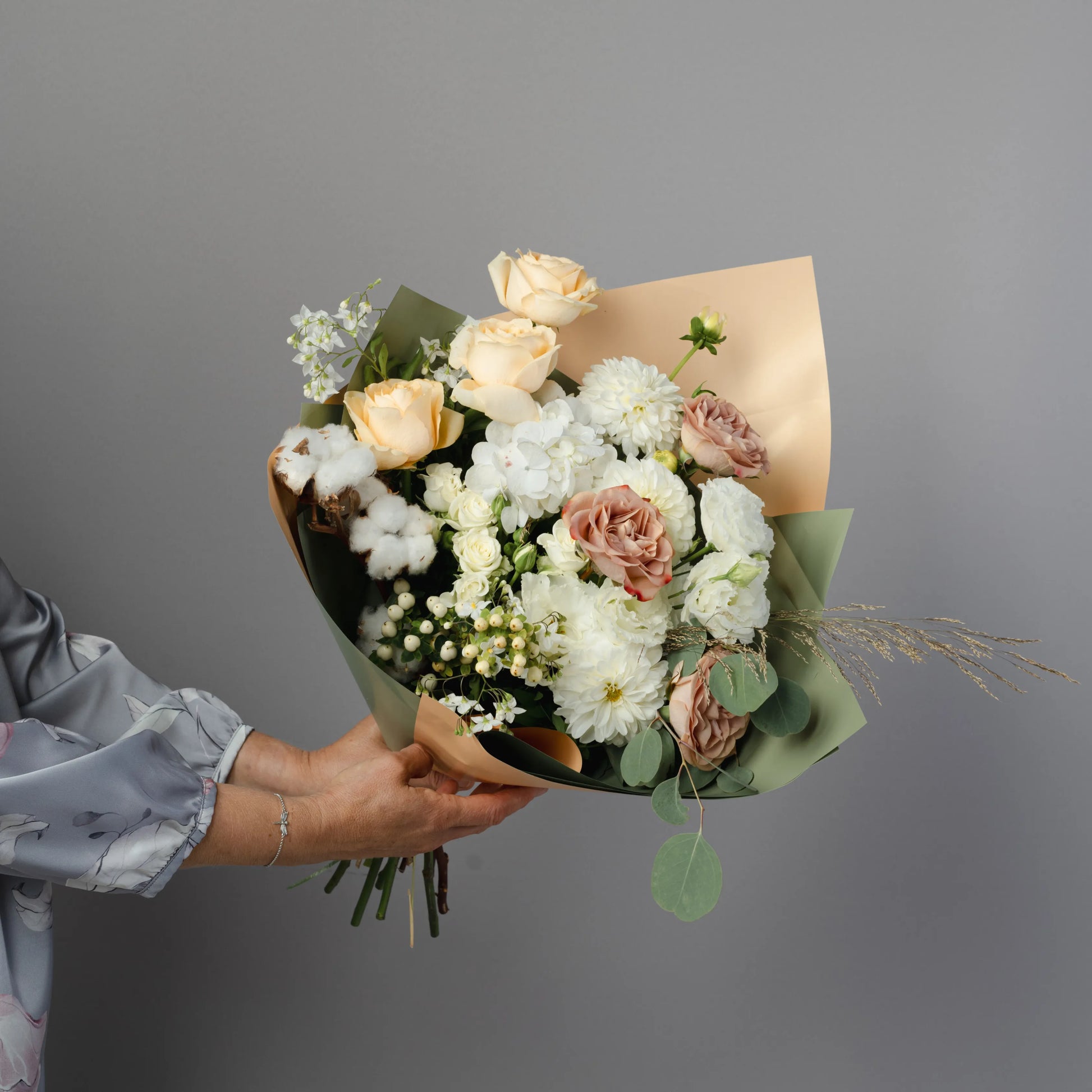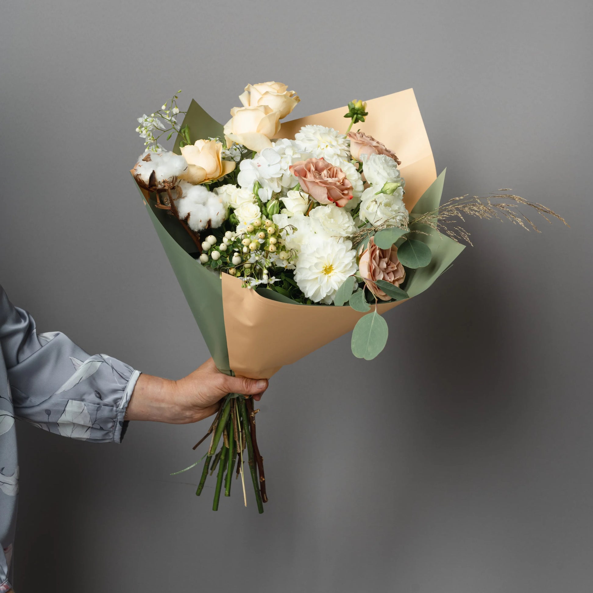 O ramo “Toque Delicado” é uma composição requintada que combina sofisticação e beleza natural. As rosas cor de creme e as rosas cor de cappuccino formam a base do ramo, enchendo-o de calor e suavidade. O lisianthus branco e os cravos brancos adicionam leveza e delicadeza, conferindo à composição um toque especial de ternura. O hipérico creme e o oxipétalo branco trazem acentos elegantes, destacando a pureza e a sofisticação do buquê. As folhas de eucalipto e o algodão adicionam elementos texturais e um charme natural ao buquê, enquanto as ervas campestres completam o visual, criando uma sensação de harmonia natural. Se desejado, o ramo pode ser embrulhado em papel cor verde-creme, realçando sua paleta natural e tornando a composição ainda mais elegante. “Toque Delicado” é a escolha ideal para quem deseja expressar os sentimentos mais sinceros e afetuosos.