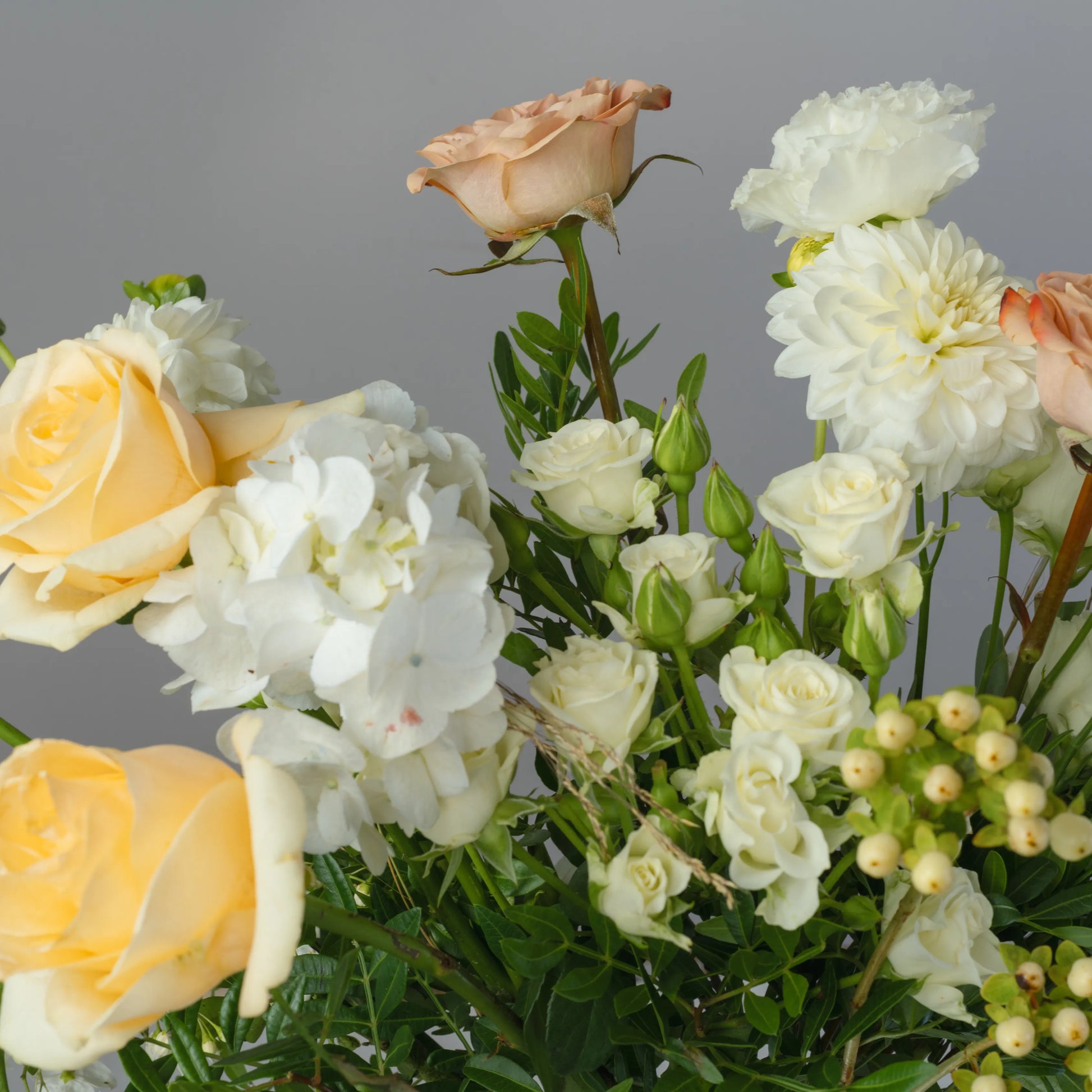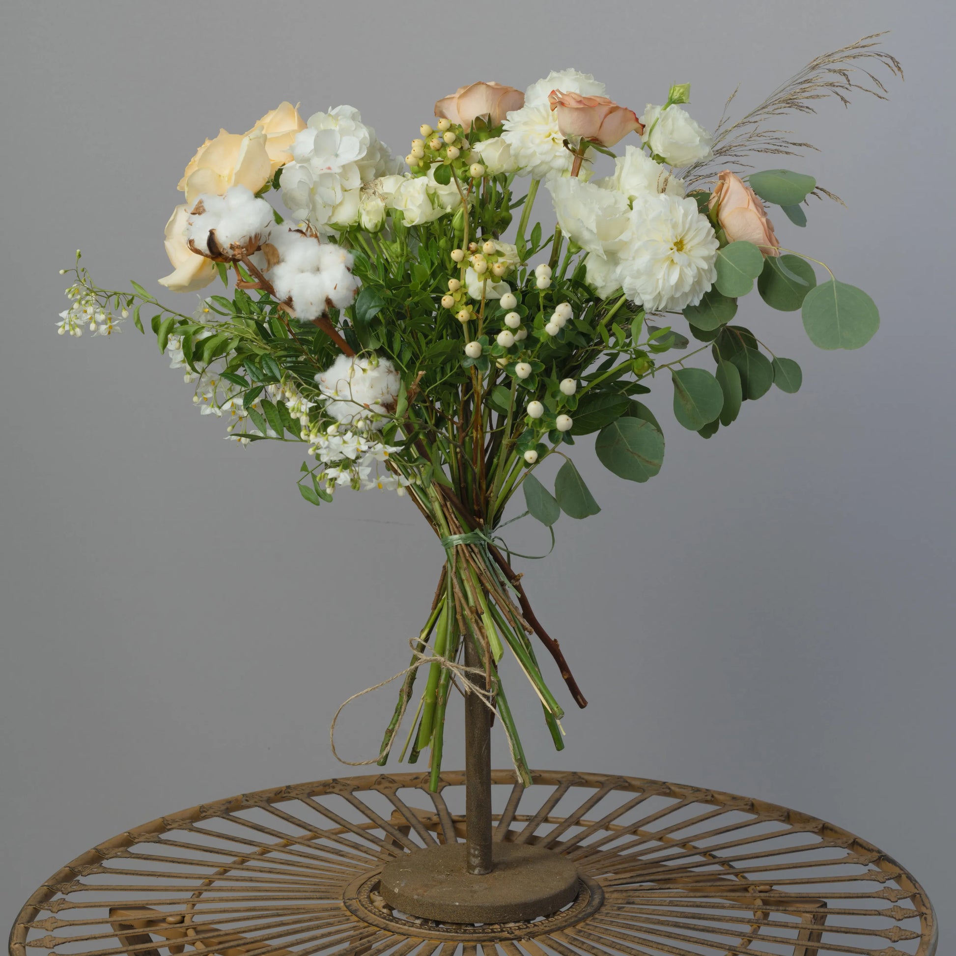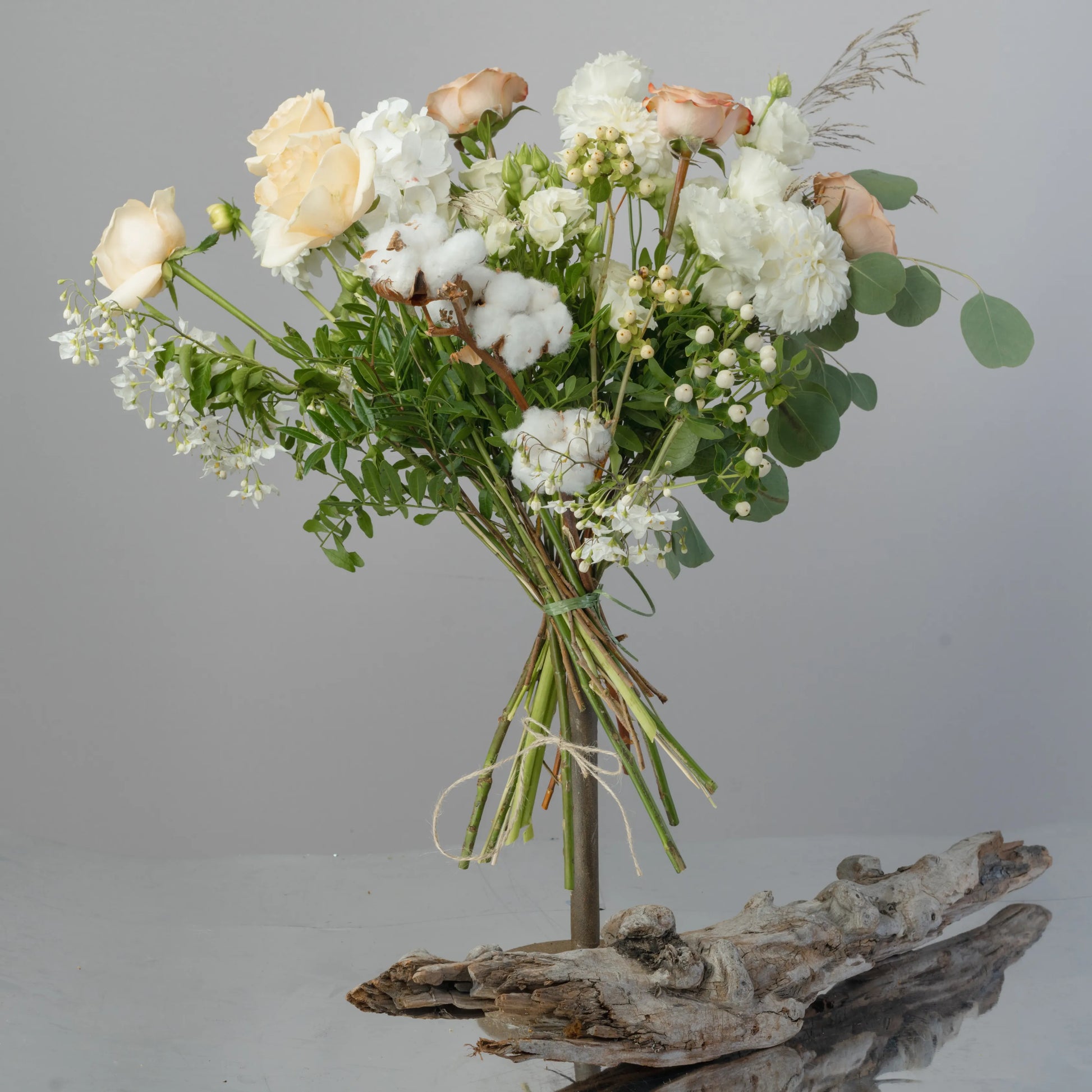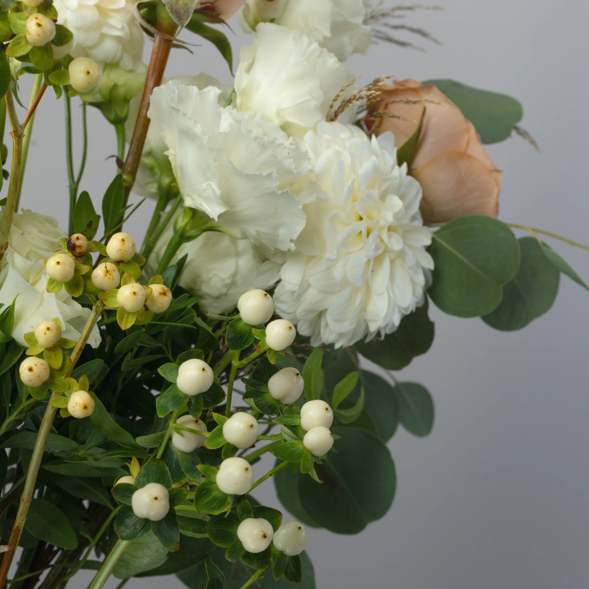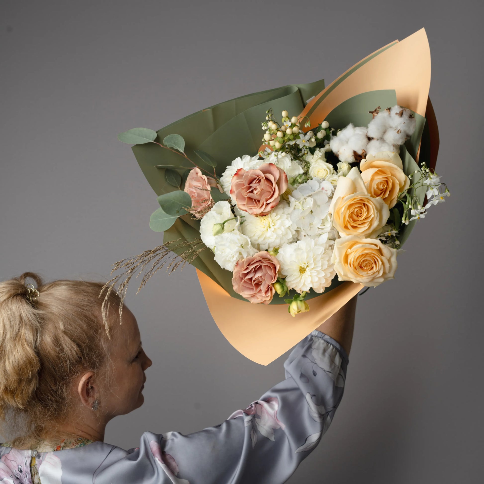 O ramo “Toque Delicado” é uma composição requintada que combina sofisticação e beleza natural. As rosas cor de creme e as rosas cor de cappuccino formam a base do ramo, enchendo-o de calor e suavidade. O lisianthus branco e os cravos brancos adicionam leveza e delicadeza, conferindo à composição um toque especial de ternura. O hipérico creme e o oxipétalo branco trazem acentos elegantes, destacando a pureza e a sofisticação do buquê. As folhas de eucalipto e o algodão adicionam elementos texturais e um charme natural ao buquê, enquanto as ervas campestres completam o visual, criando uma sensação de harmonia natural. Se desejado, o ramo pode ser embrulhado em papel cor verde-creme, realçando sua paleta natural e tornando a composição ainda mais elegante. “Toque Delicado” é a escolha ideal para quem deseja expressar os sentimentos mais sinceros e afetuosos.