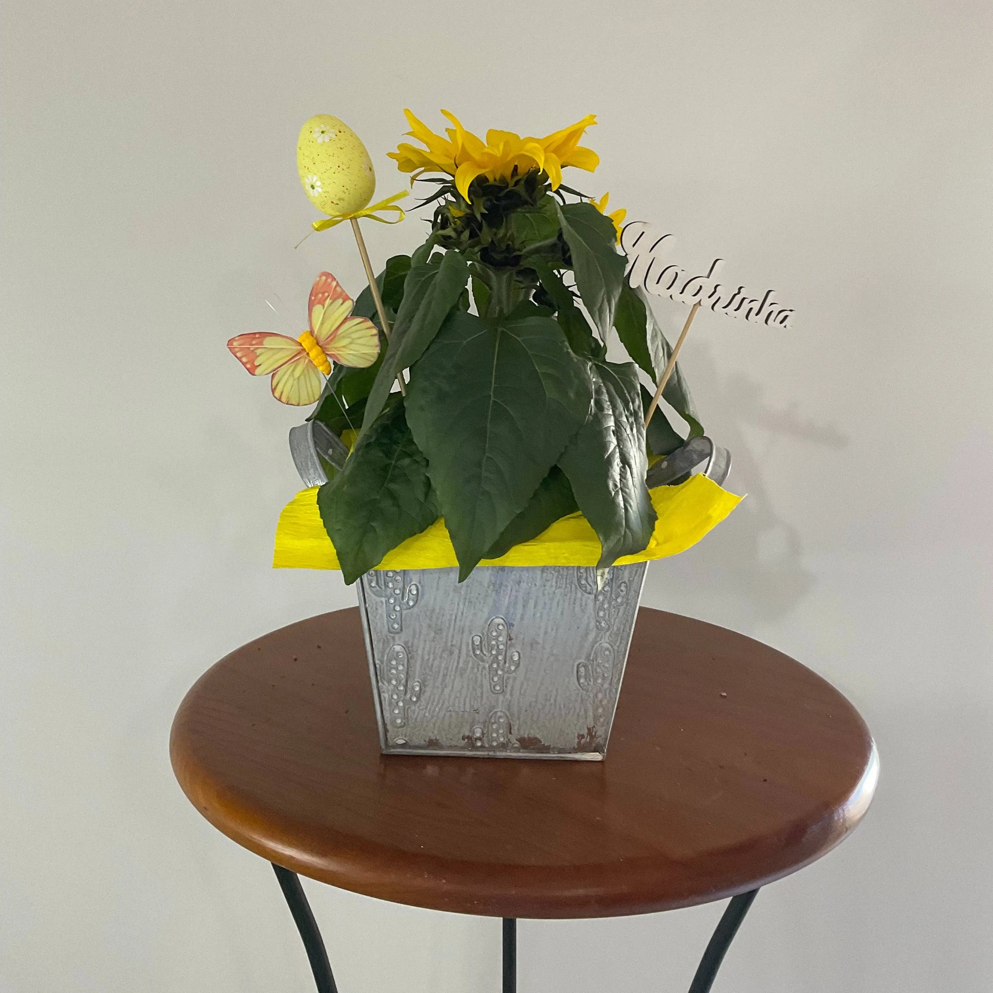 O girassol, símbolo de positividade e calor, é o protagonista desta composição, que é complementada por um sofisticado cesto em material de latão de tom cinza brilhante, conferindo um toque moderno e refinado. Perfeito para dar vida a espaços interiores, seja em casa ou no escritório, este arranjo transmite uma sensação acolhedora e vibrante, refletindo a beleza natural e a energia solar. Uma peça única que combina a exuberância da flor com a simplicidade elegante do design contemporâneo.