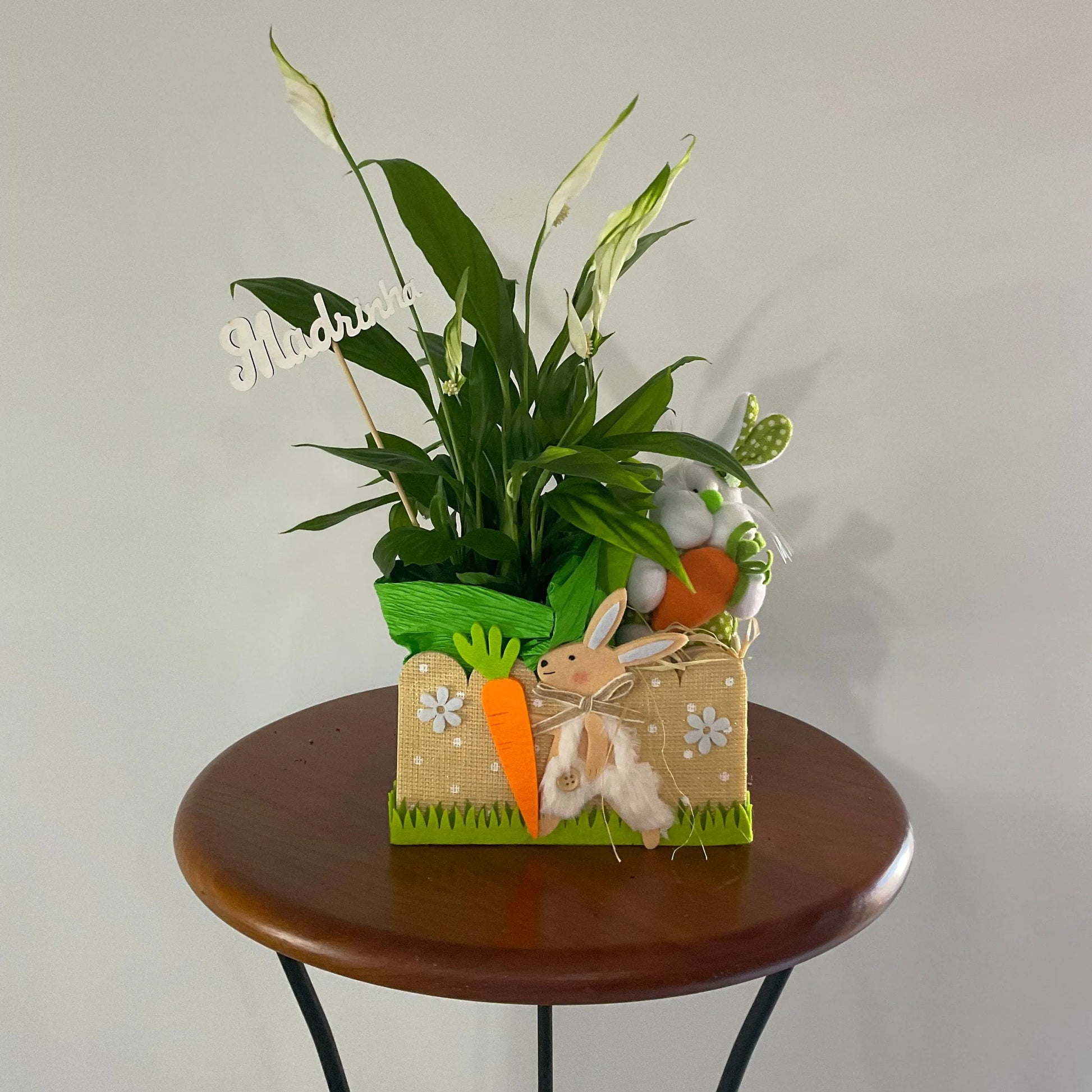 Uma verdadeira celebração da Páscoa e da primavera! Esta caixa forrada em tecido, com a delicada aplicação de um coelhinho e uma cenoura, guarda no seu interior um lírio elegante e perfumado — símbolo de renovação, pureza e beleza natural.