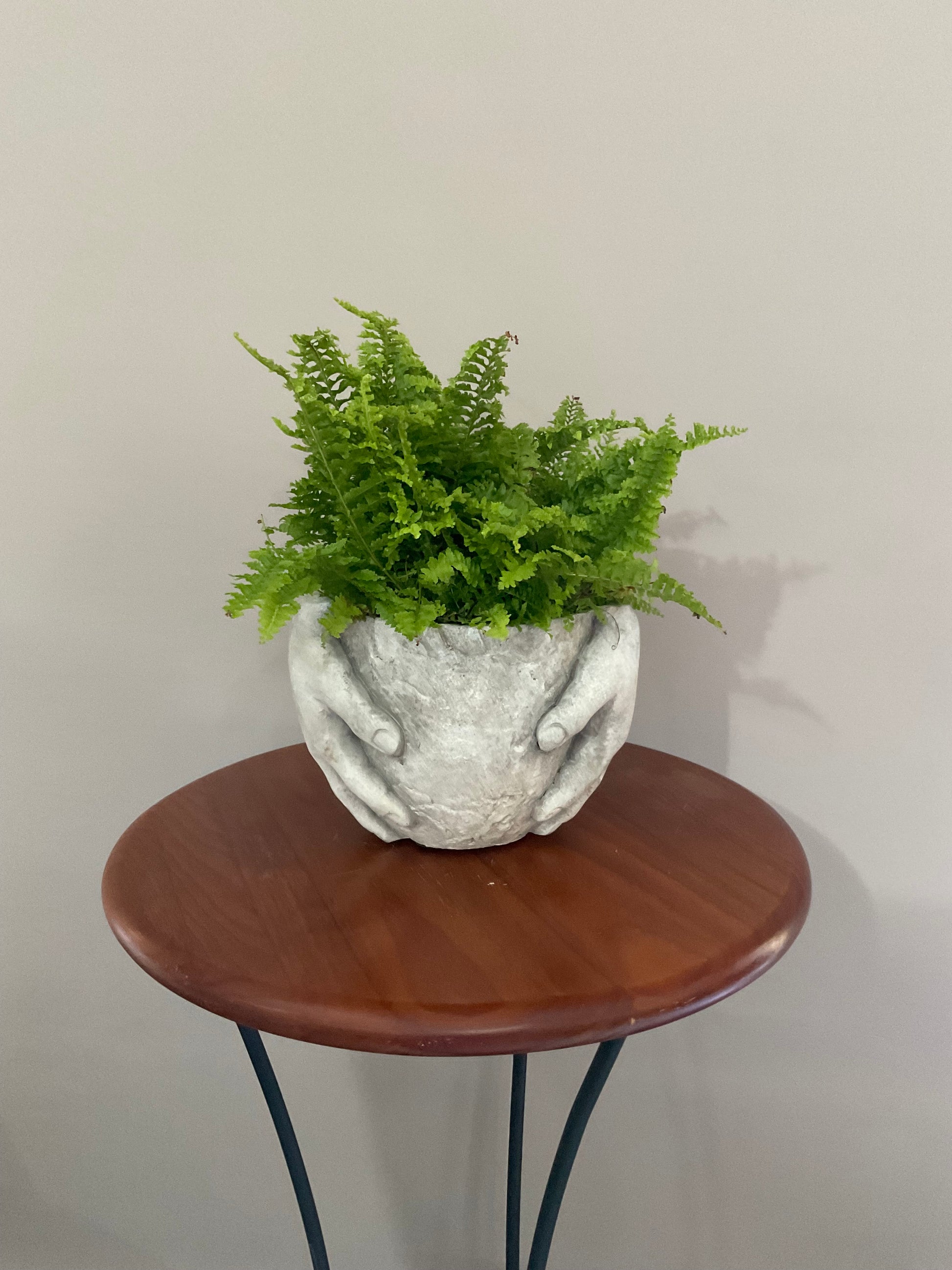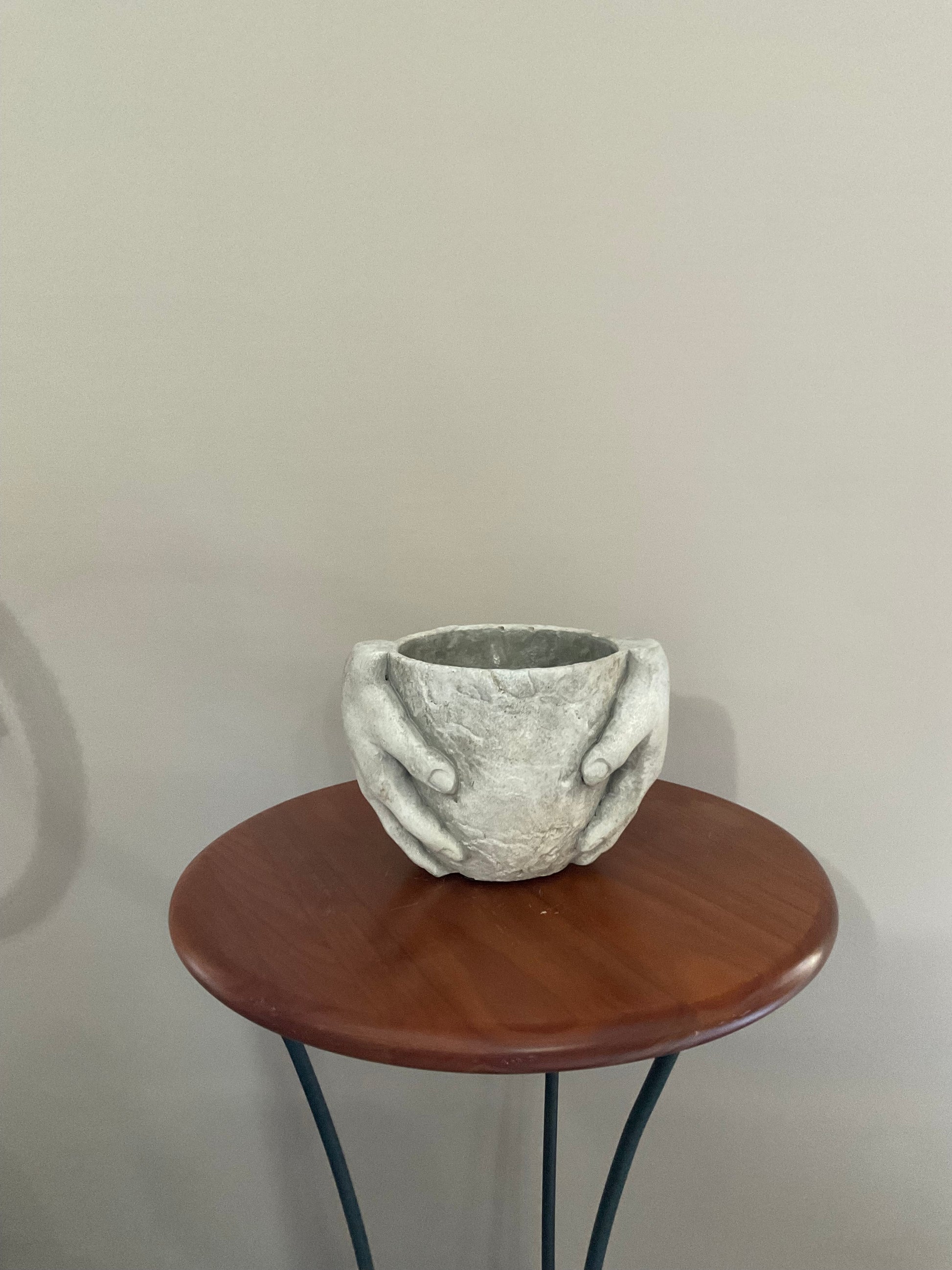 Uma peça escultural que combina design contemporâneo com simbolismo delicado. Este vaso de cerâmica com acabamento que imita betão representa duas mãos entrelaçadas a segurar um pequeno vaso, como se oferecessem a natureza em gesto de cuidado e contemplação.