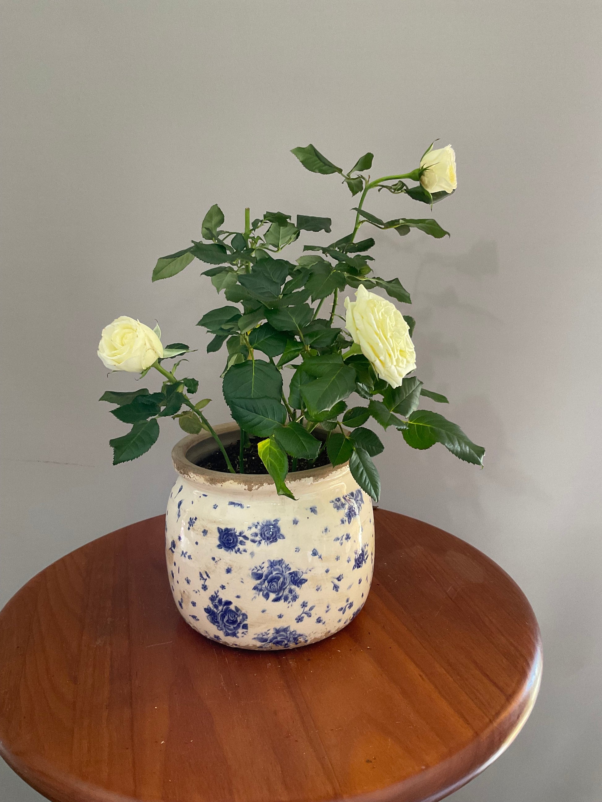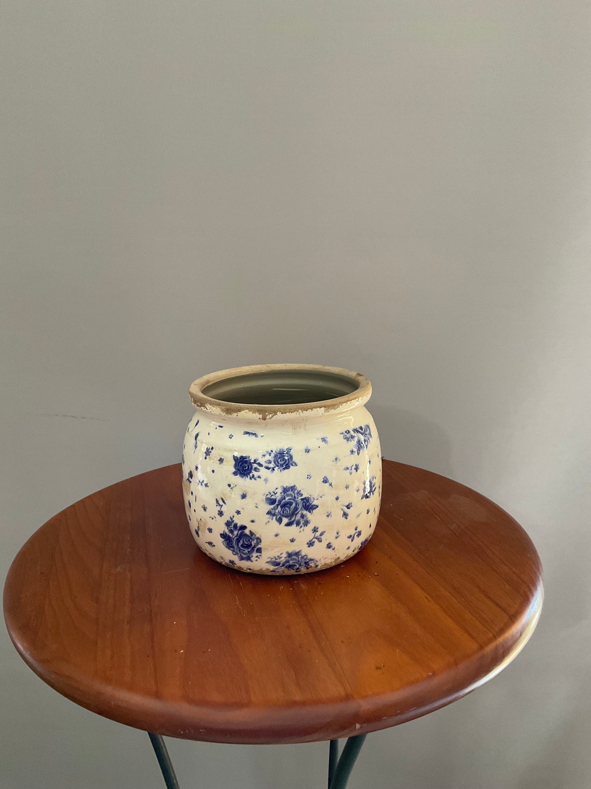 Vaso de Cerâmica Estilo Vintage – Branco Envelhecido com Flores Azul-Escuro